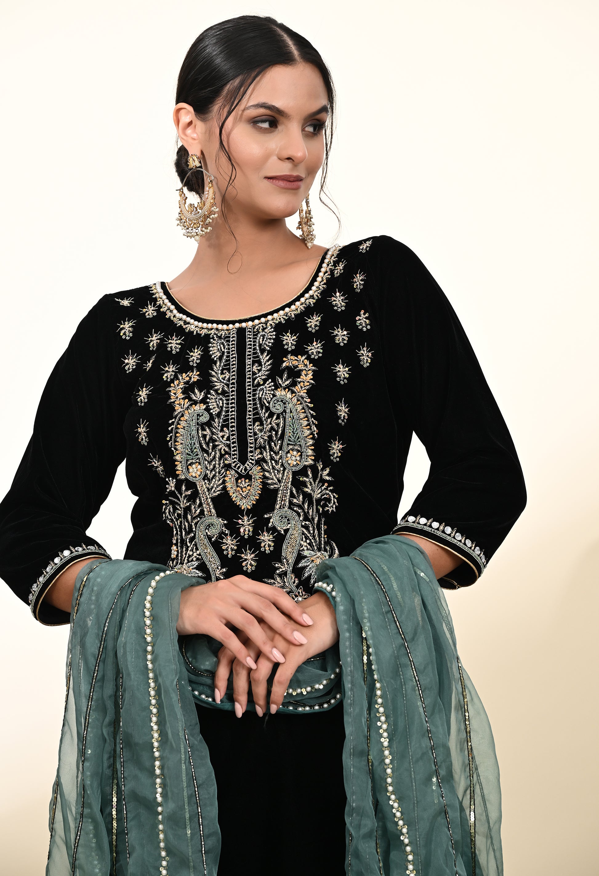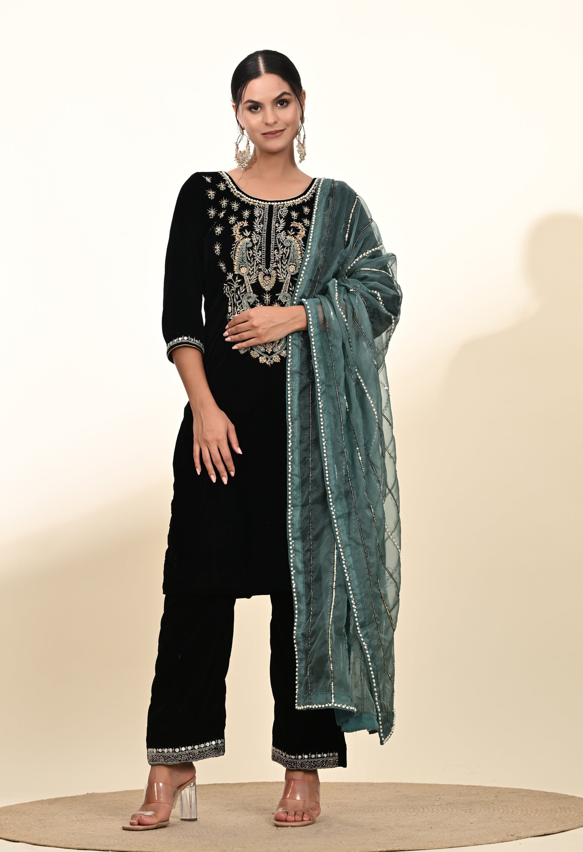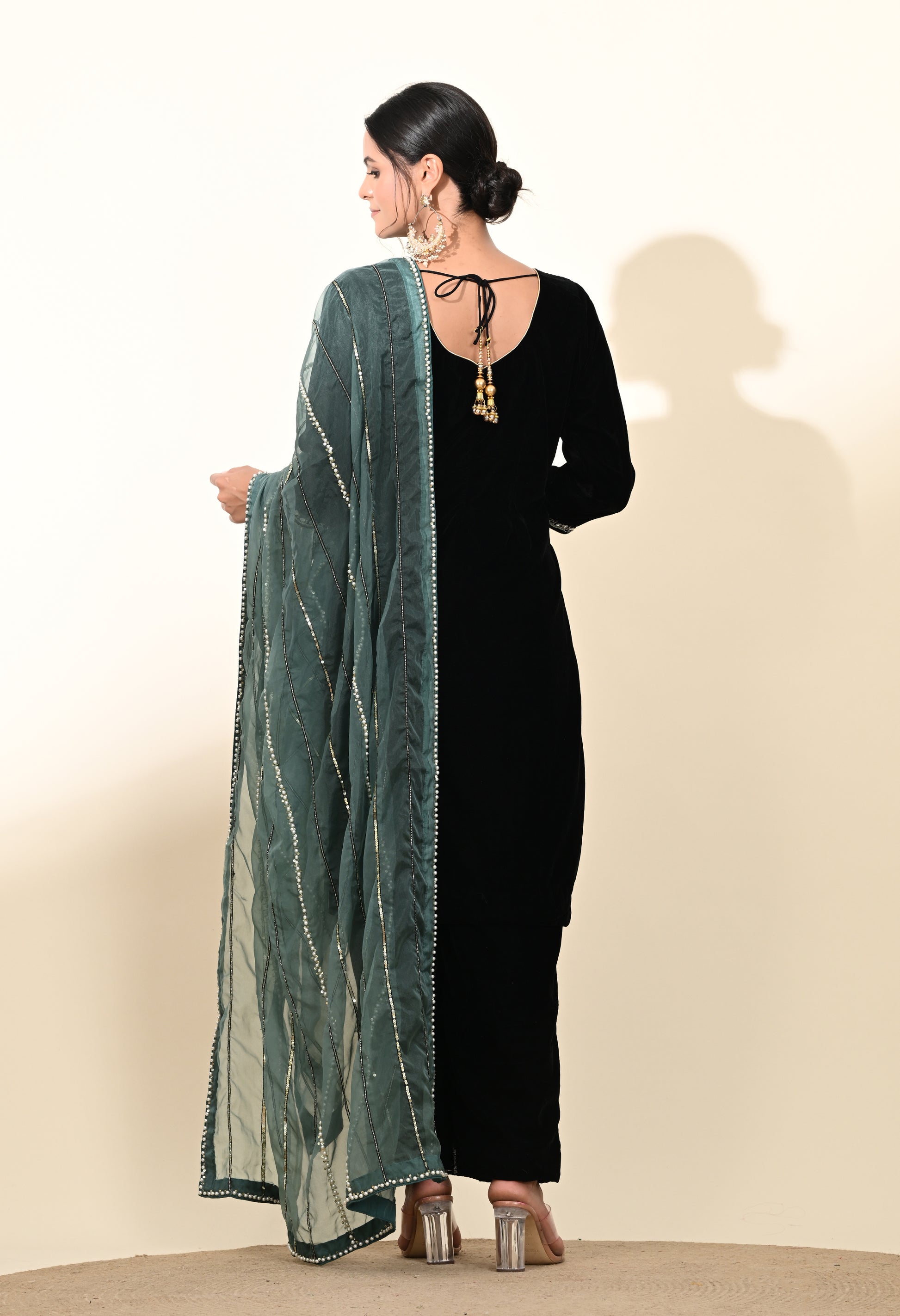 Indulge in a royal experience with our elegant black Kurta Set. The ensemble features a lush velvet kurta, straight-leg pants, and a flowy organza dupatta, intricately decorated with zardozi, thread, and pearl work. This masterpiece highlights your poise and adds a touch of luxury to your look.