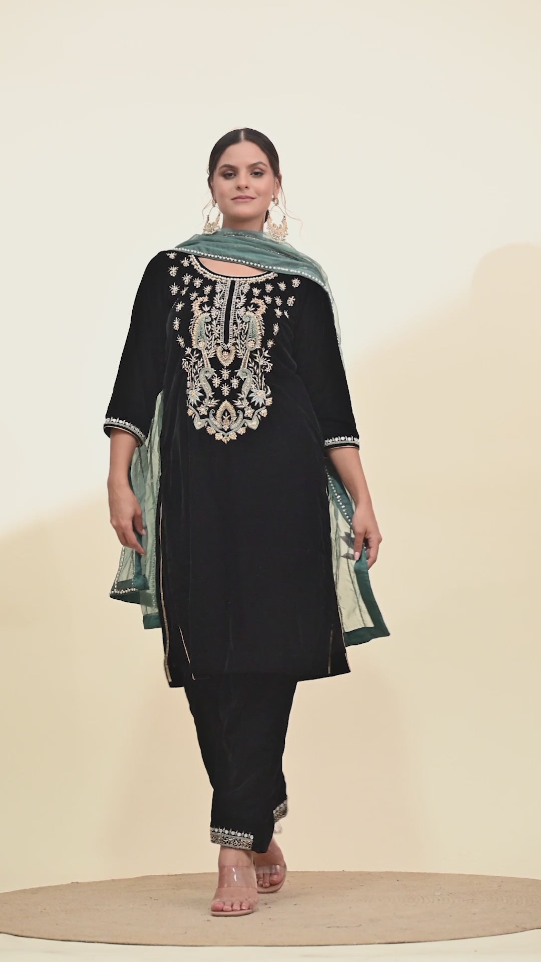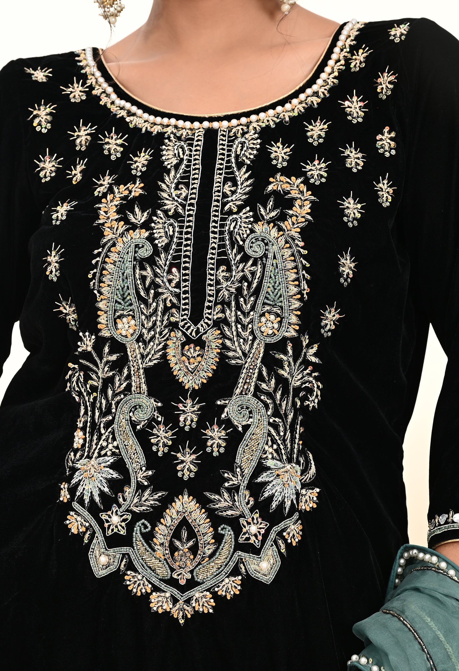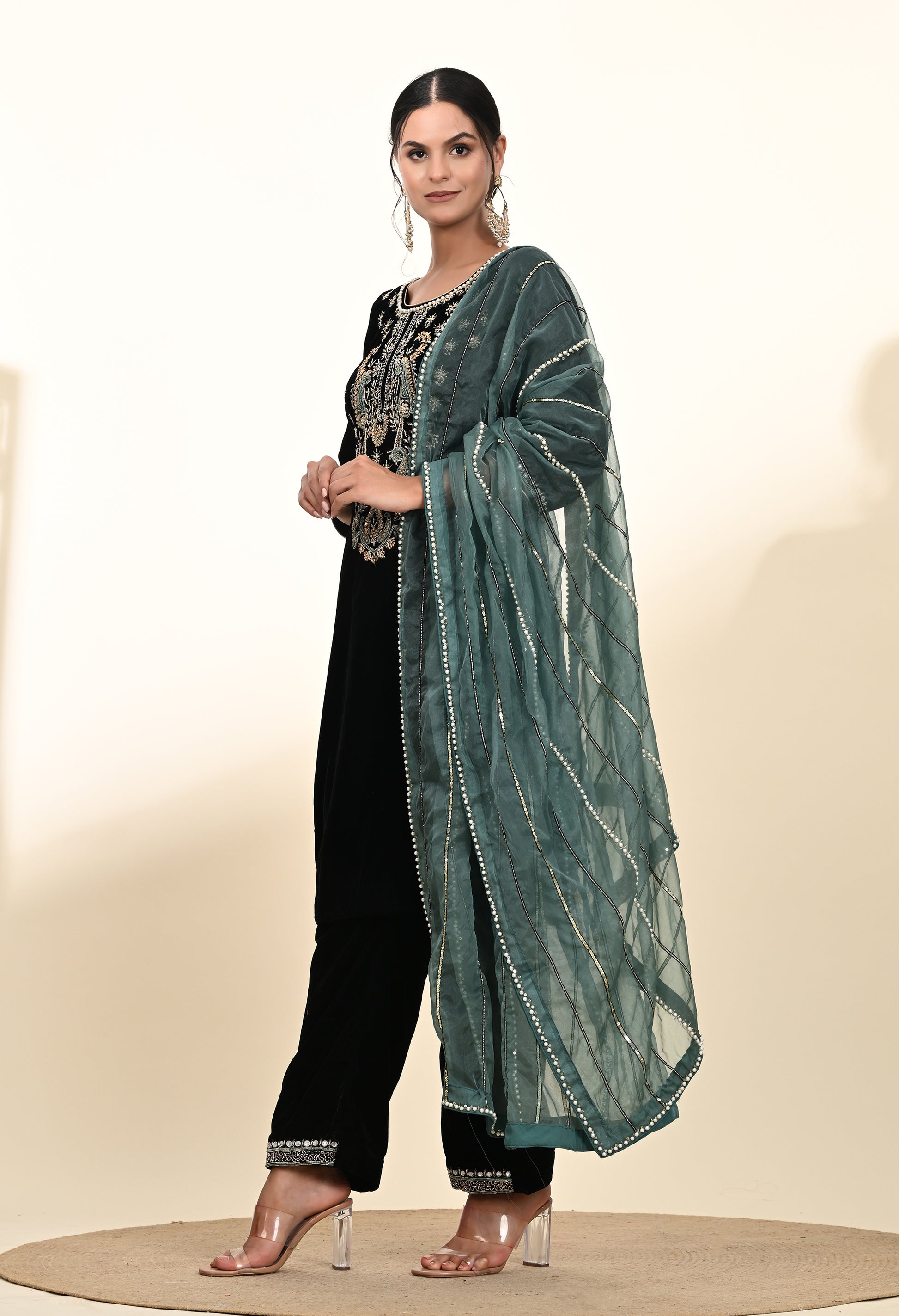 Indulge in a royal experience with our elegant black Kurta Set. The ensemble features a lush velvet kurta, straight-leg pants, and a flowy organza dupatta, intricately decorated with zardozi, thread, and pearl work. This masterpiece highlights your poise and adds a touch of luxury to your look.