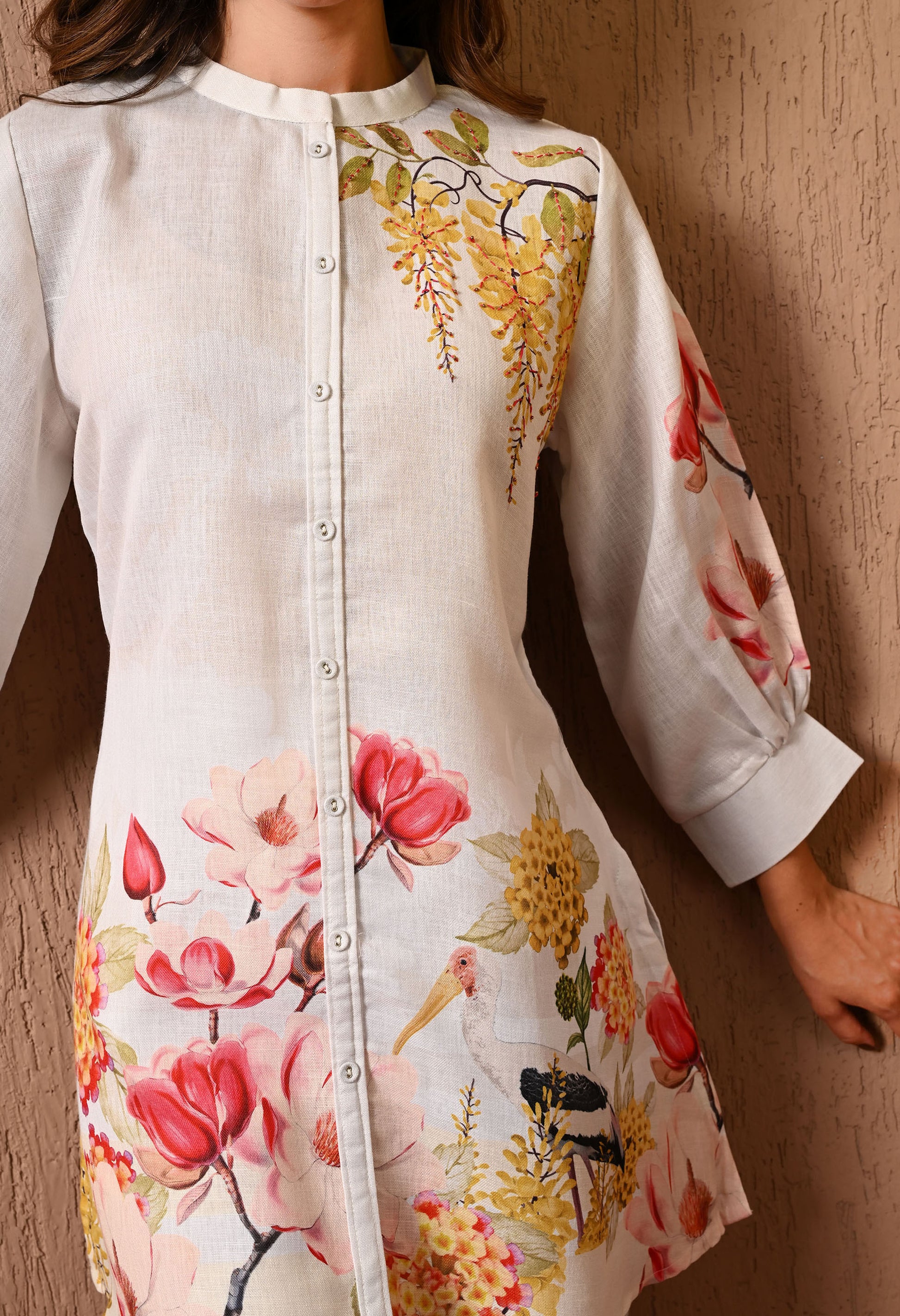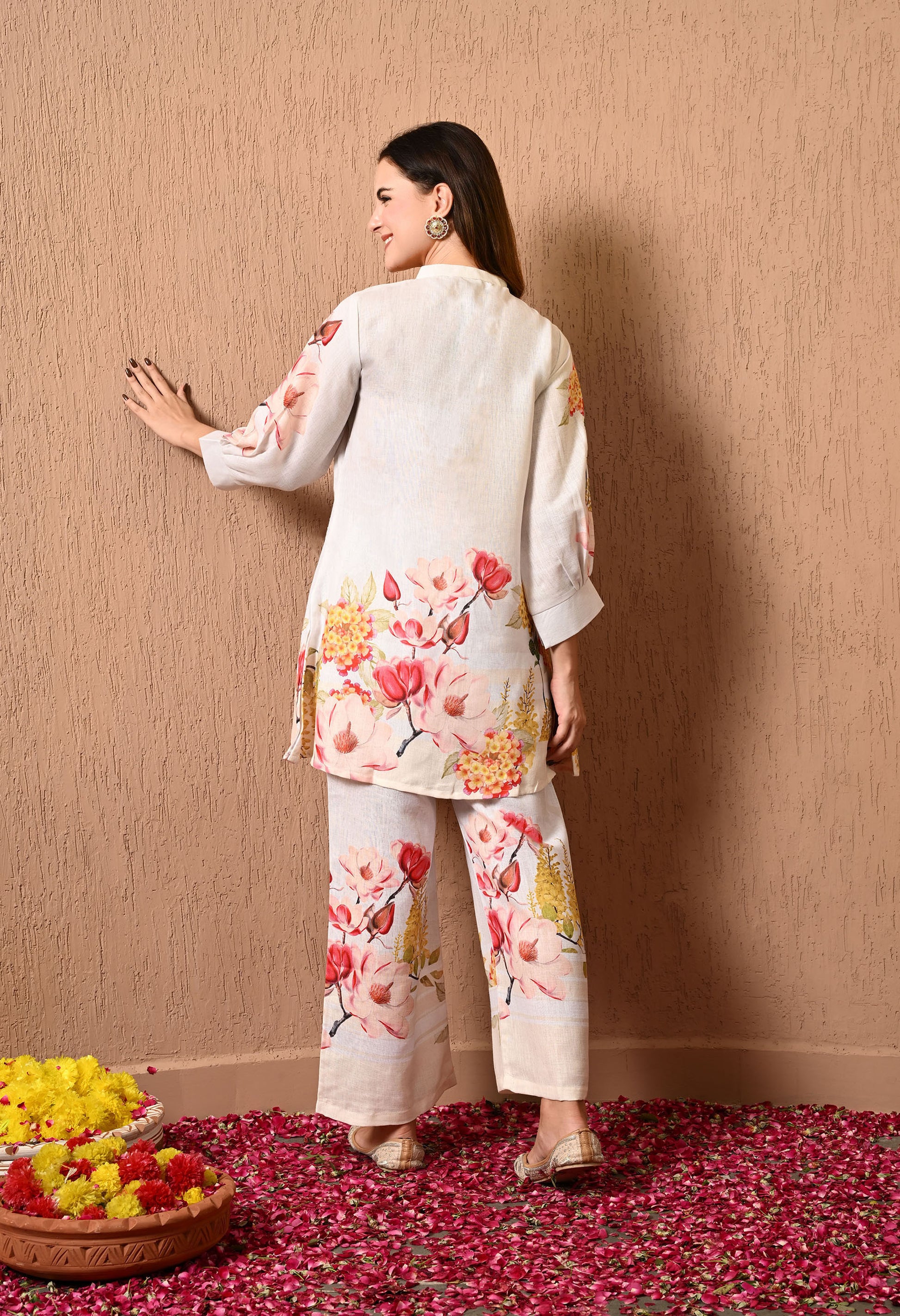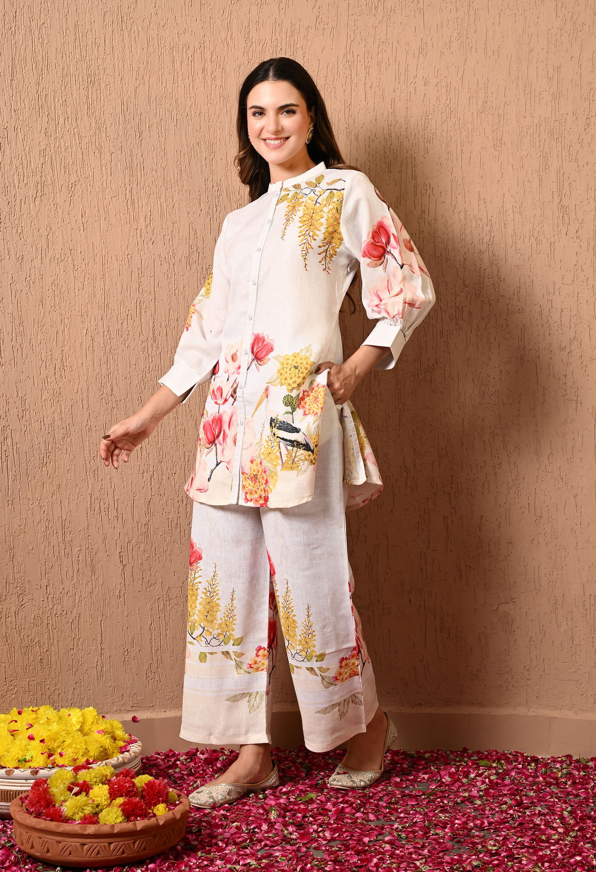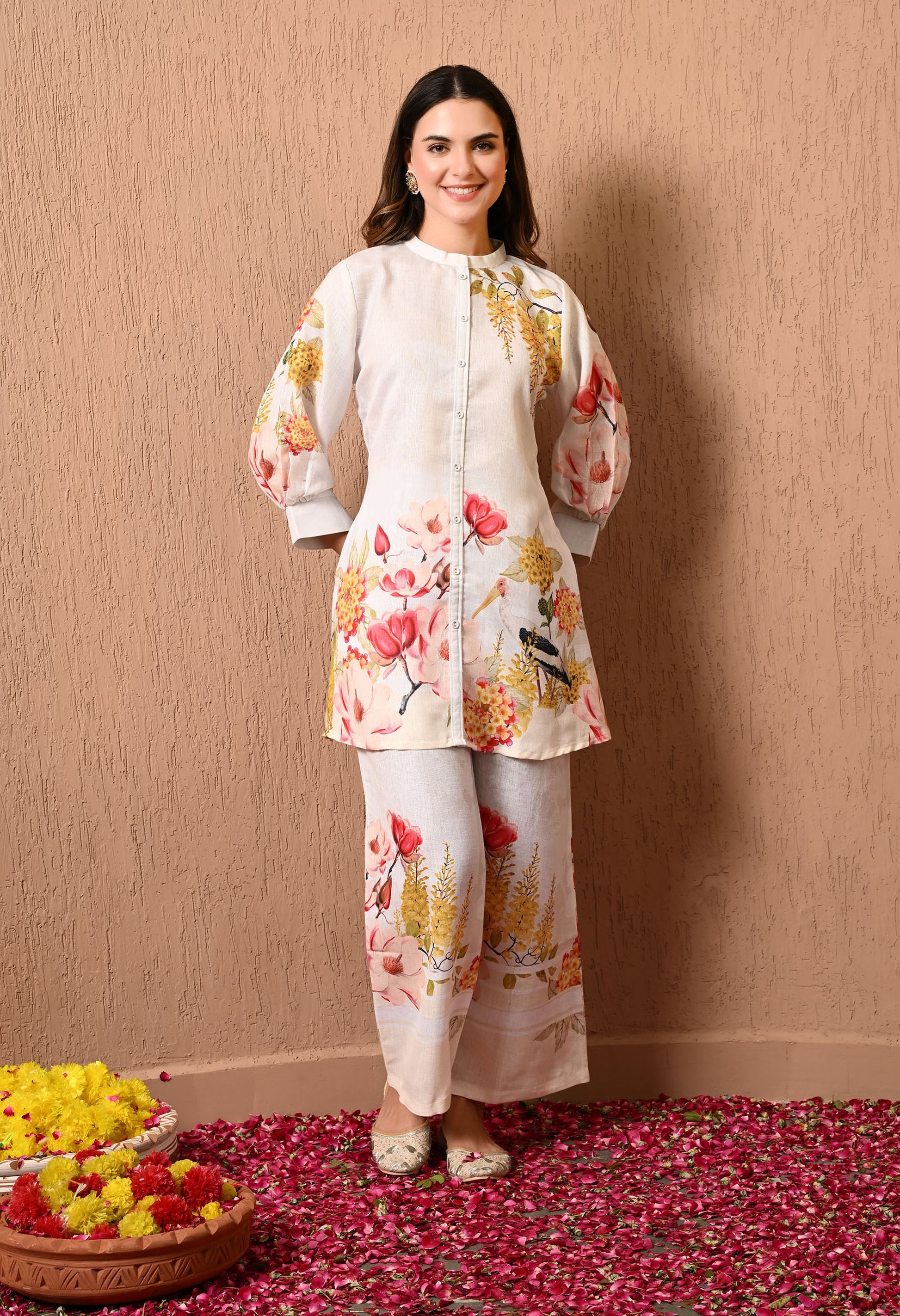 Grace your festivities with our stunning cream Co-ord Set, styled with a nicely detailed and light cotton top and bottom The intricate floral prints on the top and bottom work reflects classic beauty.
