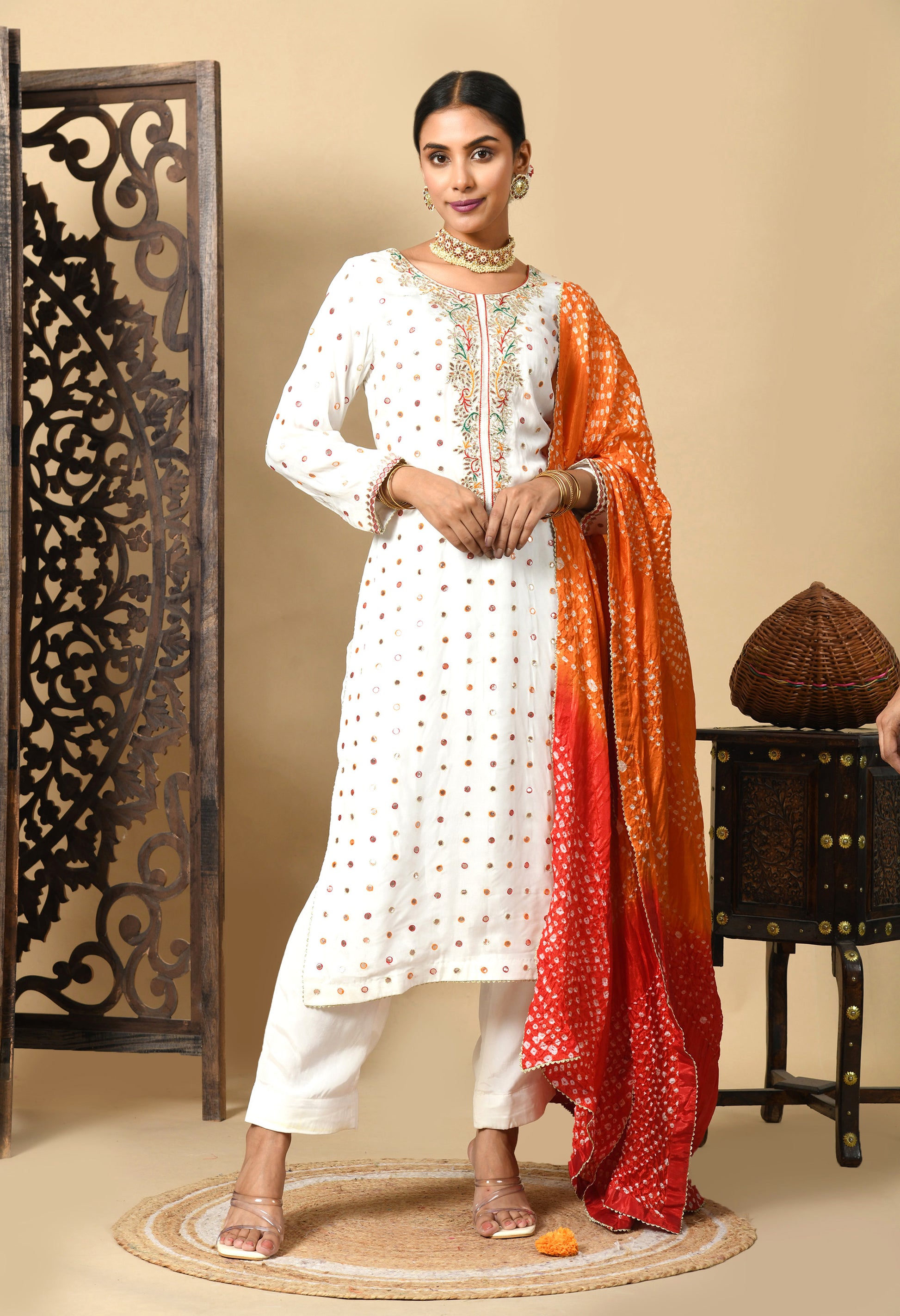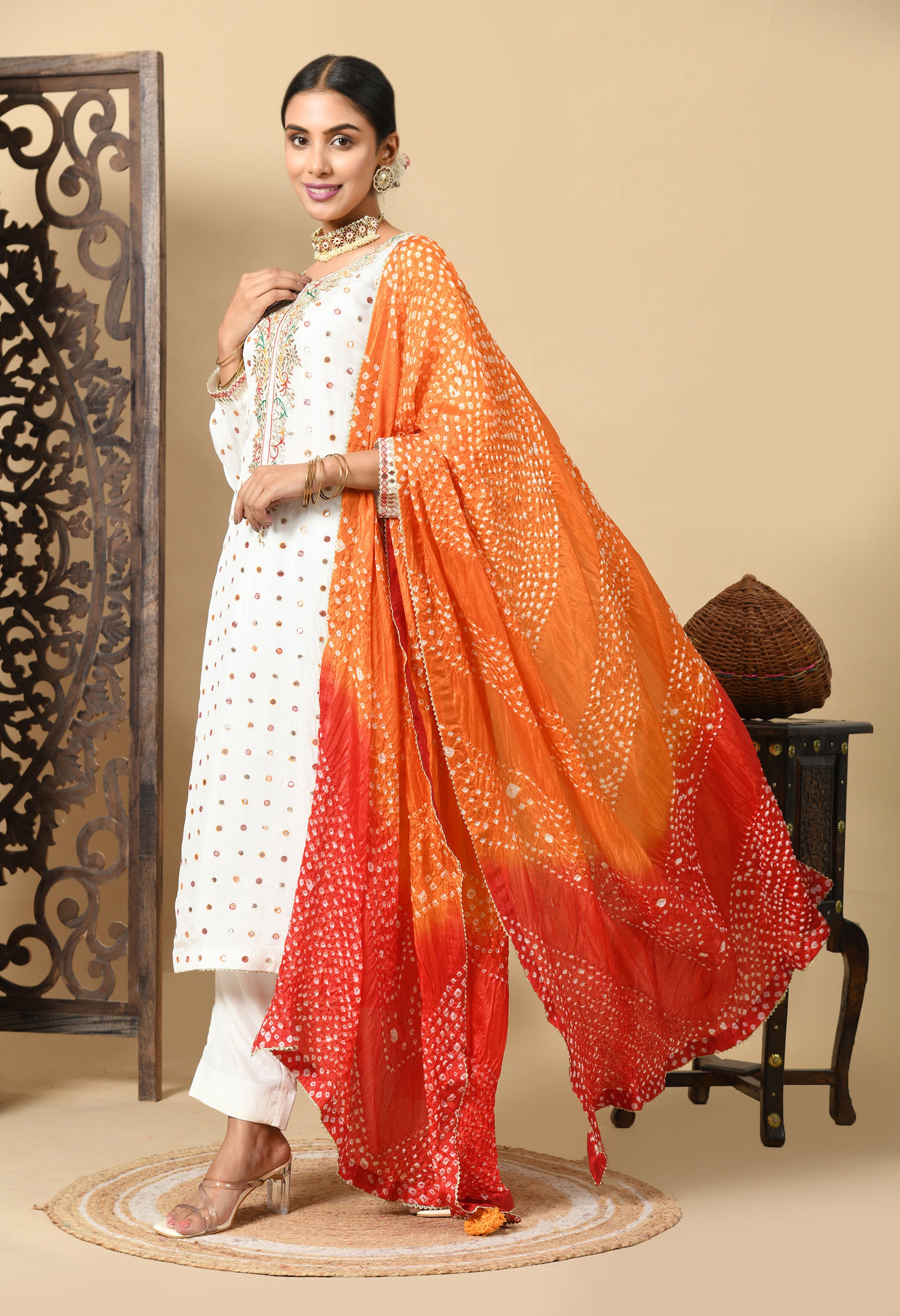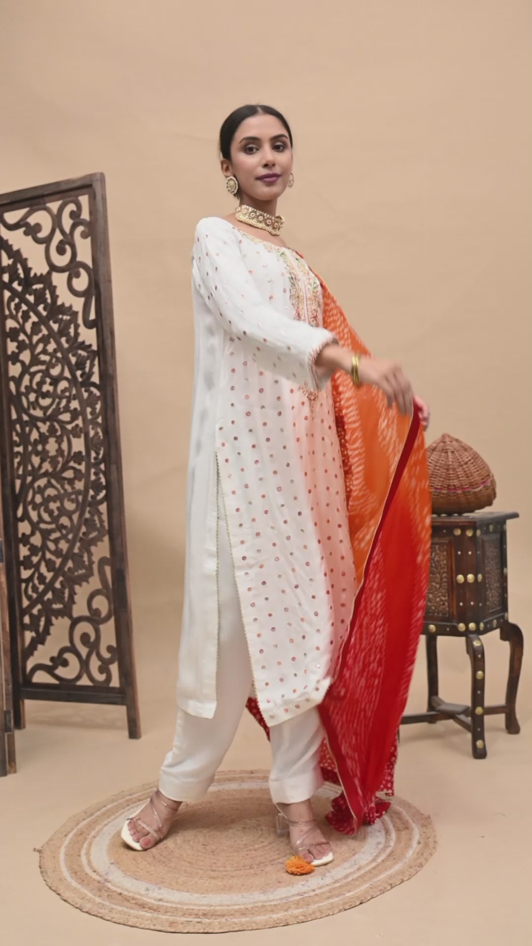 Step into sophistication with our cream Kurta Set, featuring a light silk dupatta, an intricately designed crepe kurta, and a coordinating crepe bottom. The exquisite gota patti, thread, and mirror work give it a regal appeal.