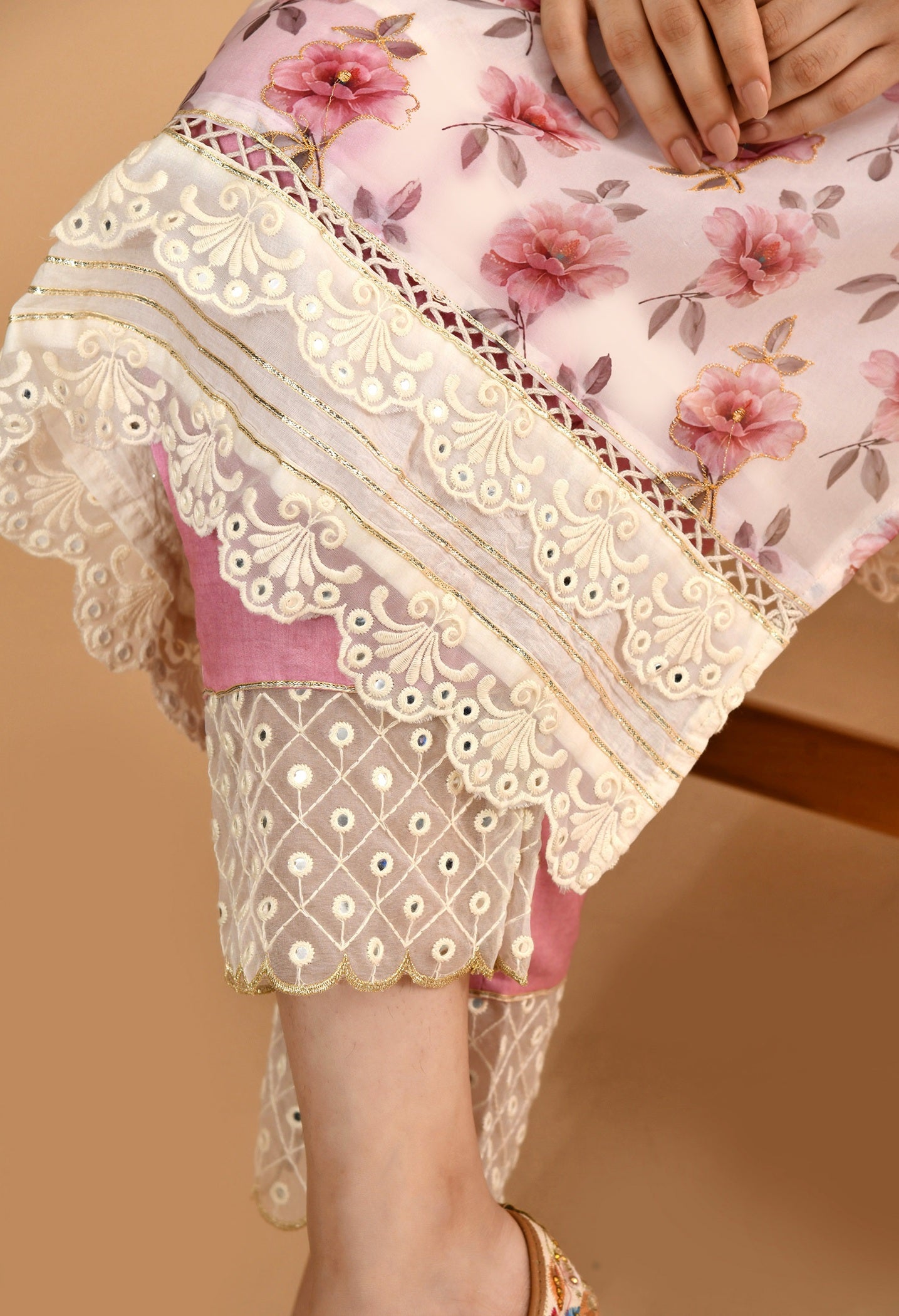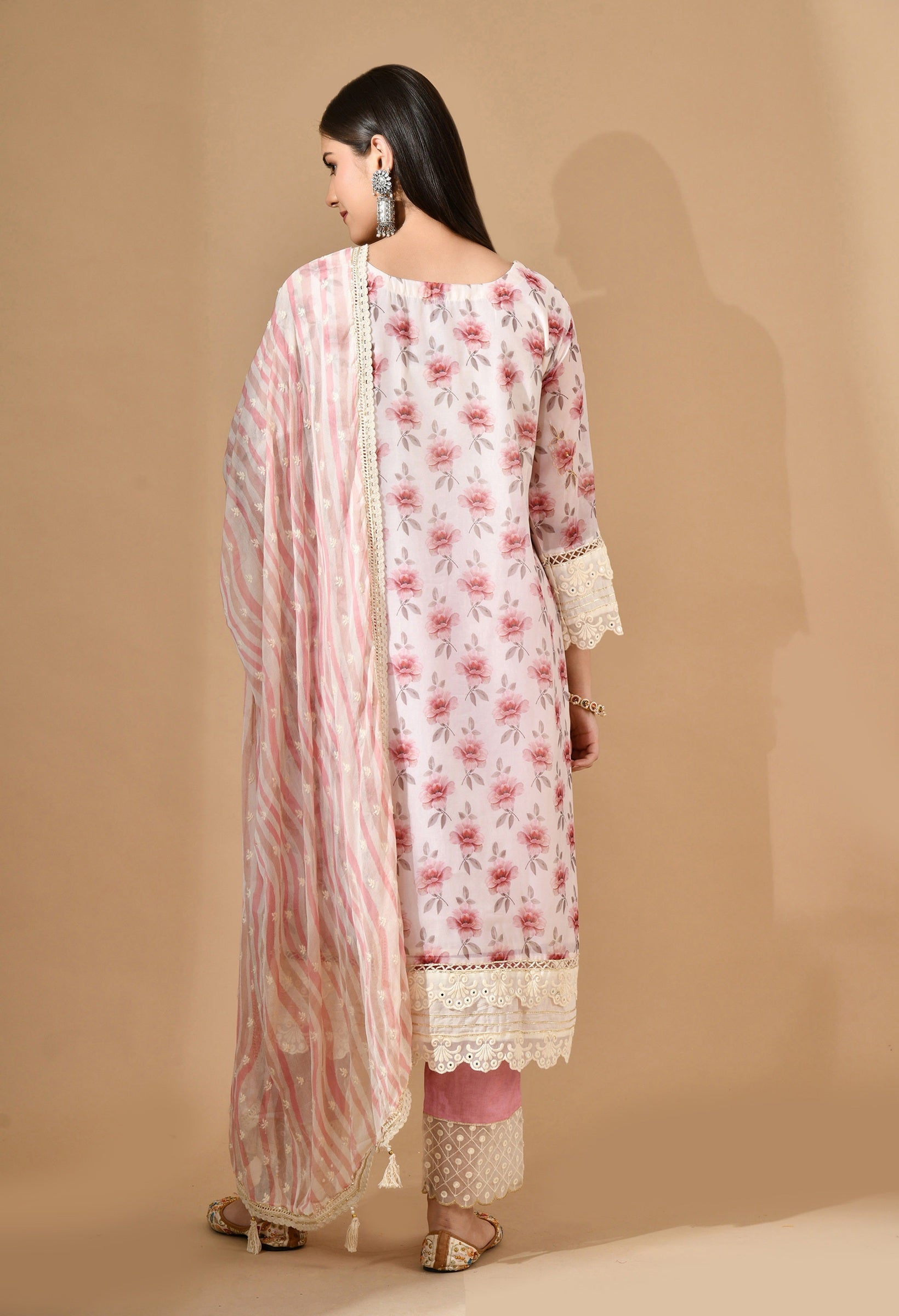 Step into elegance with this cream organza kurta set adorned with thread and mirror work. Comes with chiffon dupatta and cotton silk pants. Tailored fit. Customisable. Dry-clean only.