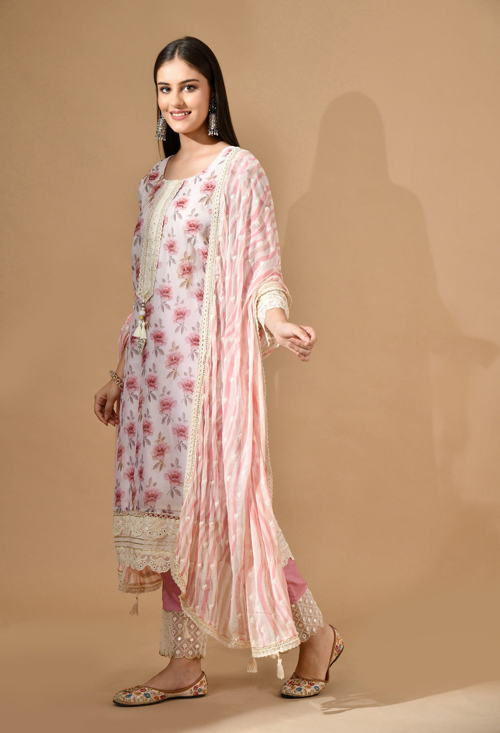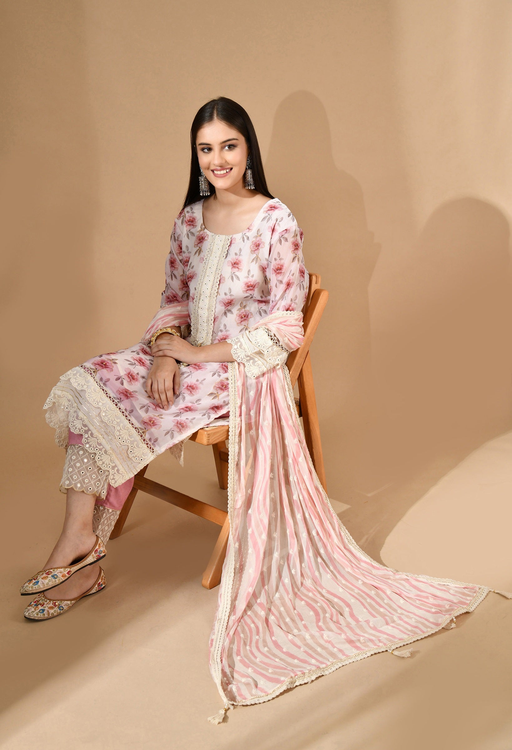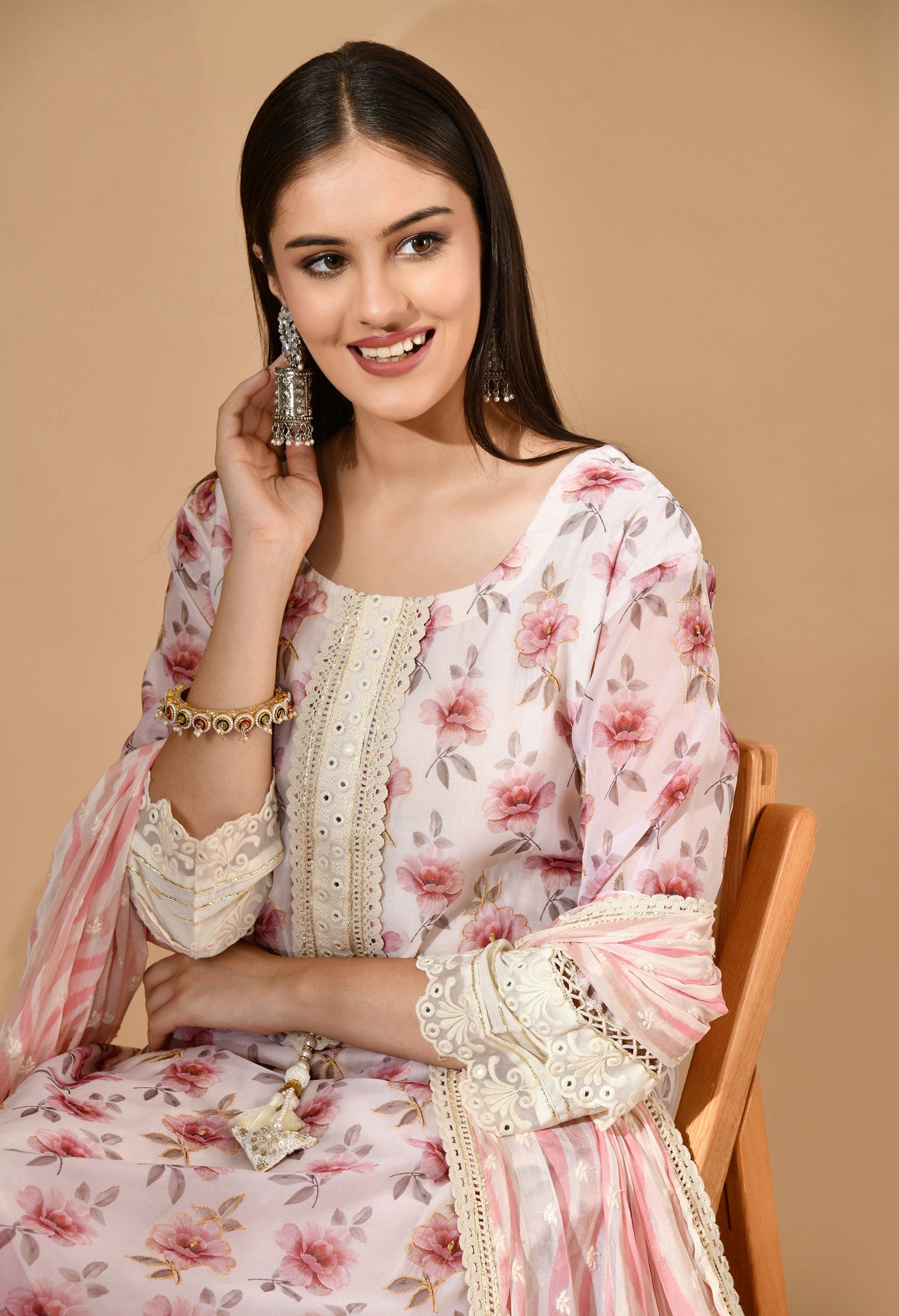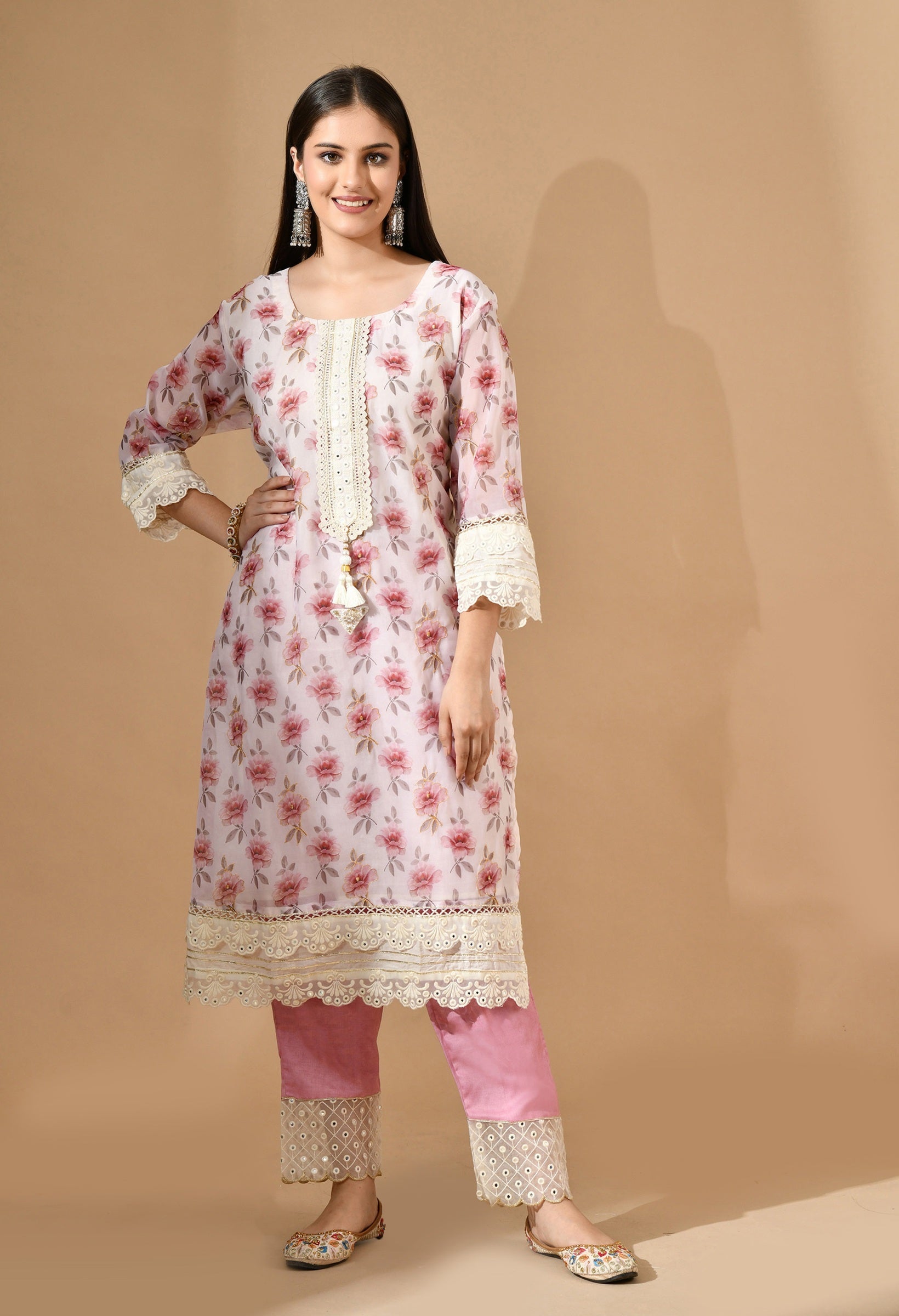- A soft celebration of grace, this cream kurta set features delicate thread and mirror embroidery on airy organza.