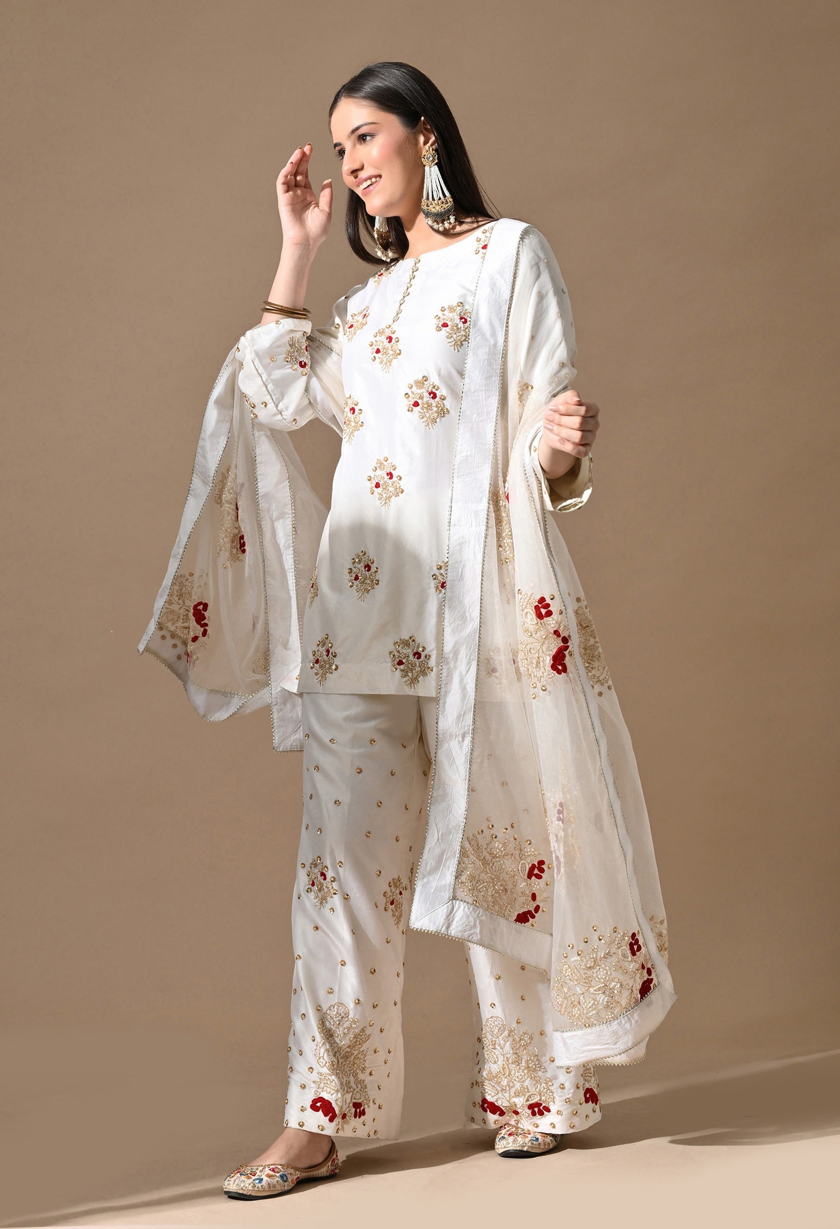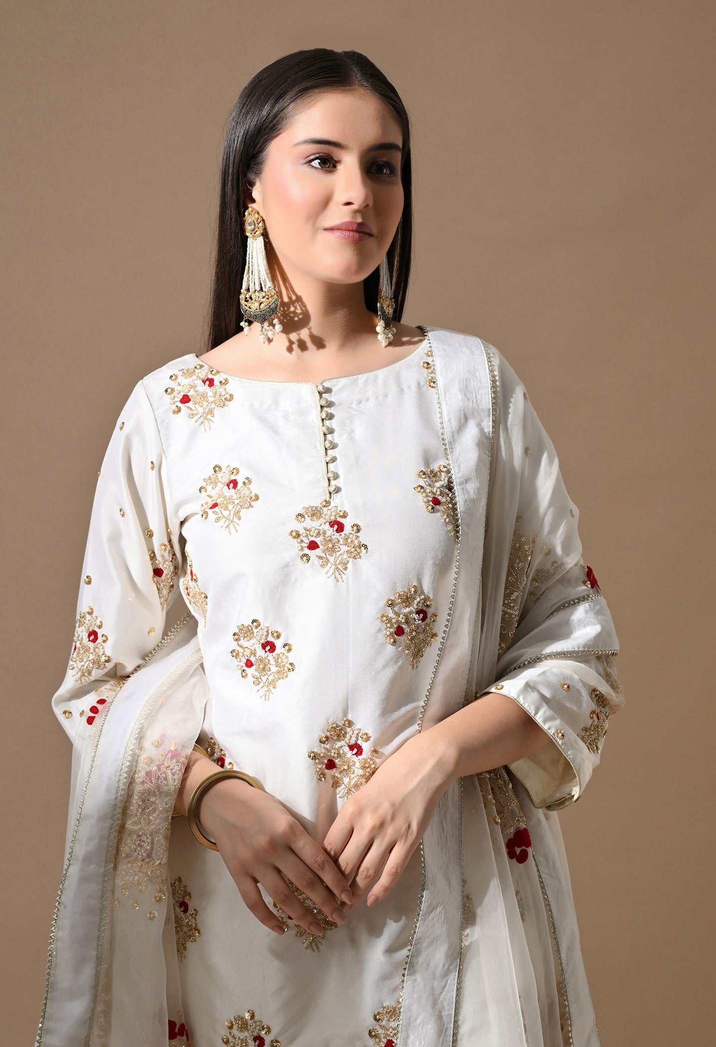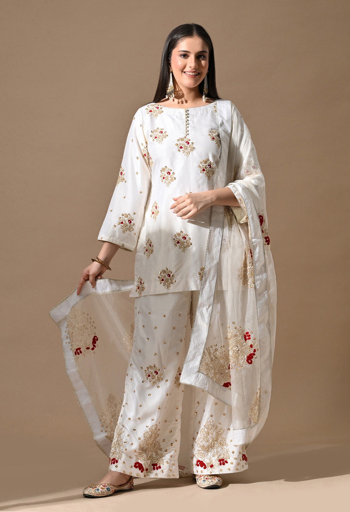Embrace timeless elegance in this cream silk kurta set. Hand-embroidered with zardozi, pearls, and sequins, it’s paired with a soft organza dupatta and flared plazo. Tailored fit. Customisable. Dry-clean only.