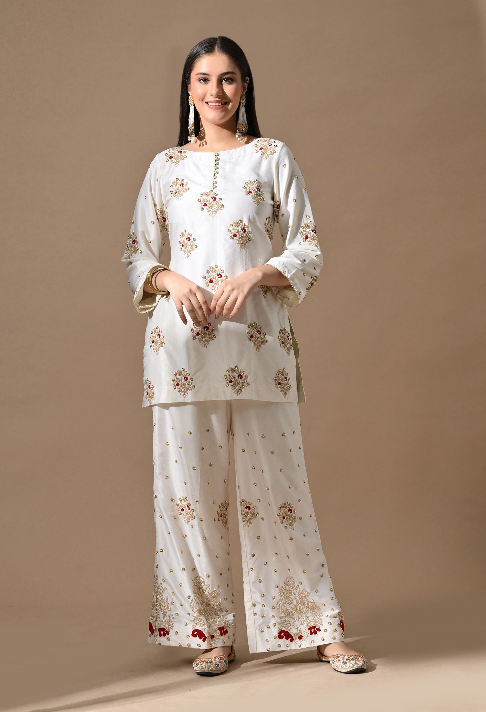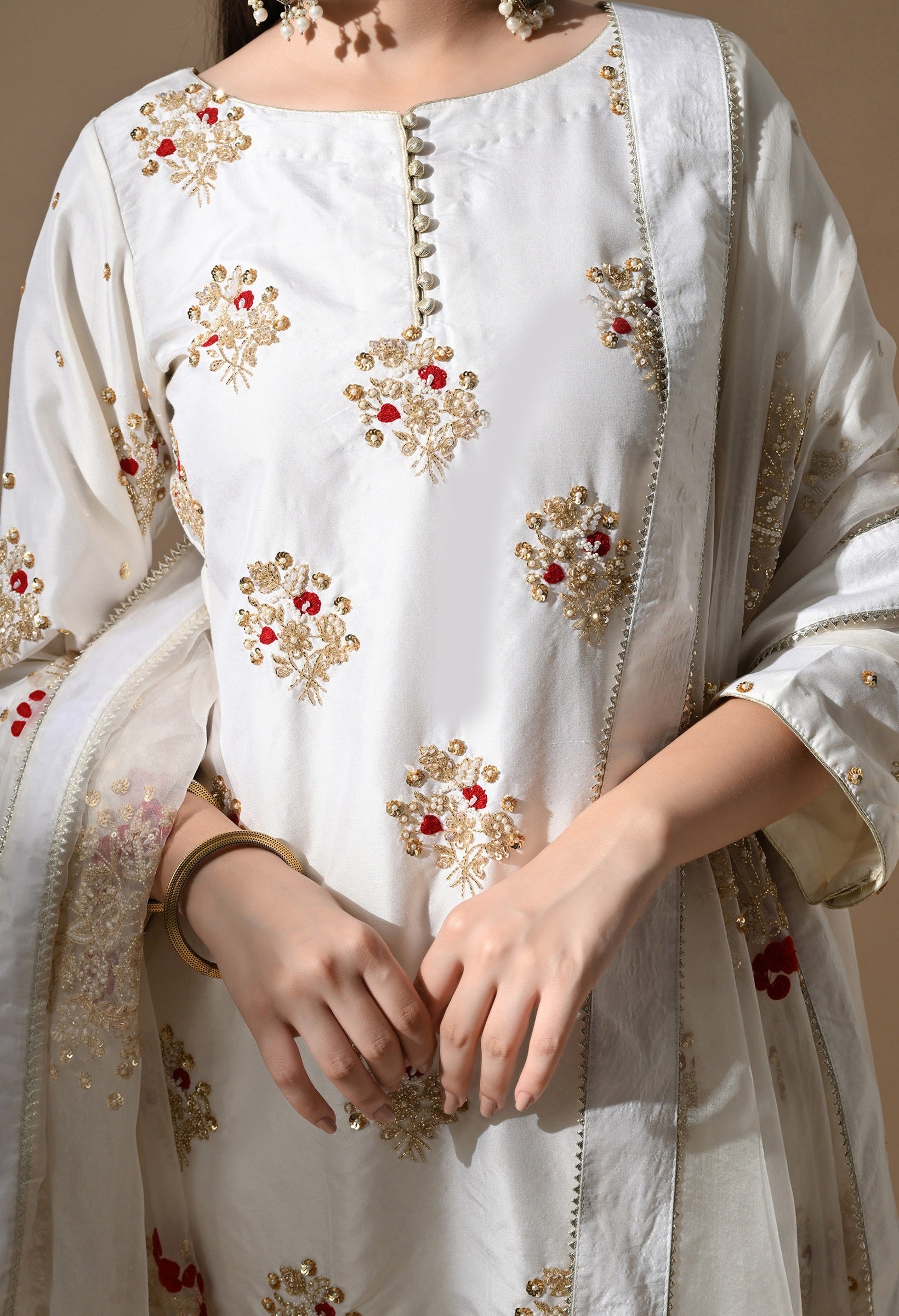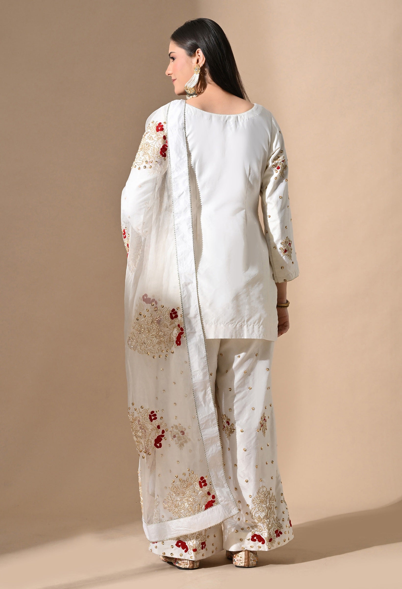 Embrace timeless elegance in this cream silk kurta set. Hand-embroidered with zardozi, pearls, and sequins, it’s paired with a soft organza dupatta and flared plazo. Tailored fit. Customisable. Dry-clean only.