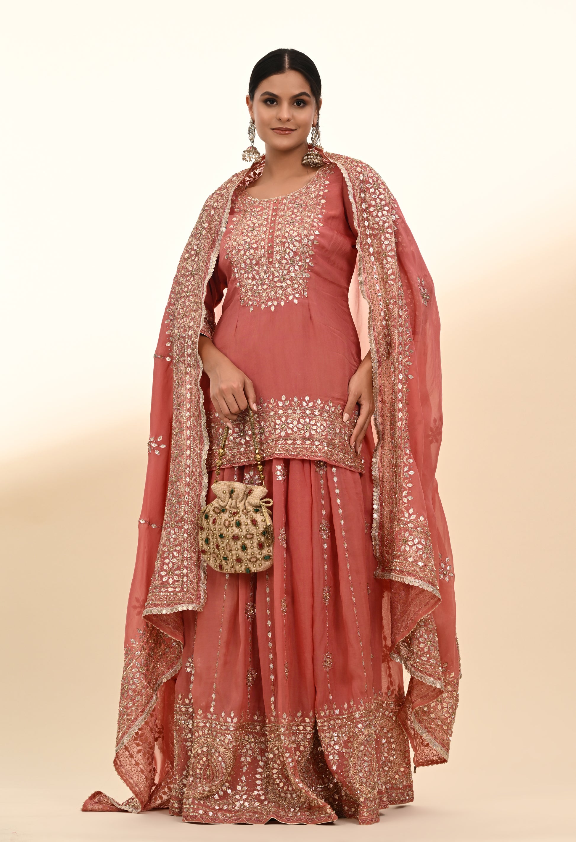 Adorn yourself in our tastefully embroidered Lehnga Set, crafted to perfection with quality organza fabric. Showcasing elegant gota patti, zardozi, and crystal work in a delightful creamy peach hue, the lehnga pairs seamlessly with an embroidered organza dupatta and matching blouse. This sophisticated ensemble embodies charm, ideal for showcasing your refined style.