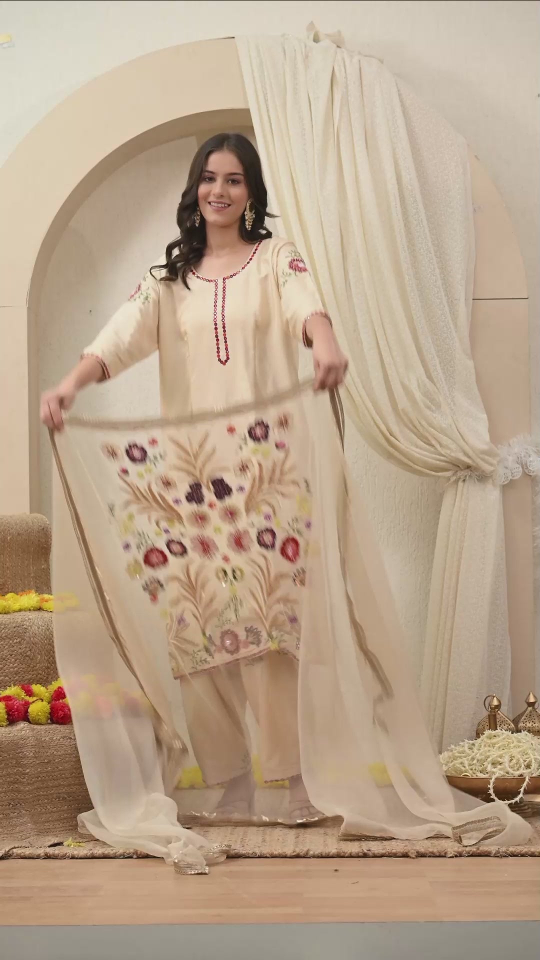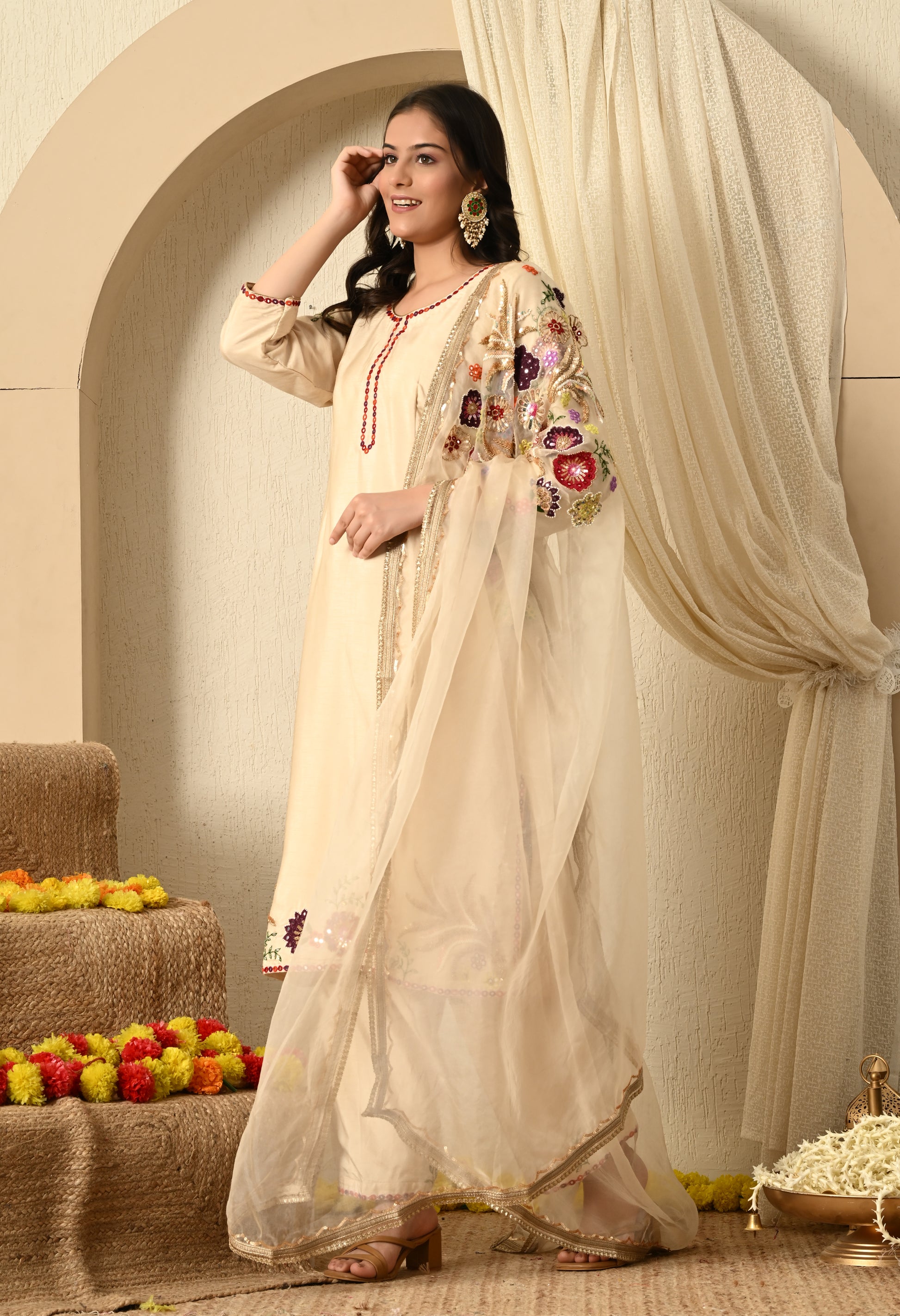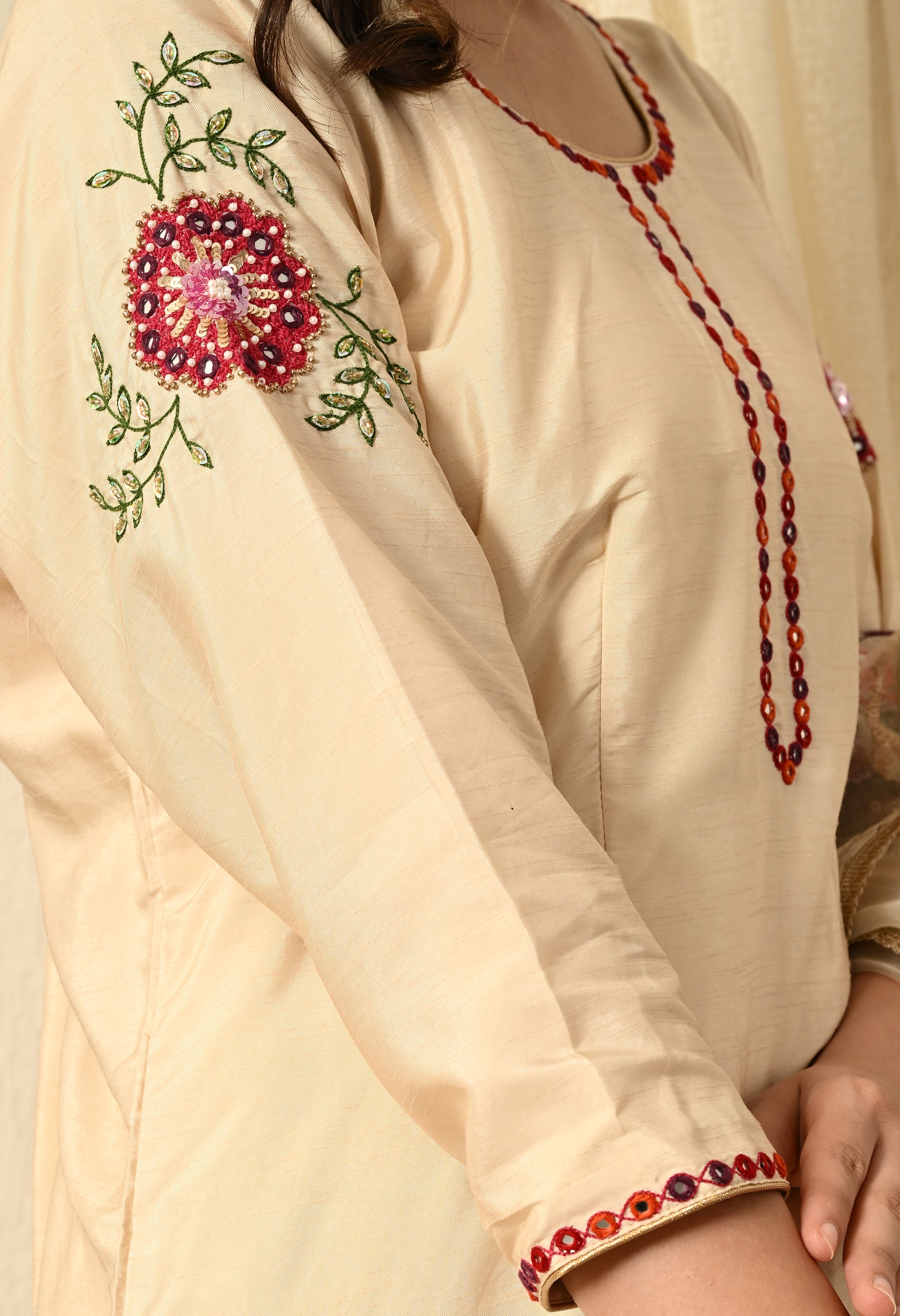 Embrace the elegance that you hold with our beautiful three-piece kurta set. Crafted from silk fabric, the kurta showcases elegant hand embroidery in a beautiful dark cream hue. The organza dupatta and silk bottom with elegant work truly takes the breath away. Perfect to add beauty to an individual’s personality.
