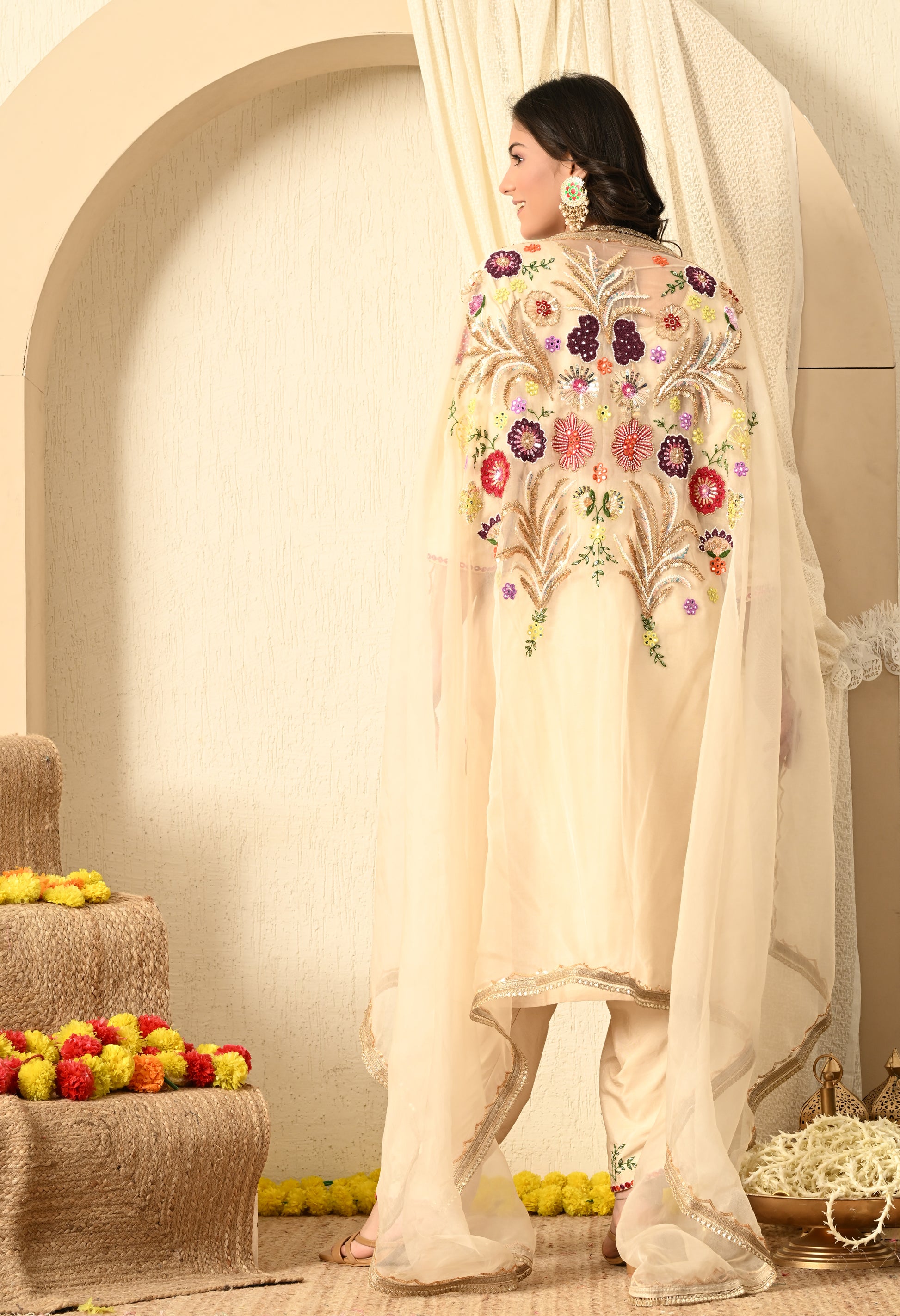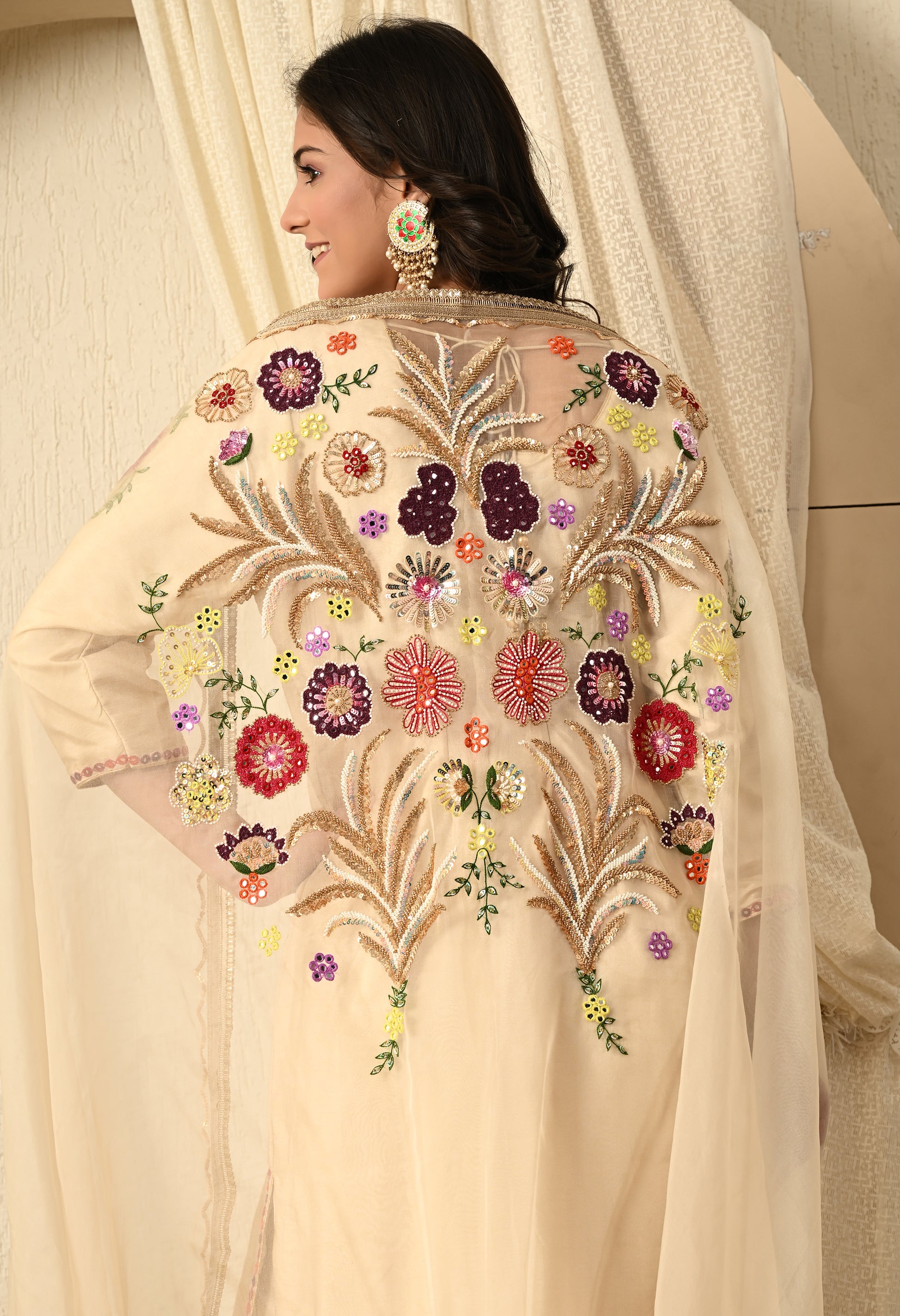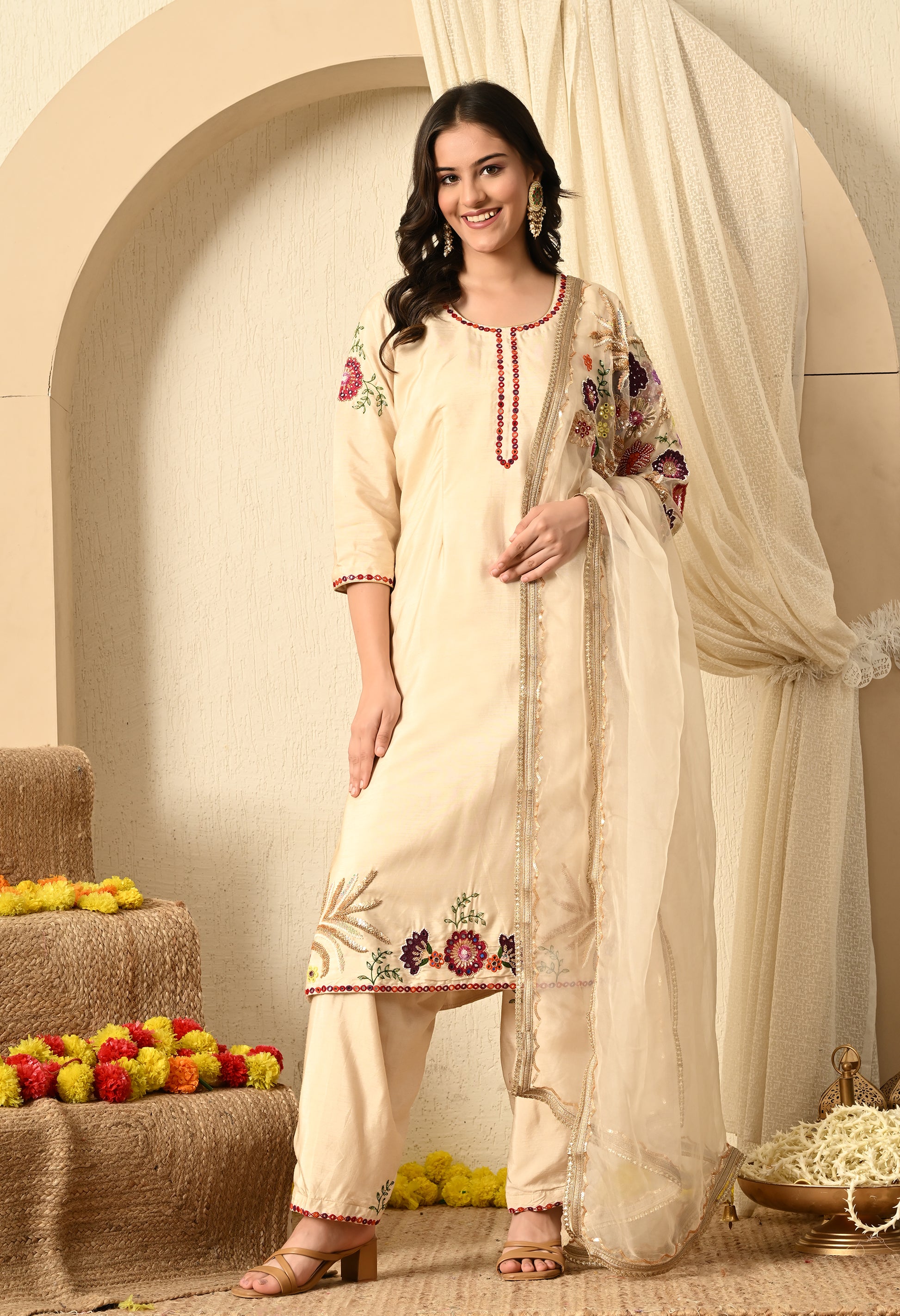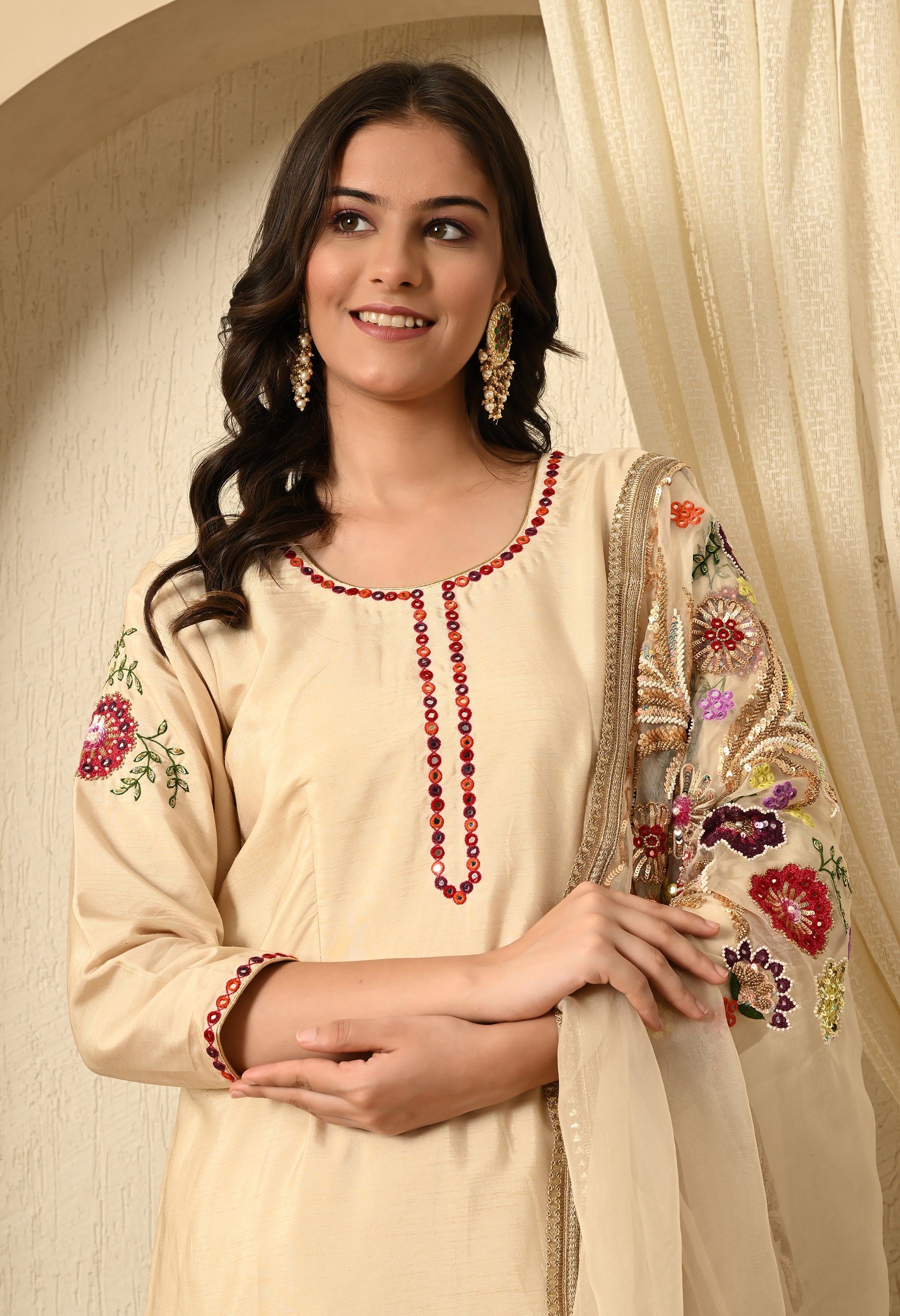 Embrace the elegance that you hold with our beautiful three-piece kurta set. Crafted from silk fabric, the kurta showcases elegant hand embroidery in a beautiful dark cream hue. The organza dupatta and silk bottom with elegant work truly takes the breath away. Perfect to add beauty to an individual’s personality.
