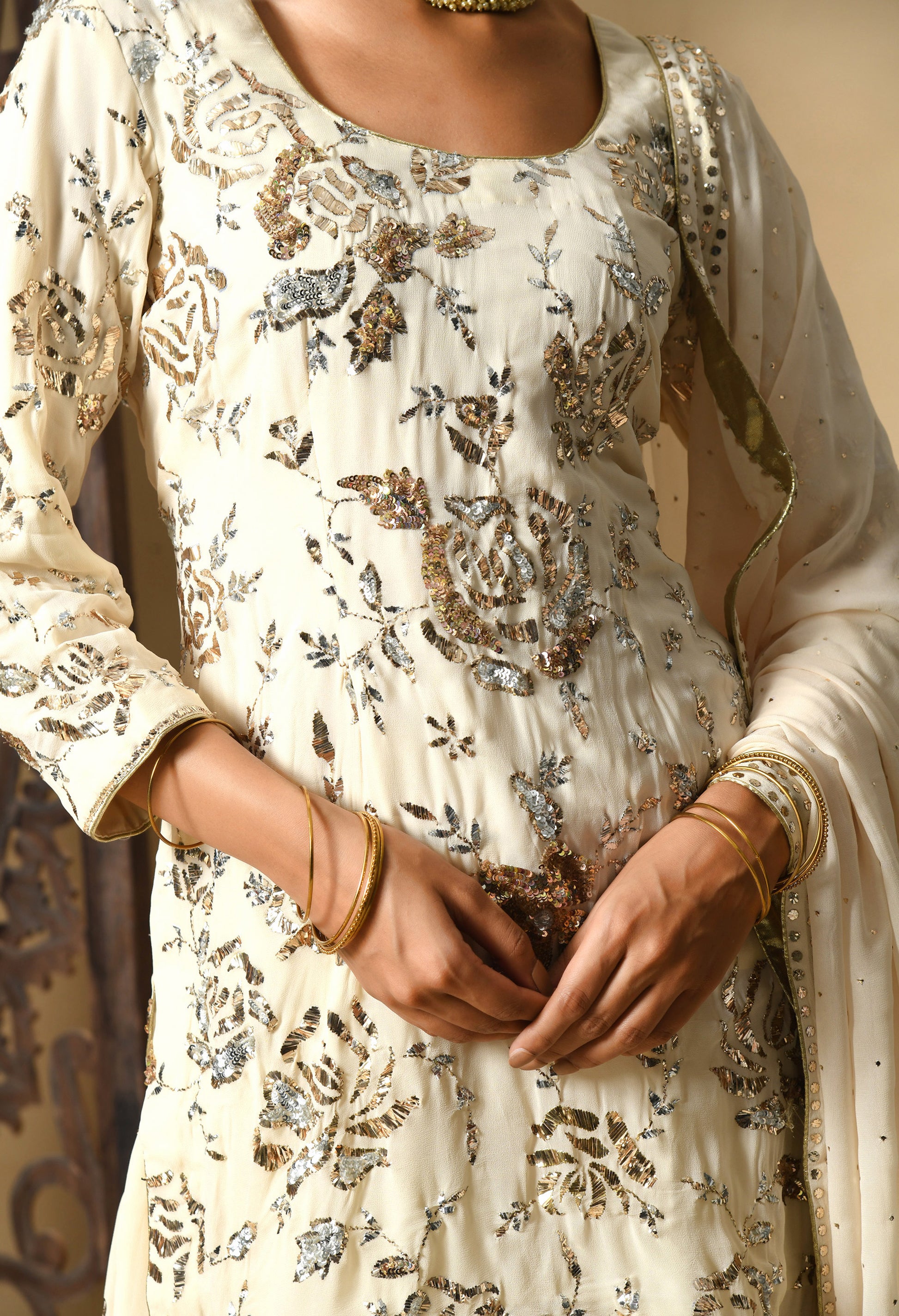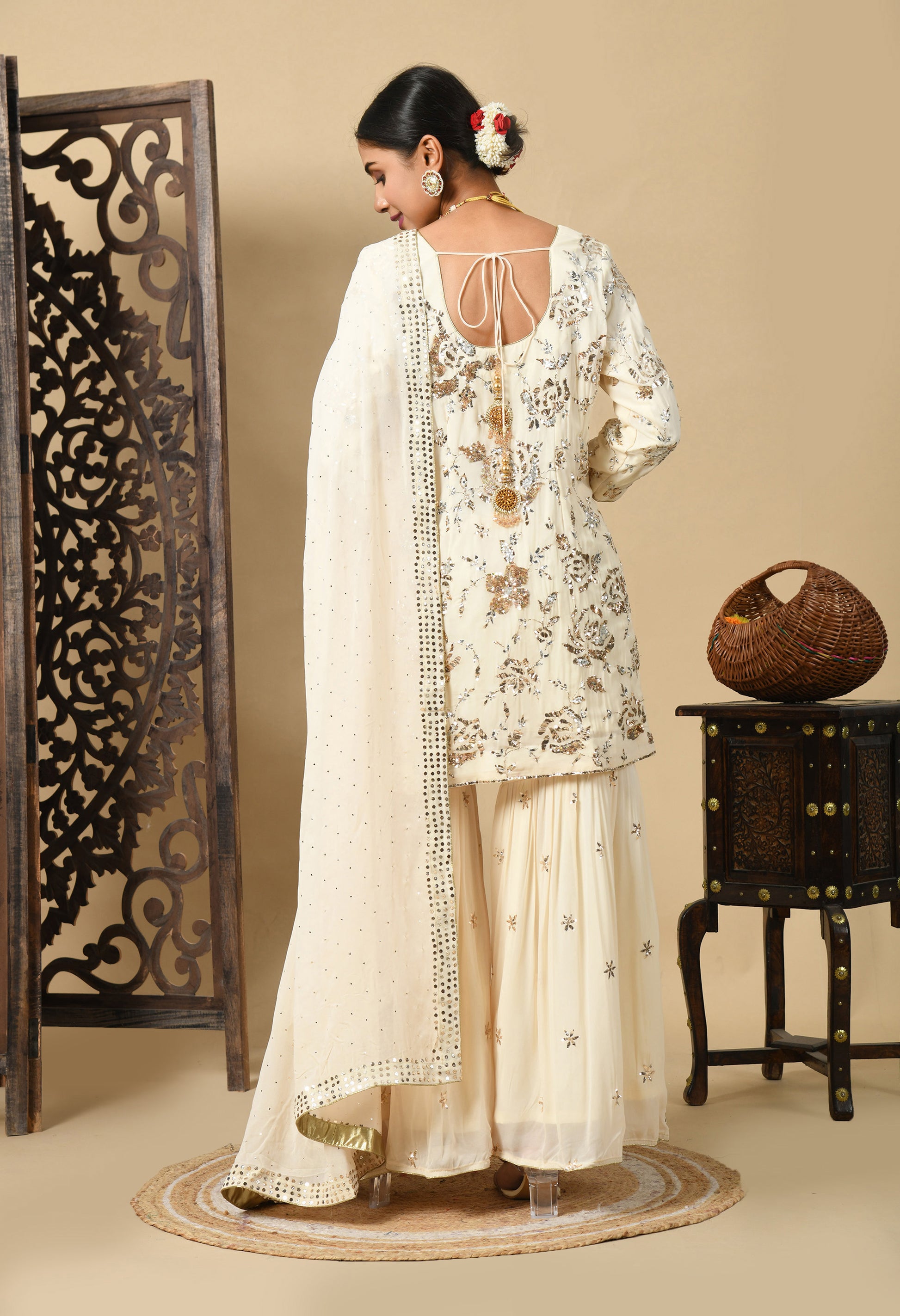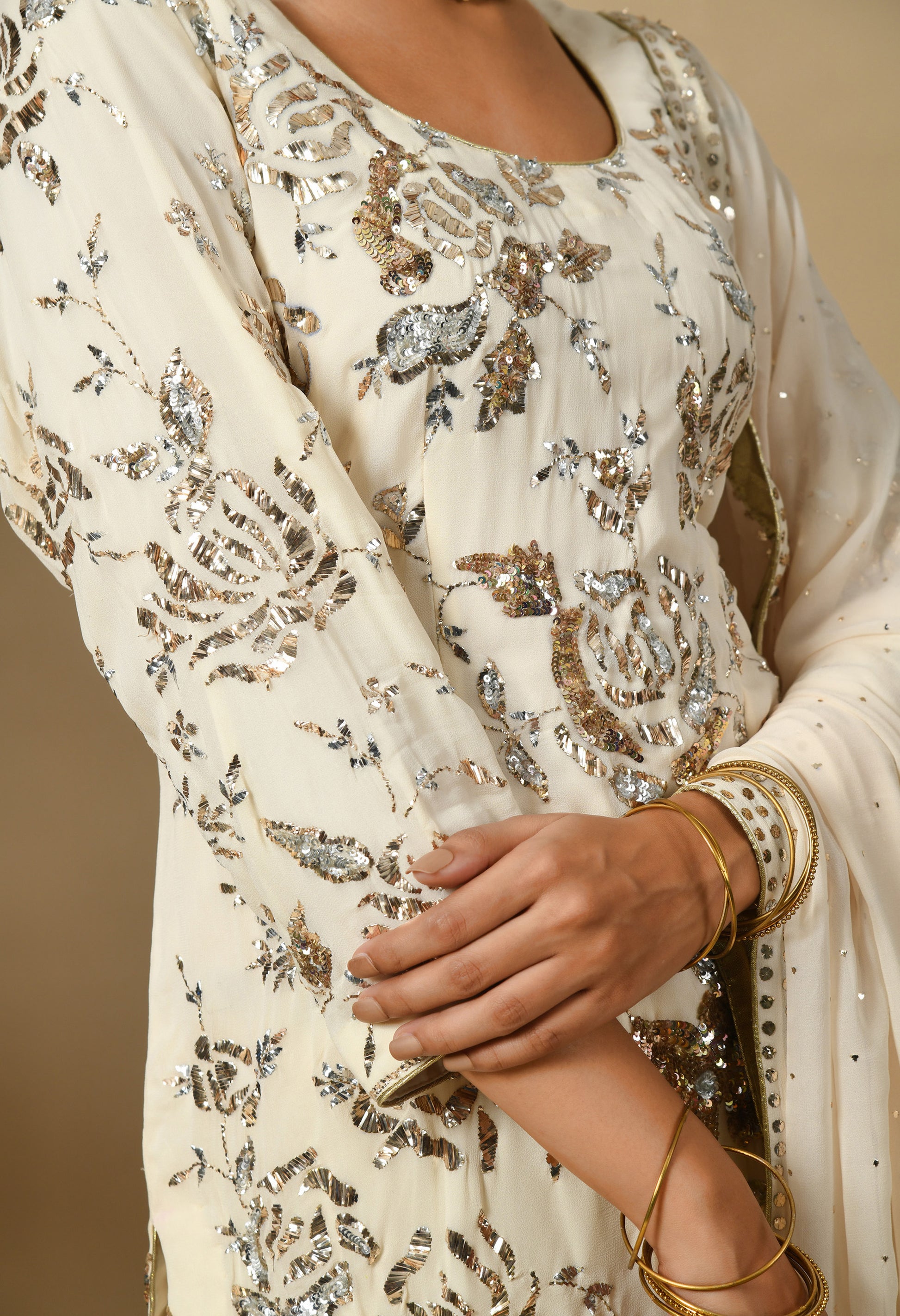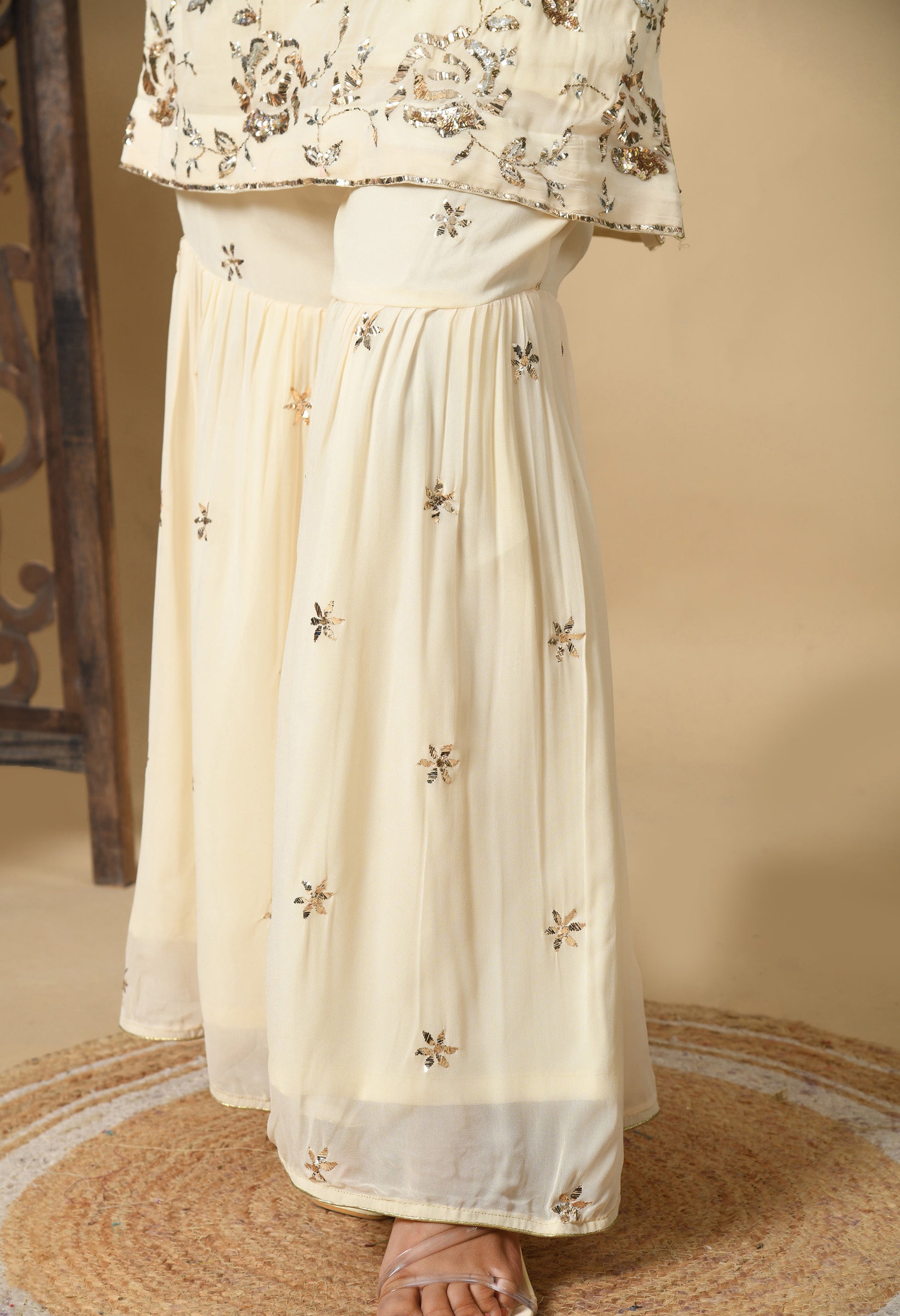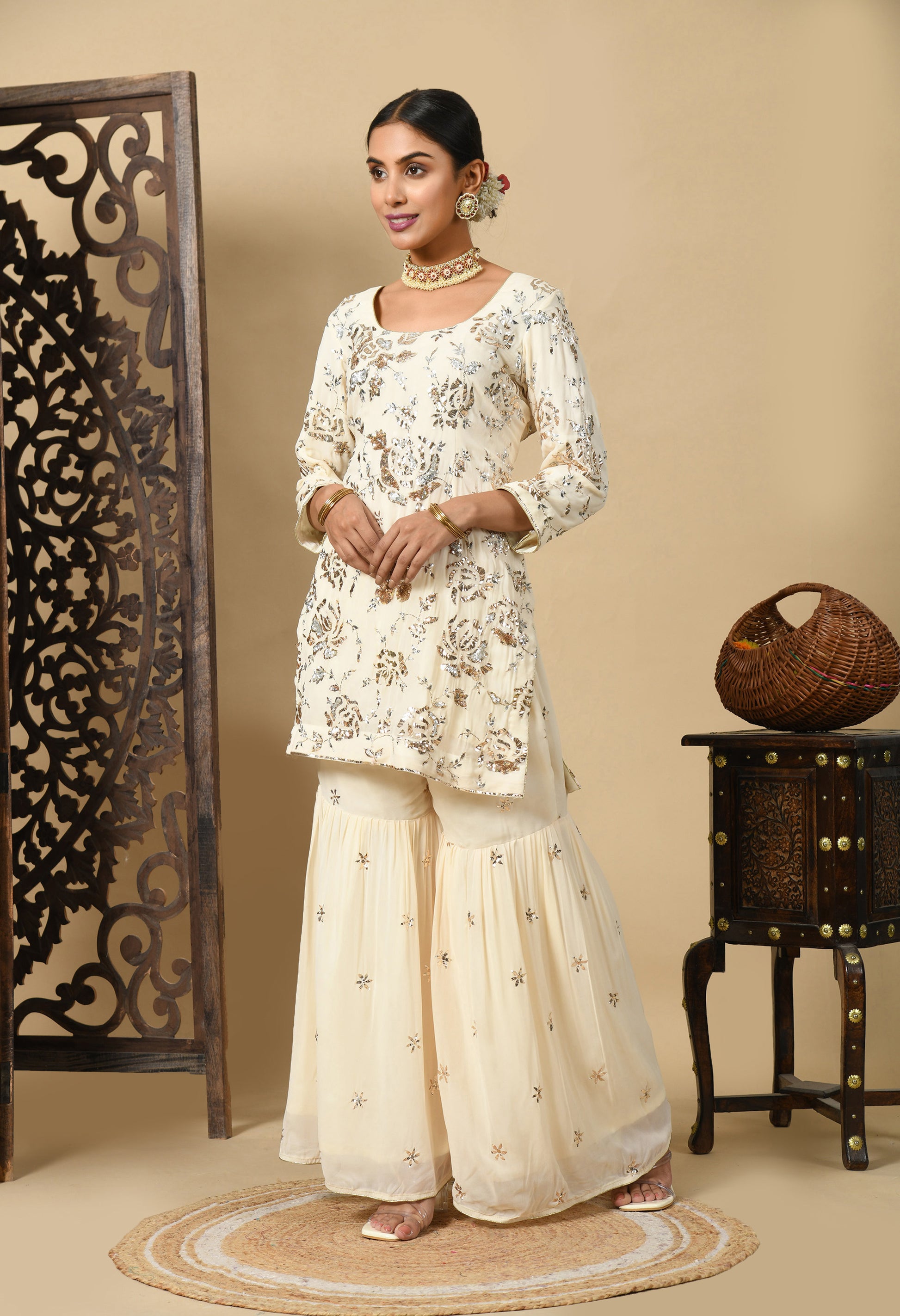 Dark Cream Gharara Set with Mukaish and Sequence Work