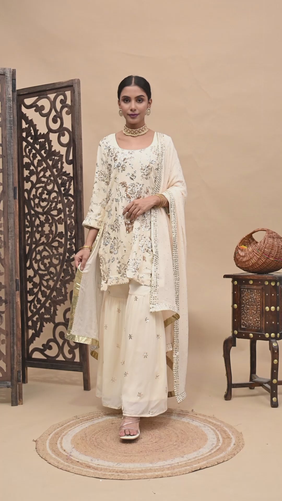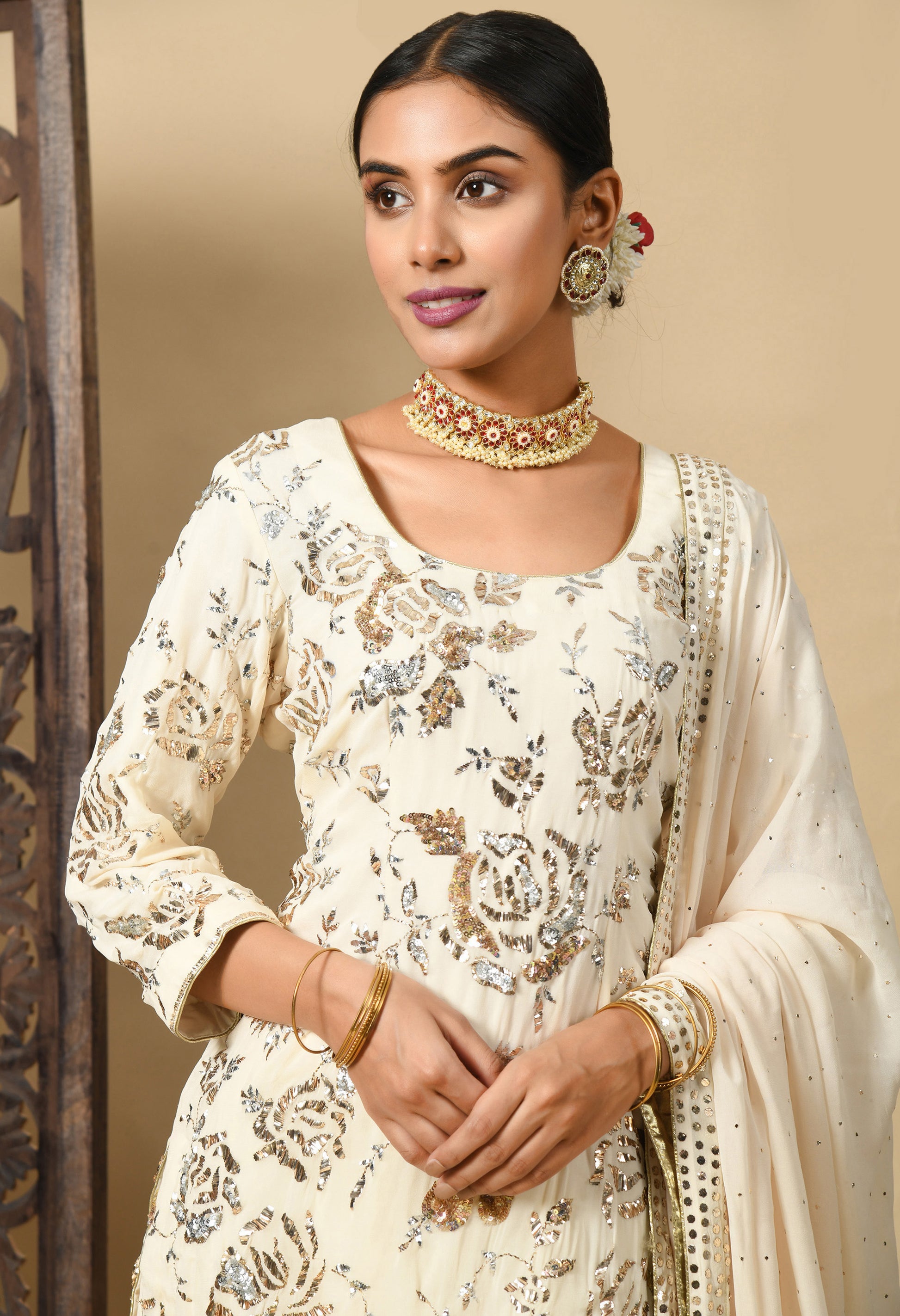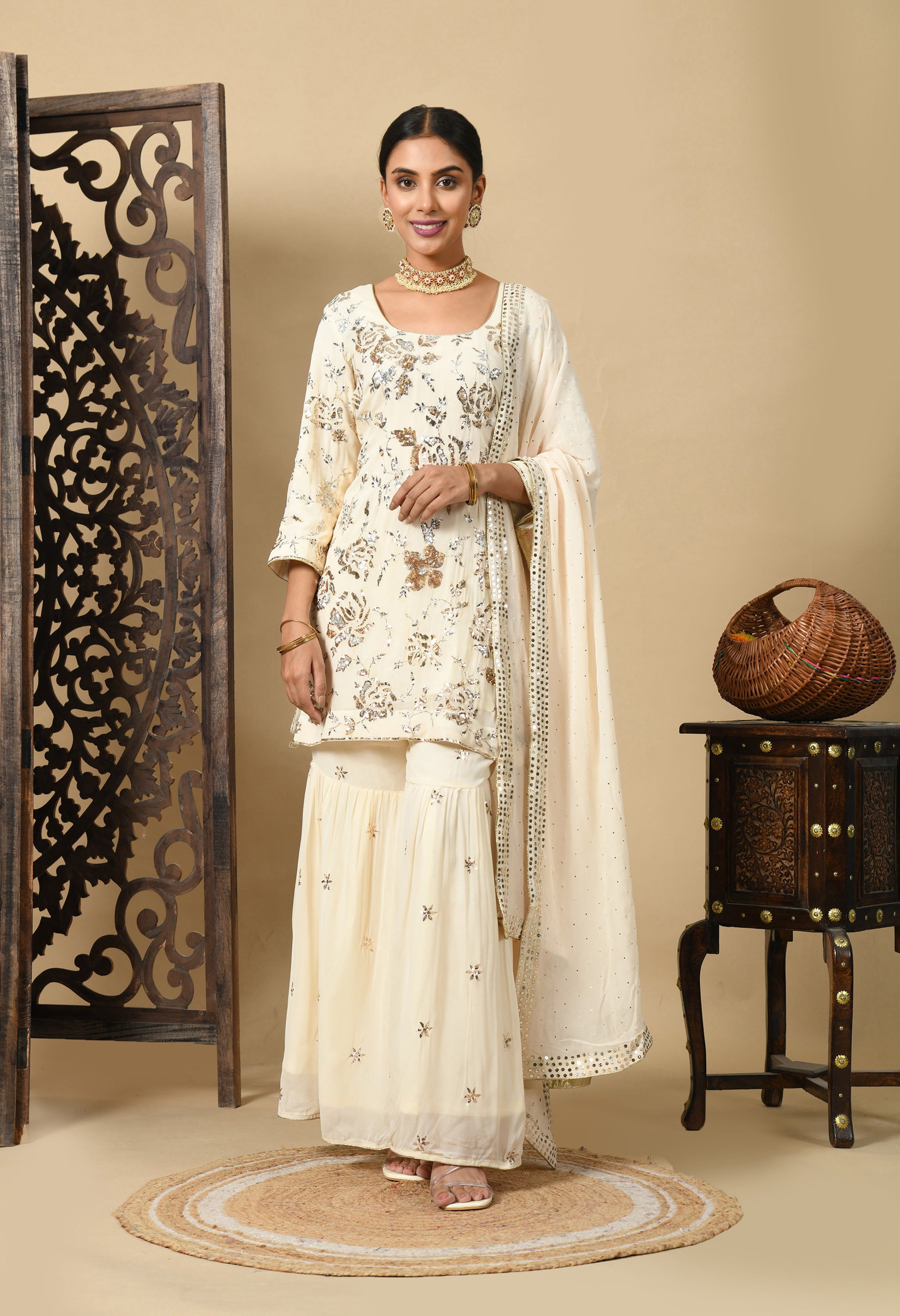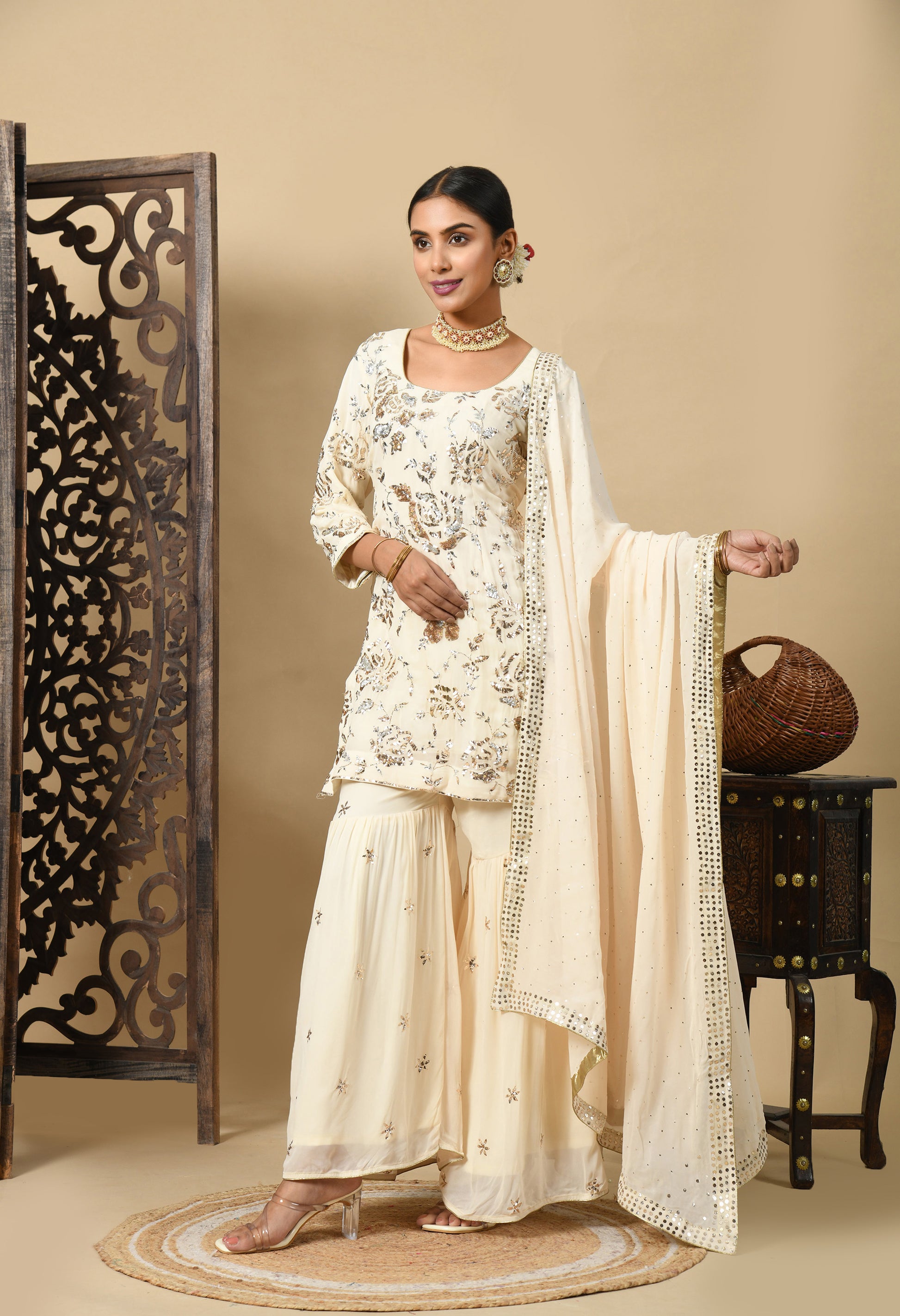 Elevate your ethnic style with our stunning dark cream Gharara Set, paired with a lightweight georgette dupatta, a beautifully embroidered georgette kurta, and a complementing georgette sharara. The mukaish and sequin work reflect its enduring elegance. An elegant fir for the elegant you!