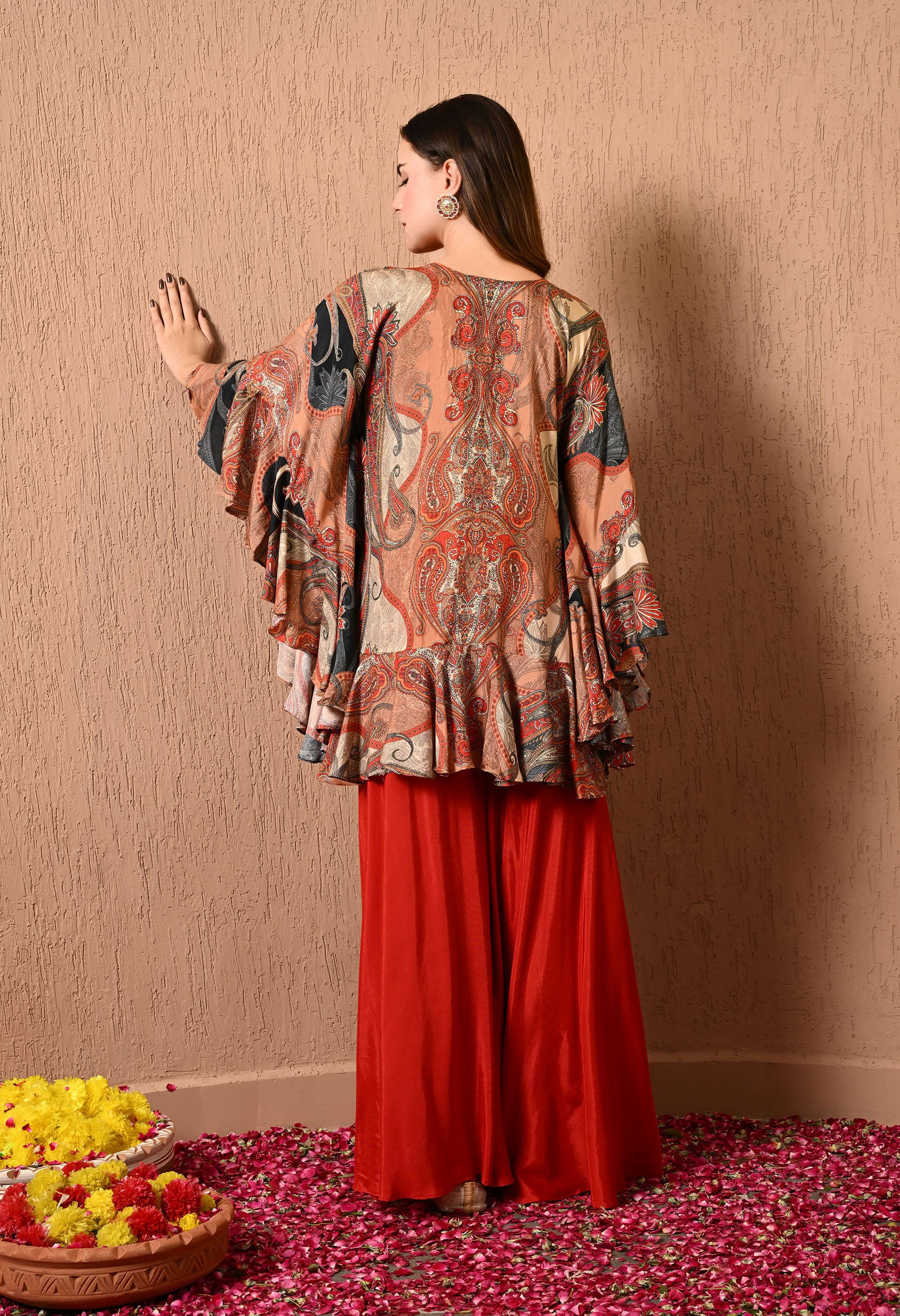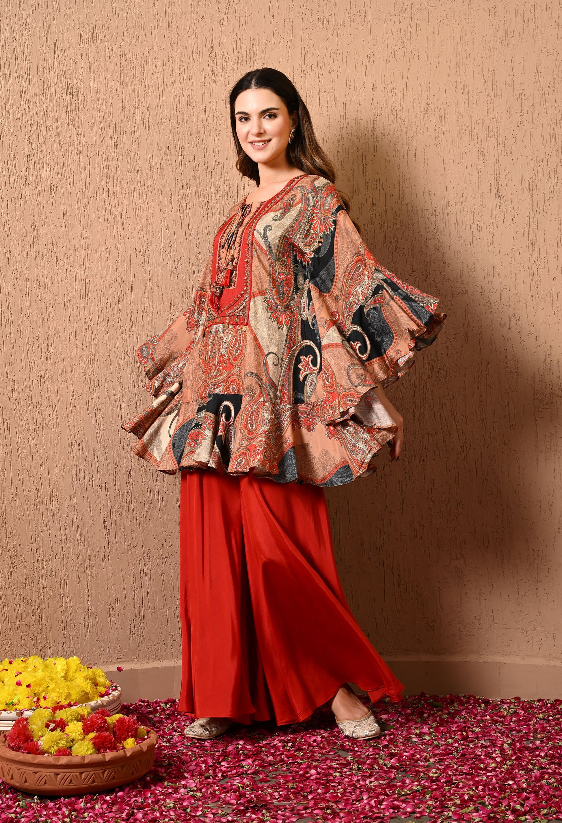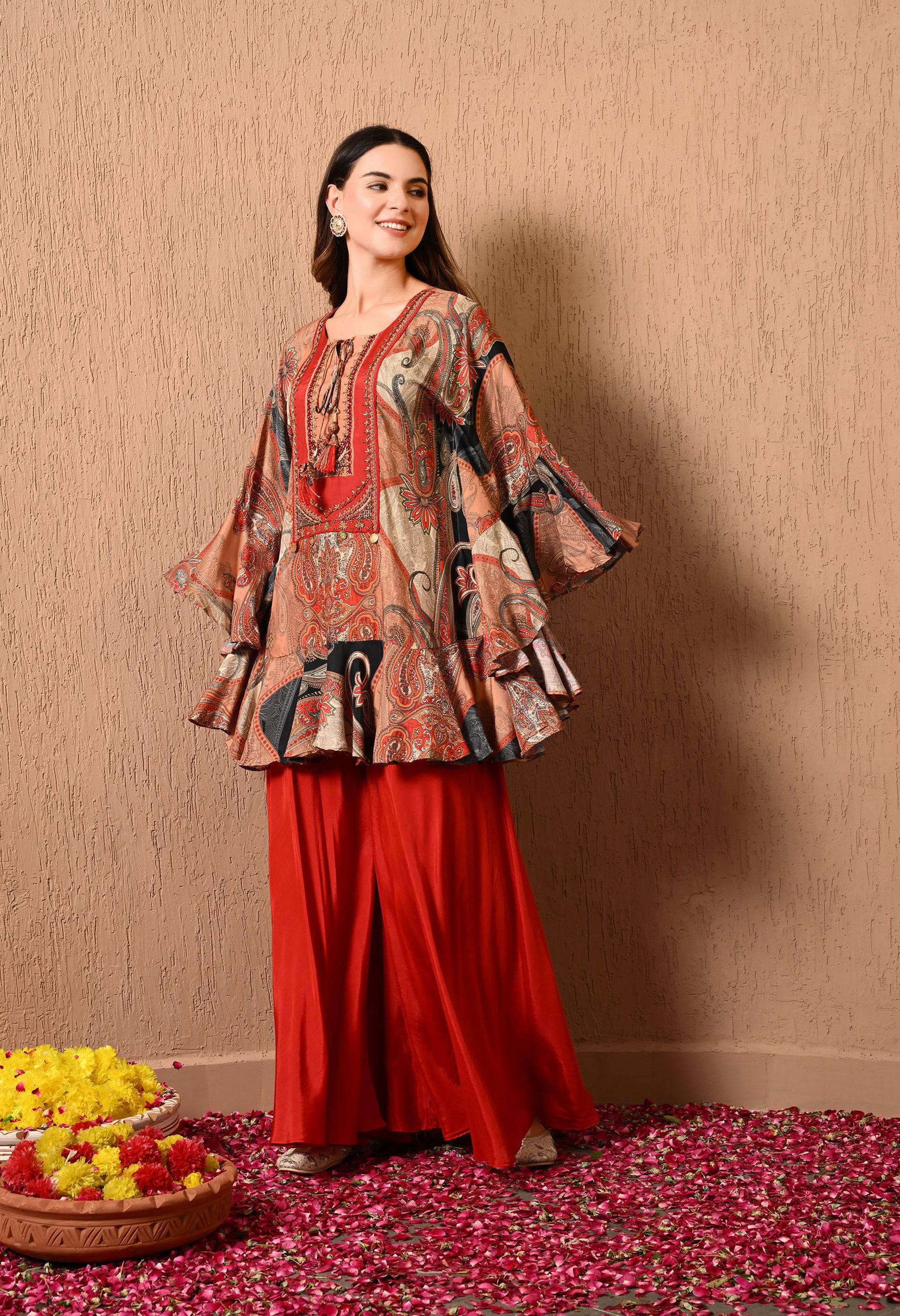 Turn heads effortlessly in our dark orange Kaftan Set, featuring a beautifully curated crepe top, and a matching crepe sharara. The elegant printed top accents create a timeless look. Ensemble perfect for every and any occasions!