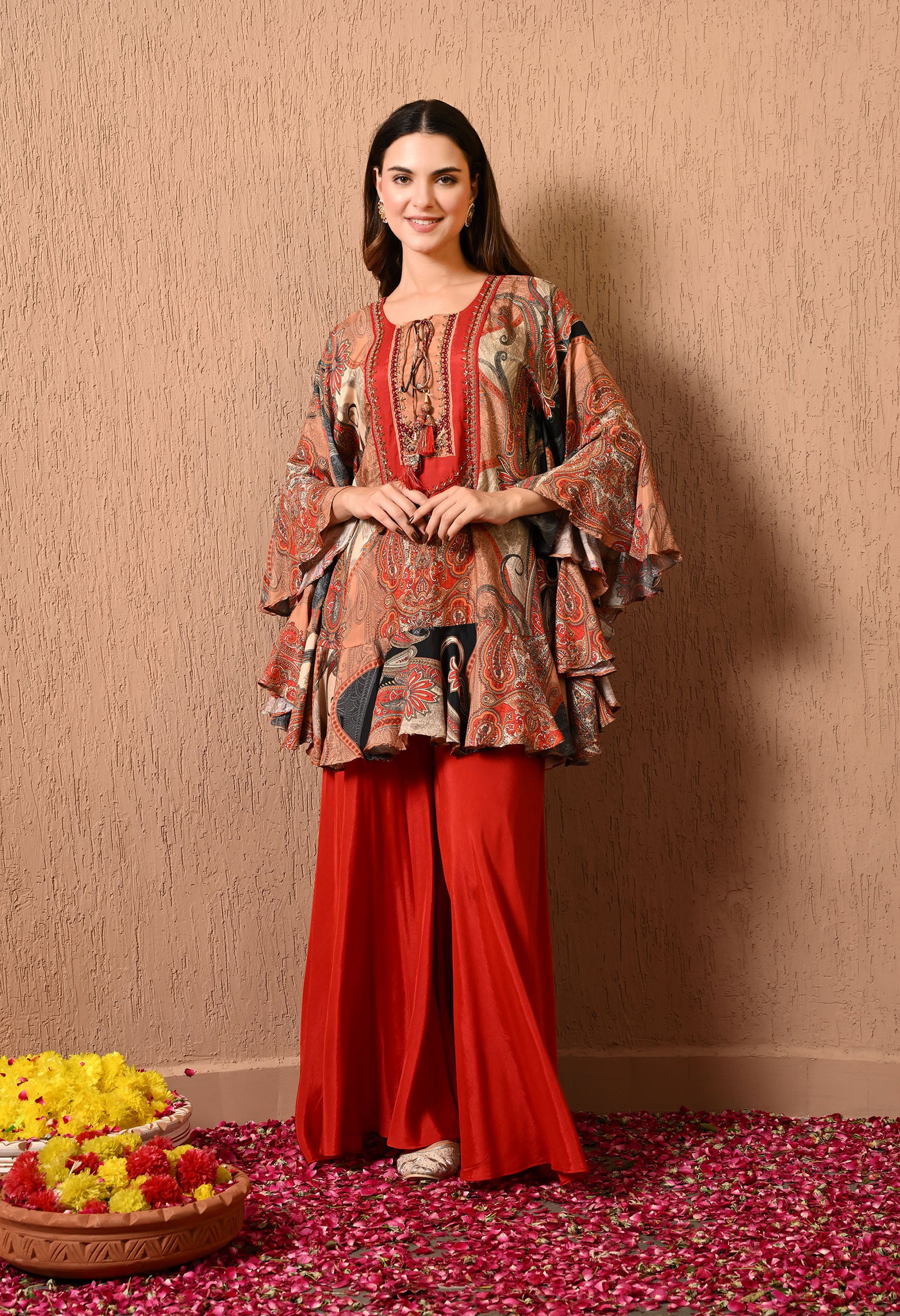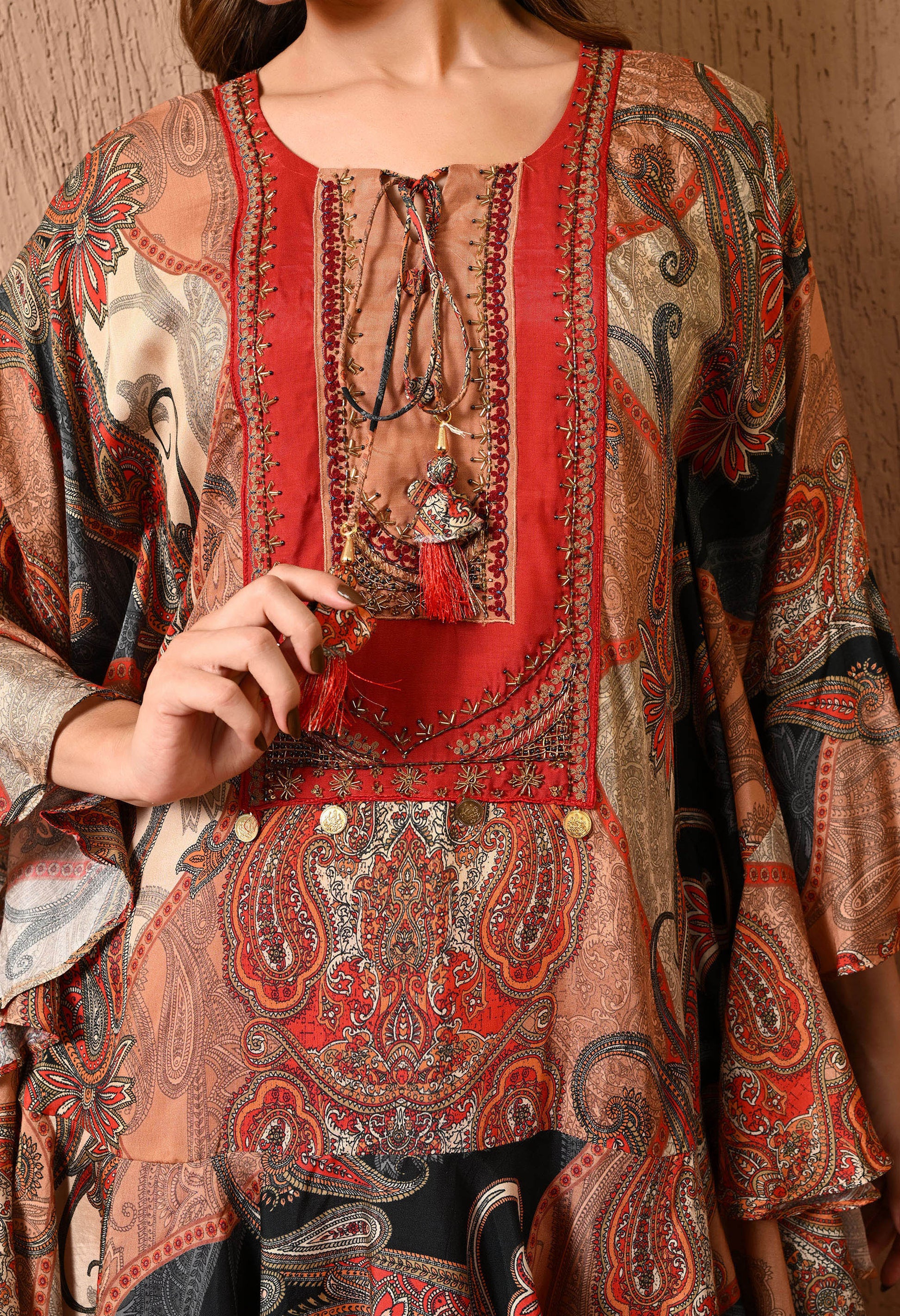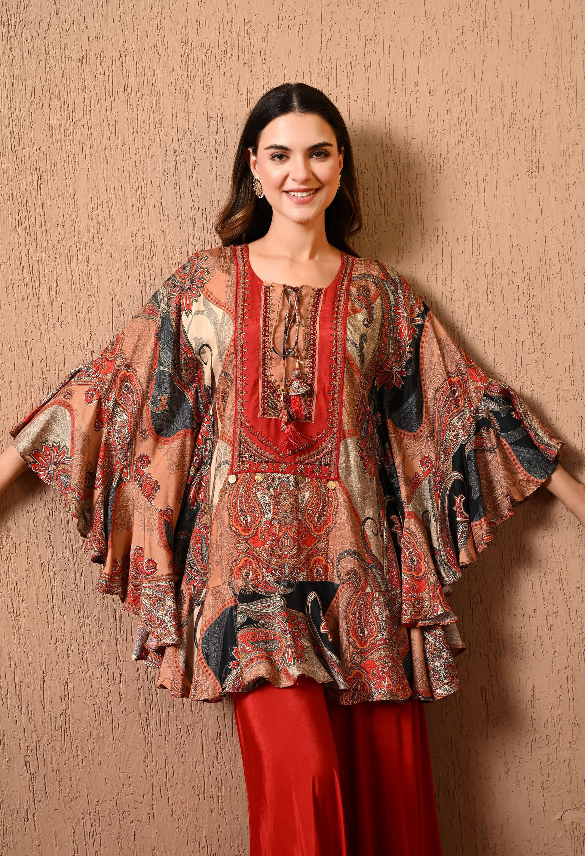 Other Details: Elegant printed kaftan style frilled Top with beautiful hand work on the Neck