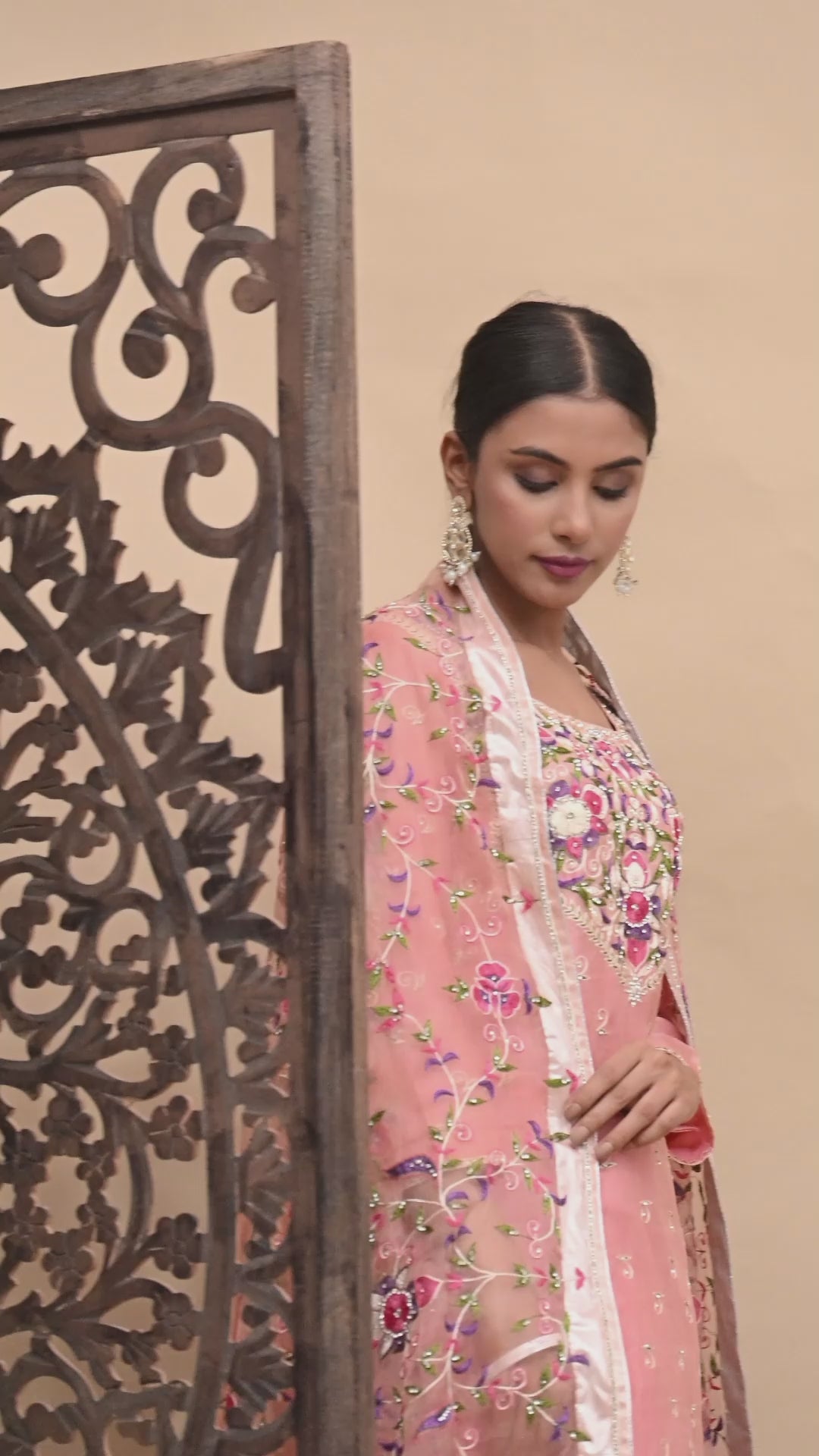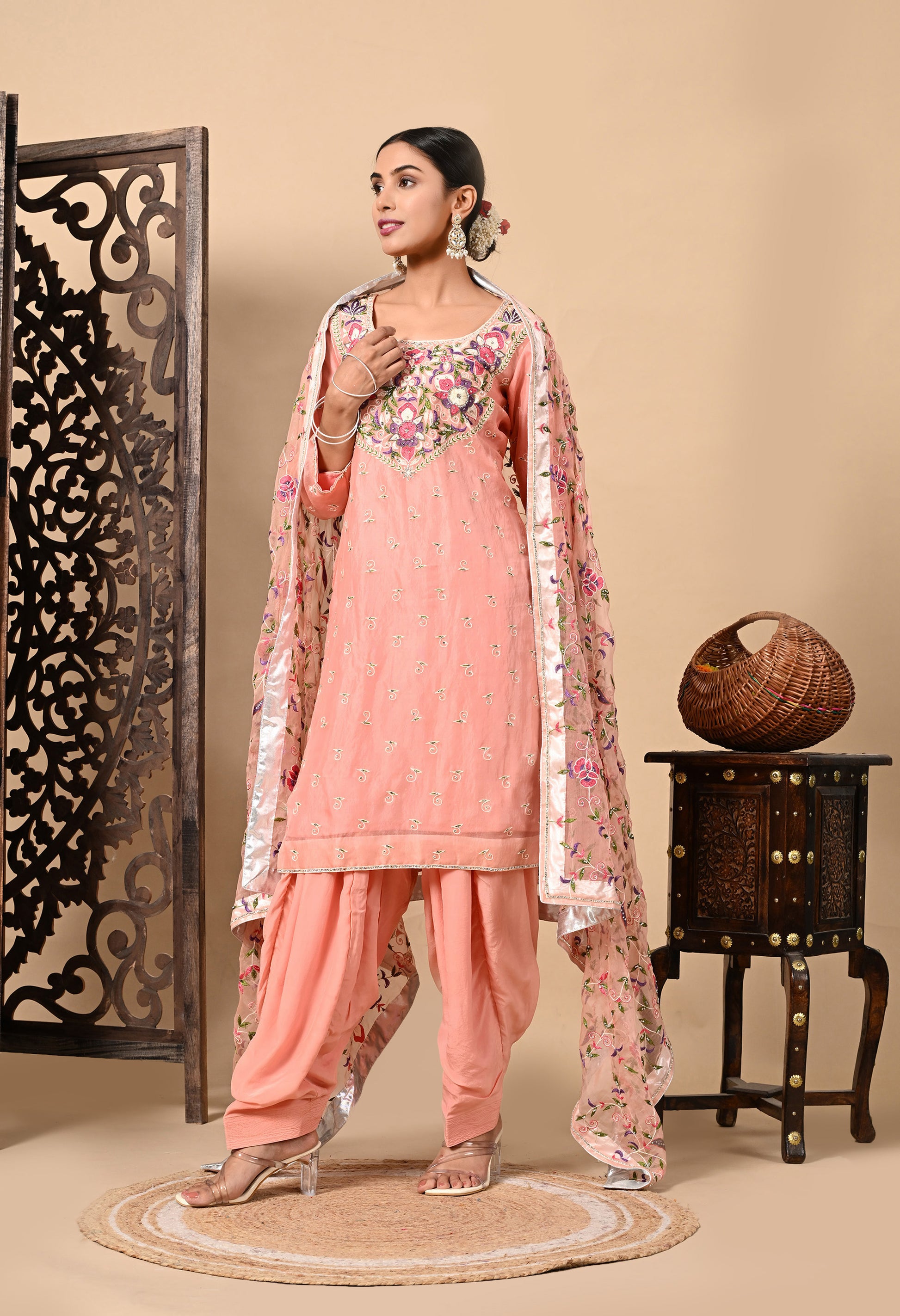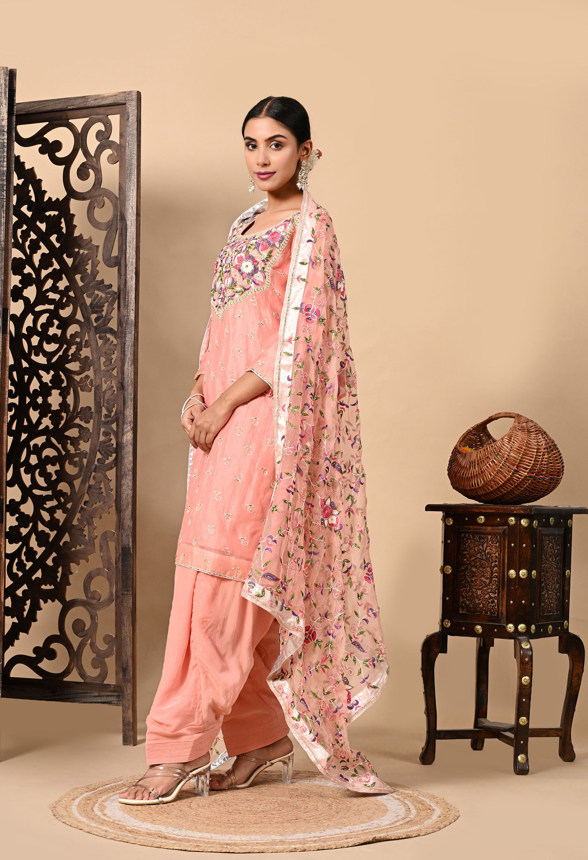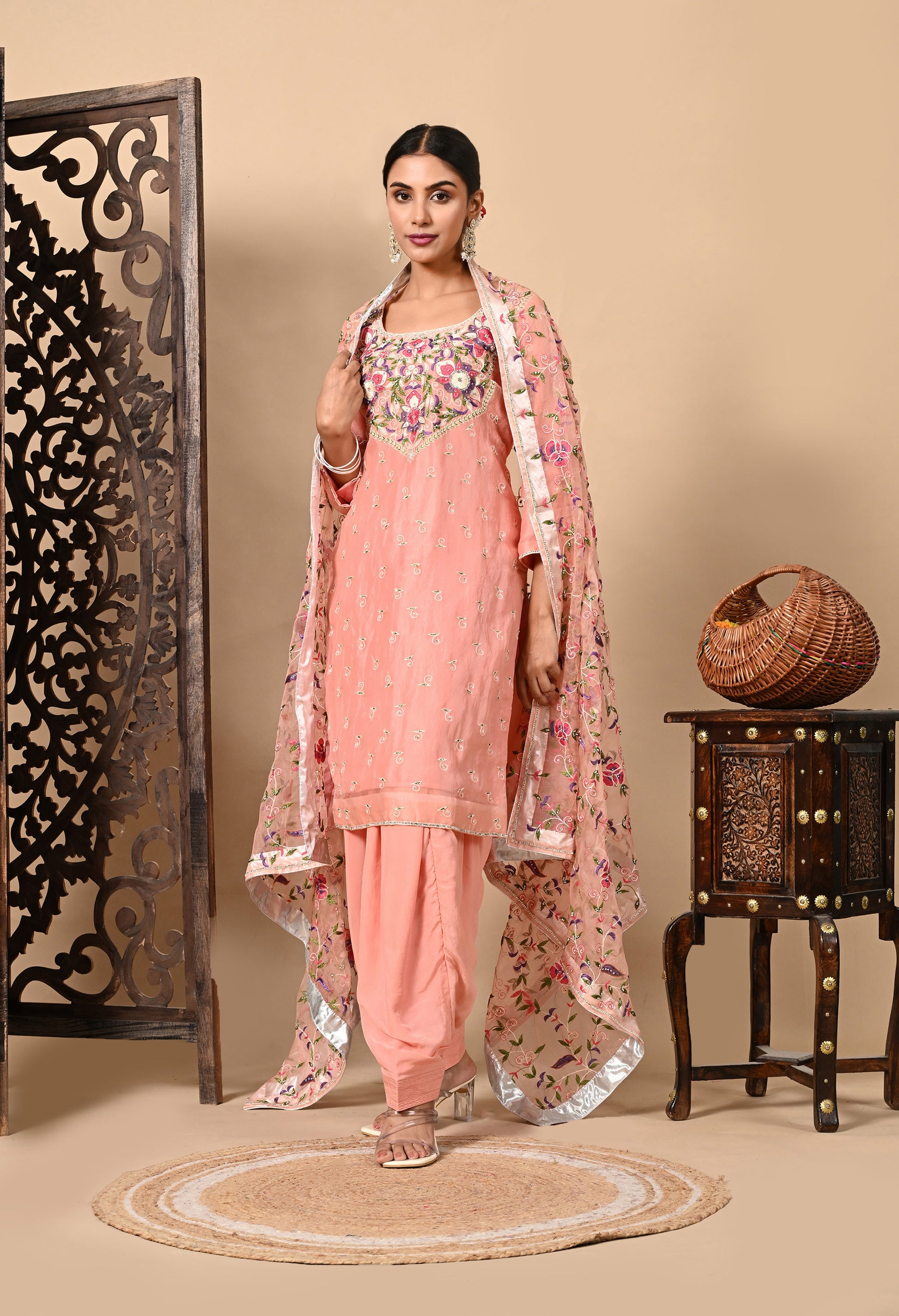 Transform your festive wardrobe with our dark peach Kurta Set, featuring a light organza dupatta, a stunning embroidered organza kurta, and a matching crepe bottom. The intricate parsi thread and crystal accents add a touch of opulence and timeless charm.