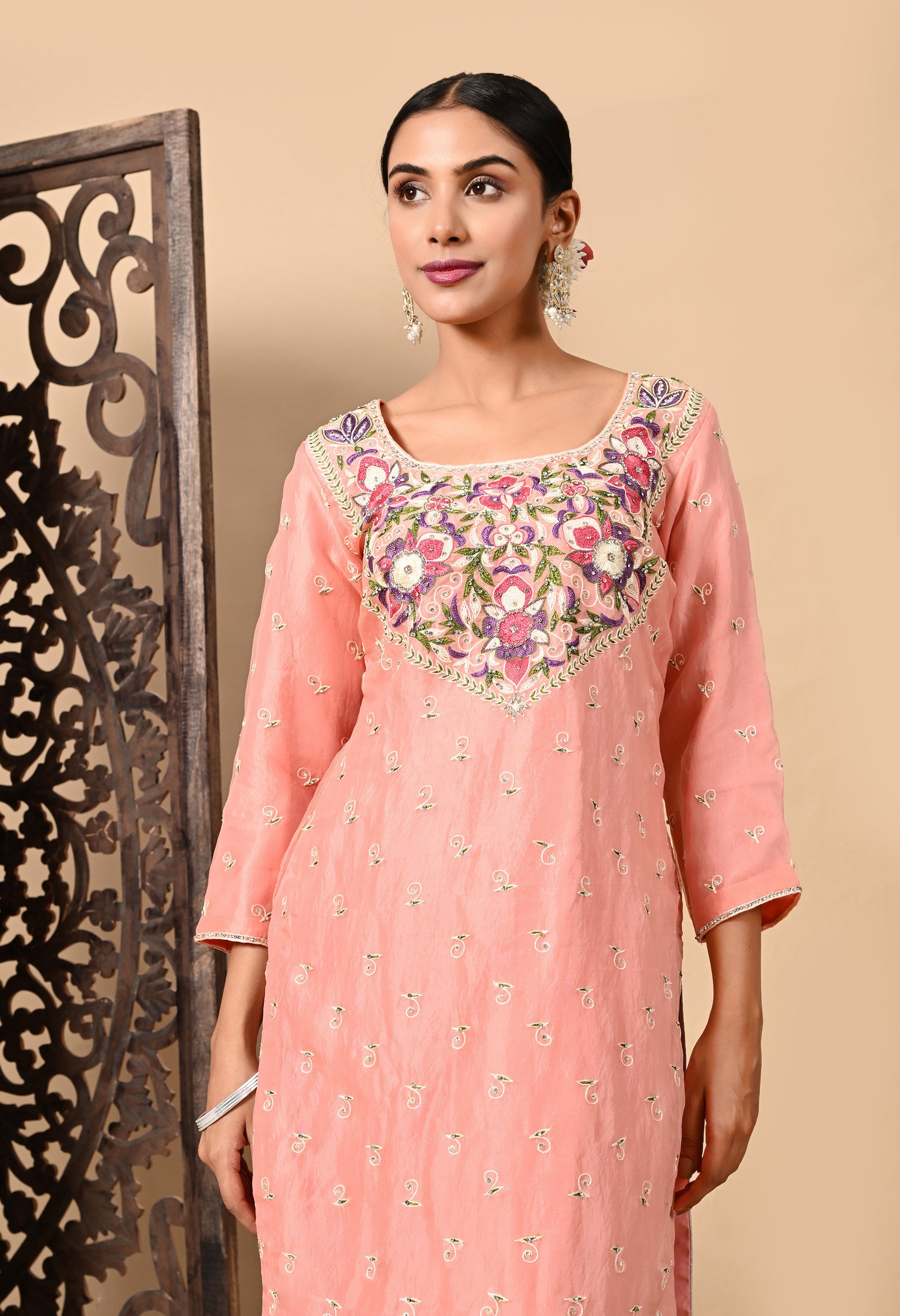 Dark Peach Kurta Set with Exceptional Parsi Thread and Crystal Work