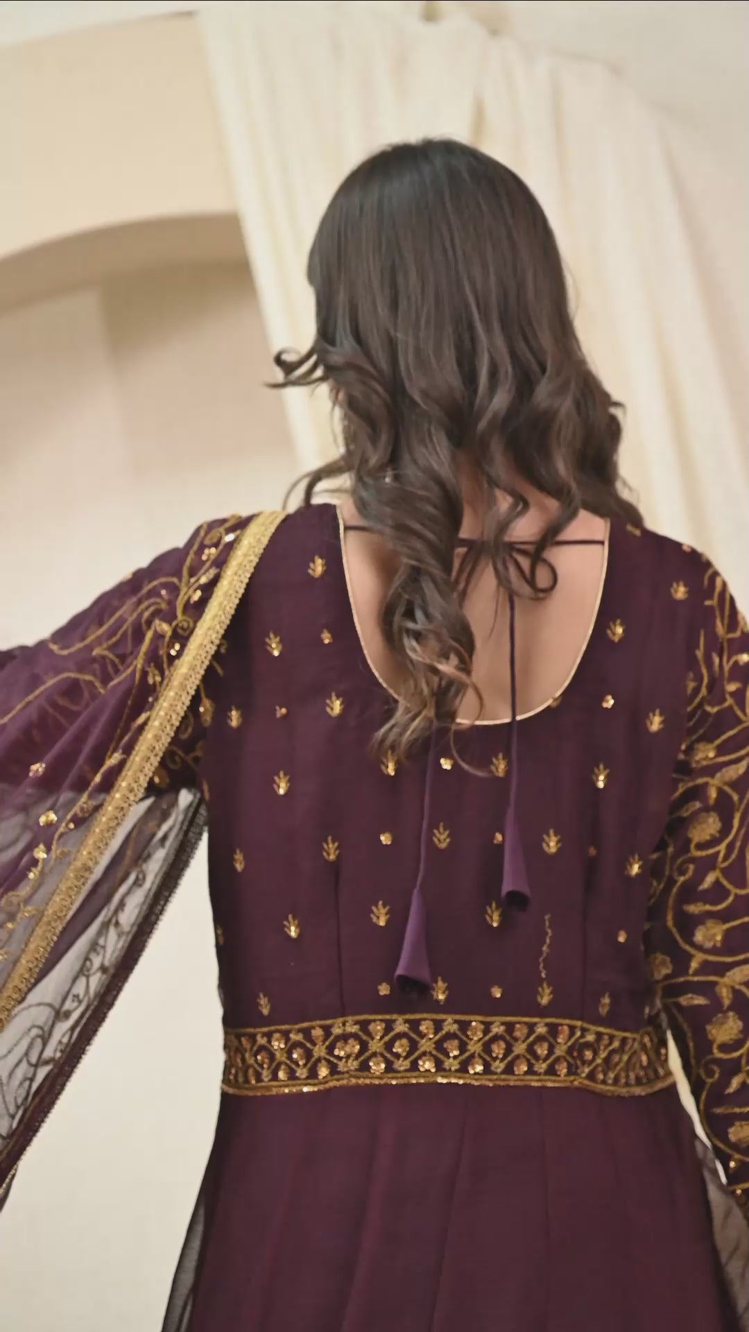 Experience the elegance with our exquisite Dark Wine Zardozi and Sequin Anarkali. Crafted from luxurious Bamber Chiffon, the Anarkali features intricate embroidery with an additional can-can detail. The full jaal embroidered dupatta adds a touch of sophistication. Perfect for special occasions.