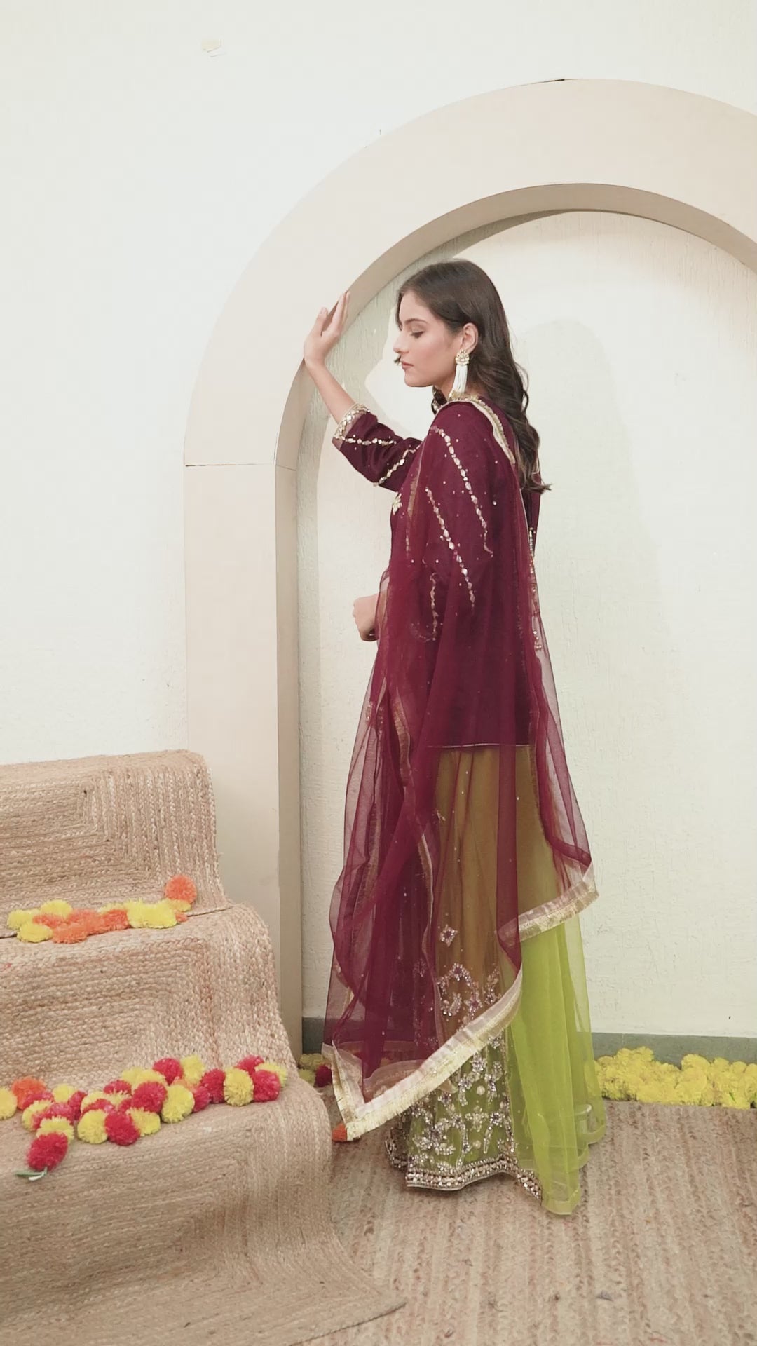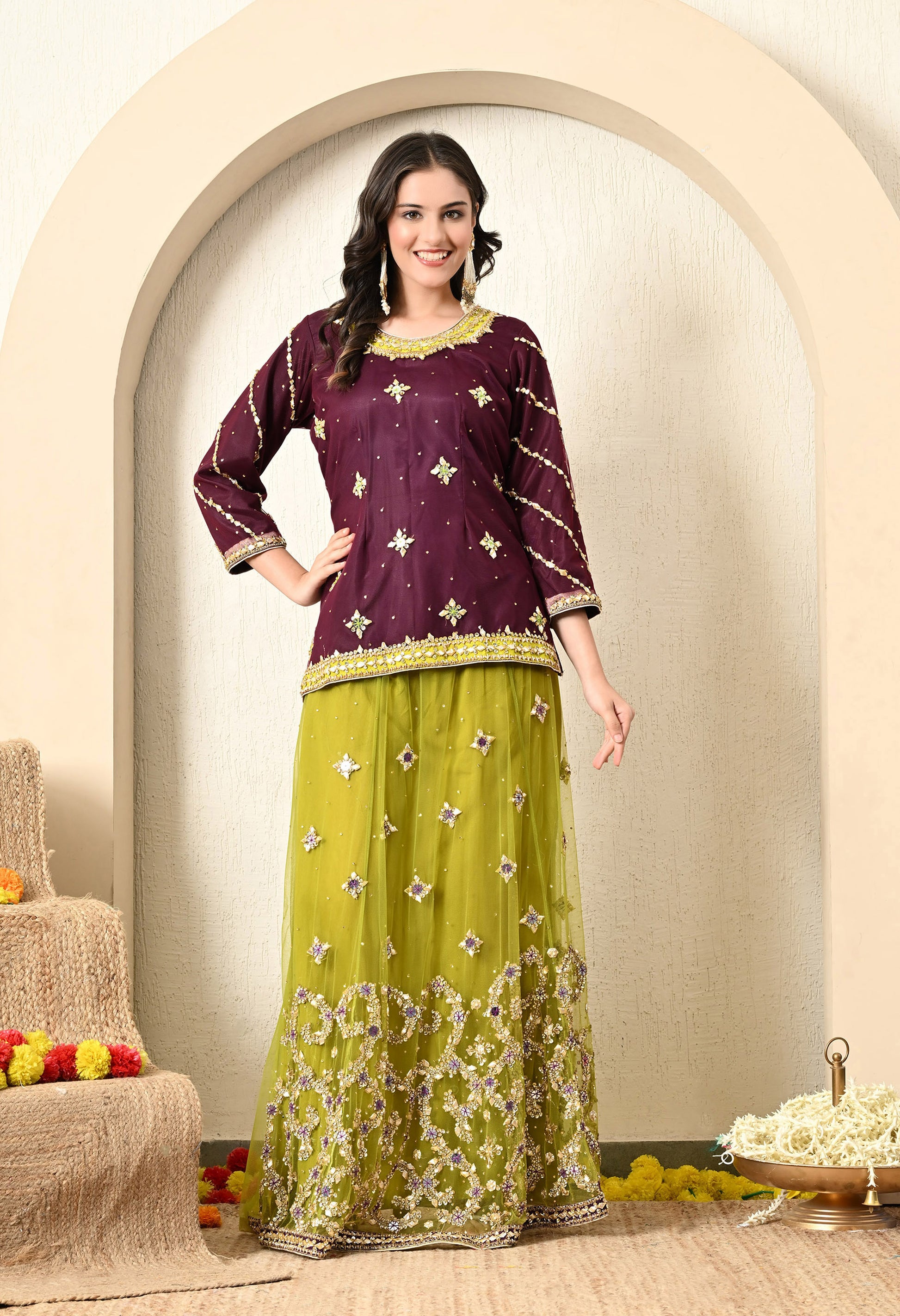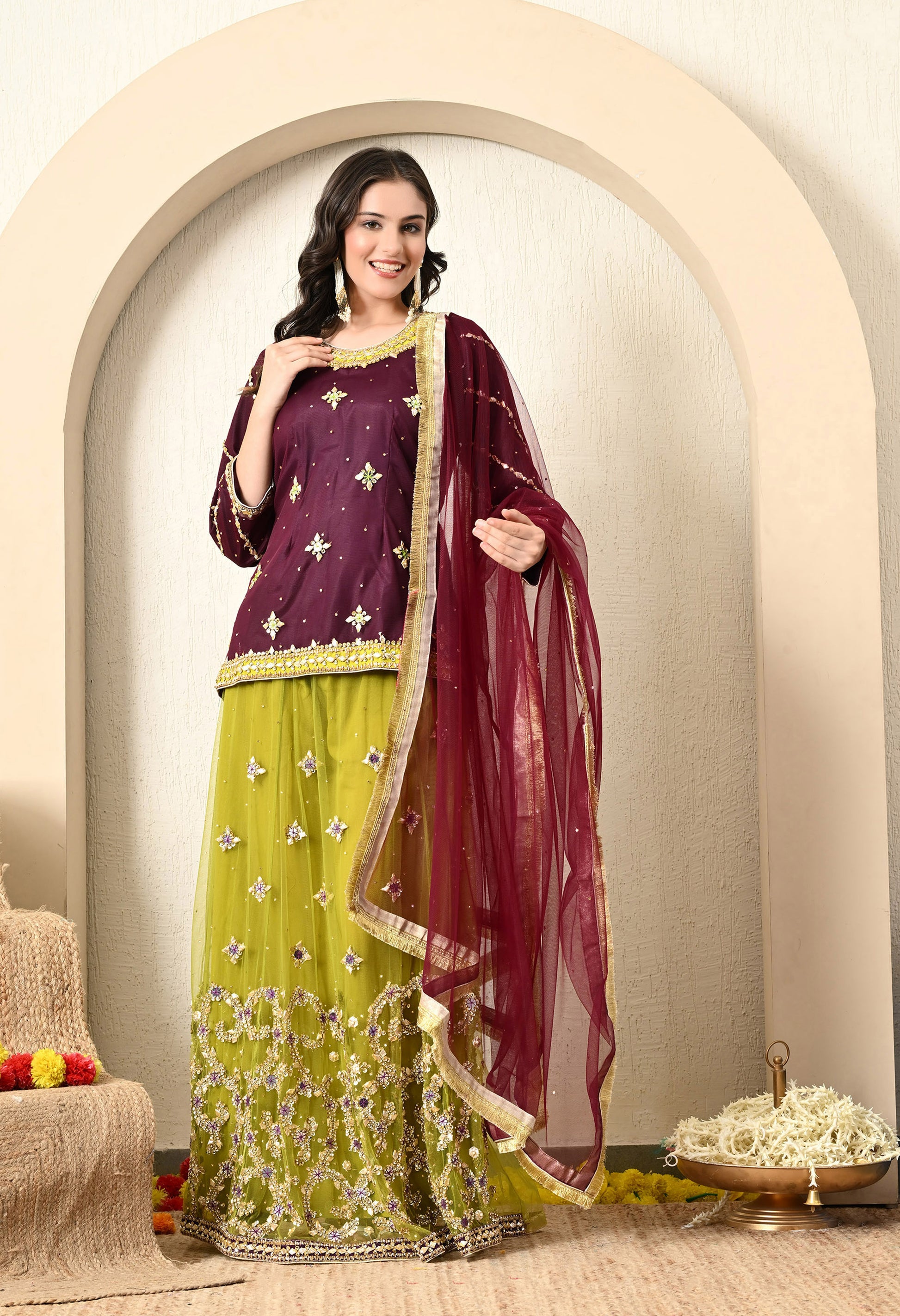 Our exquisite dark wine lehnga set features a net kurti, contrasting green embroidered lehenga, and a net dupatta. Adorned with intricate Gota Patti, Thread, Zardozi, and Zari work, including LCD Gota Patti details on the neck and dupatta. It is perfect to add a touch of elegance to your personality.