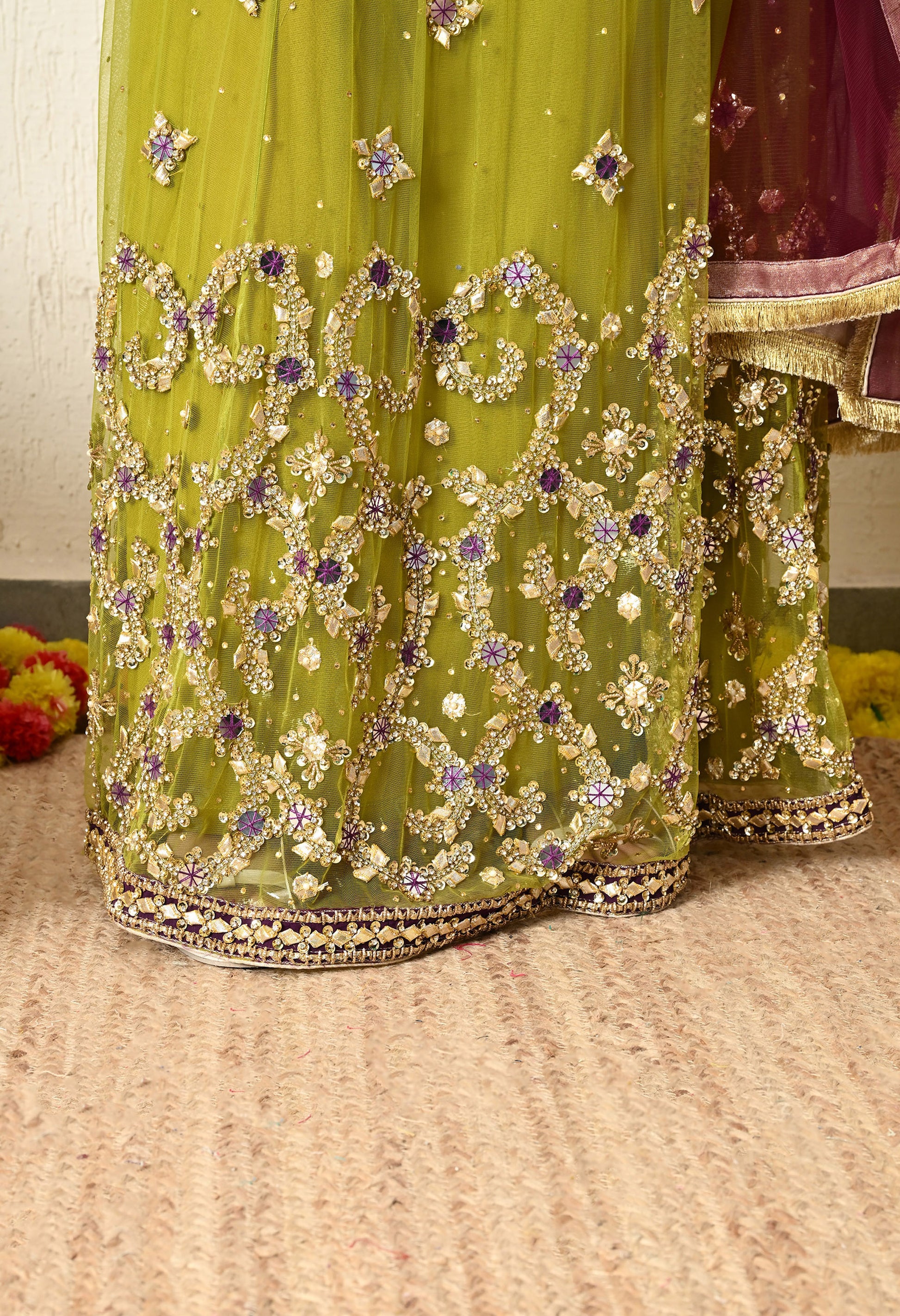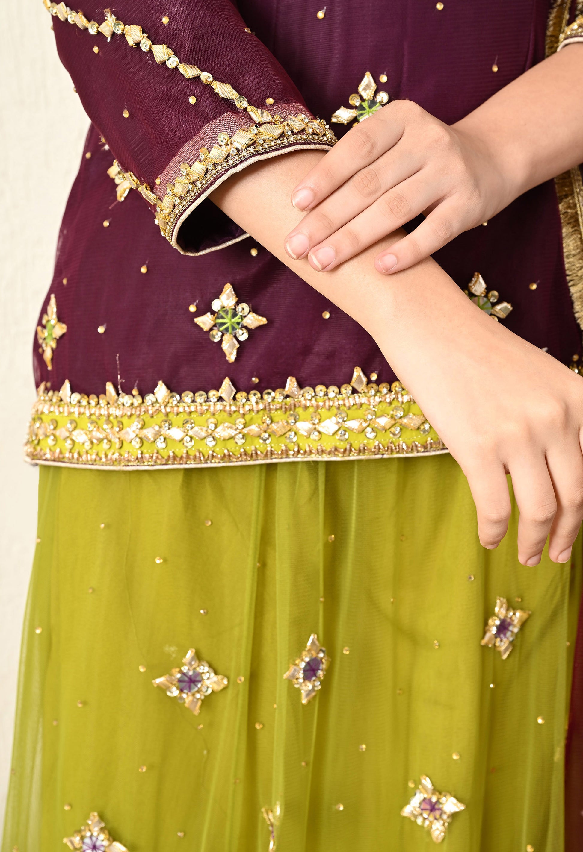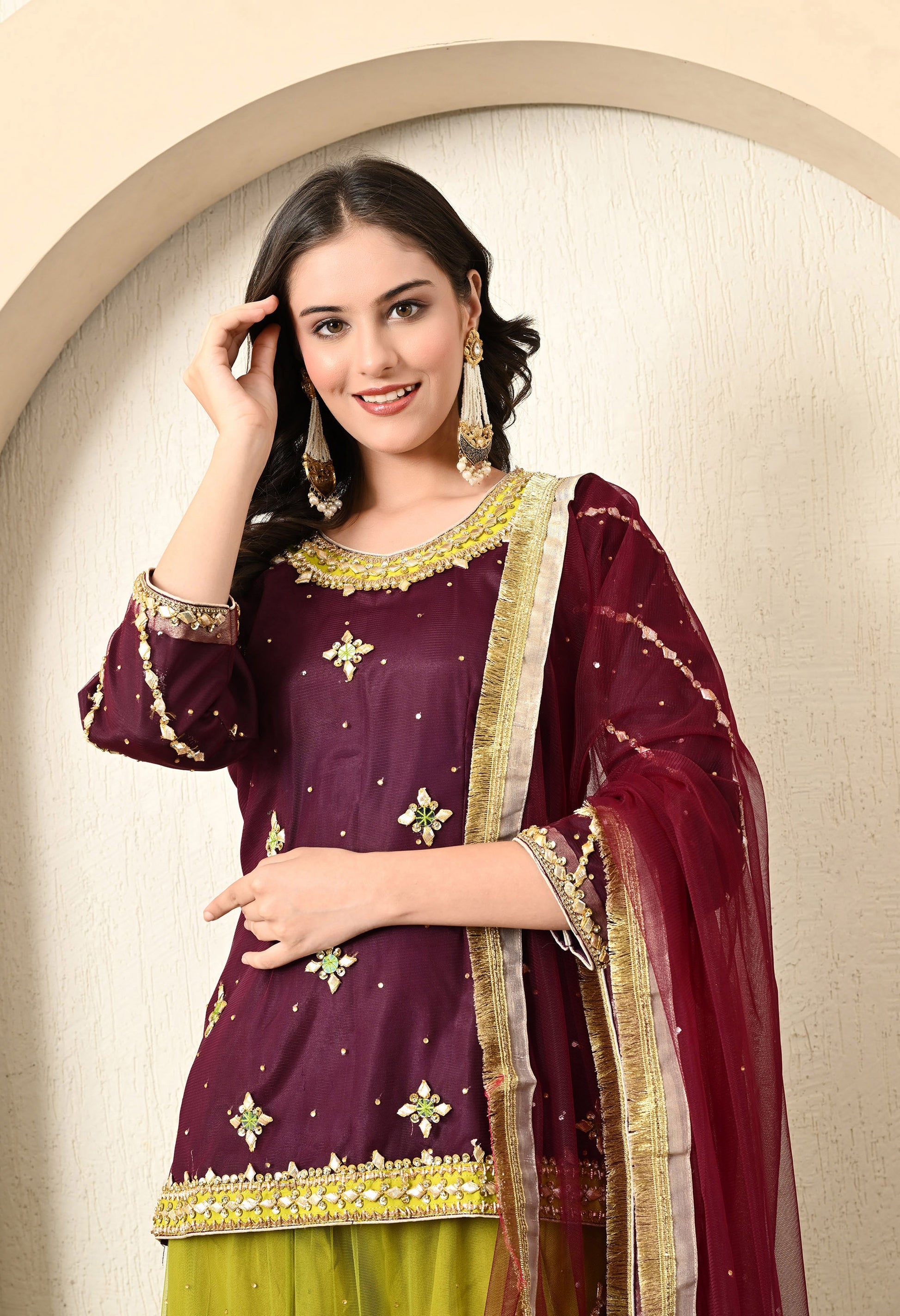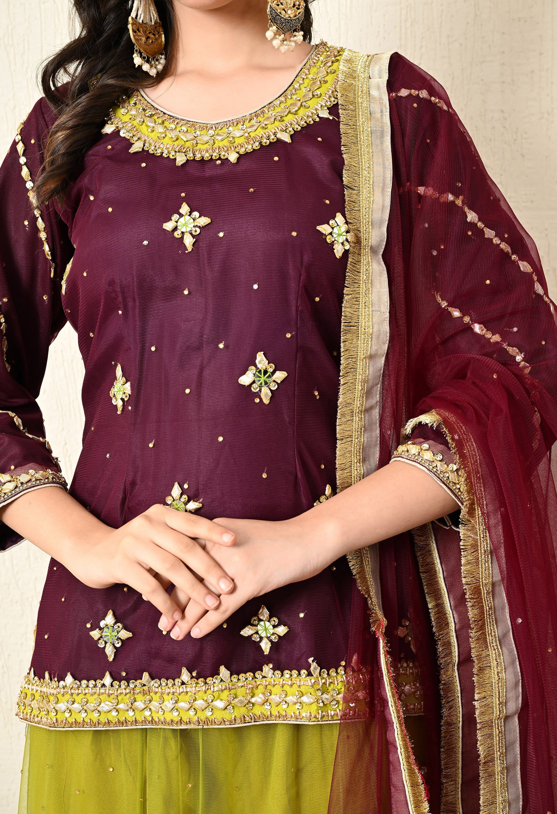 Our exquisite dark wine lehnga set features a net kurti, contrasting green embroidered lehenga, and a net dupatta. Adorned with intricate Gota Patti, Thread, Zardozi, and Zari work, including LCD Gota Patti details on the neck and dupatta. It is perfect to add a touch of elegance to your personality.