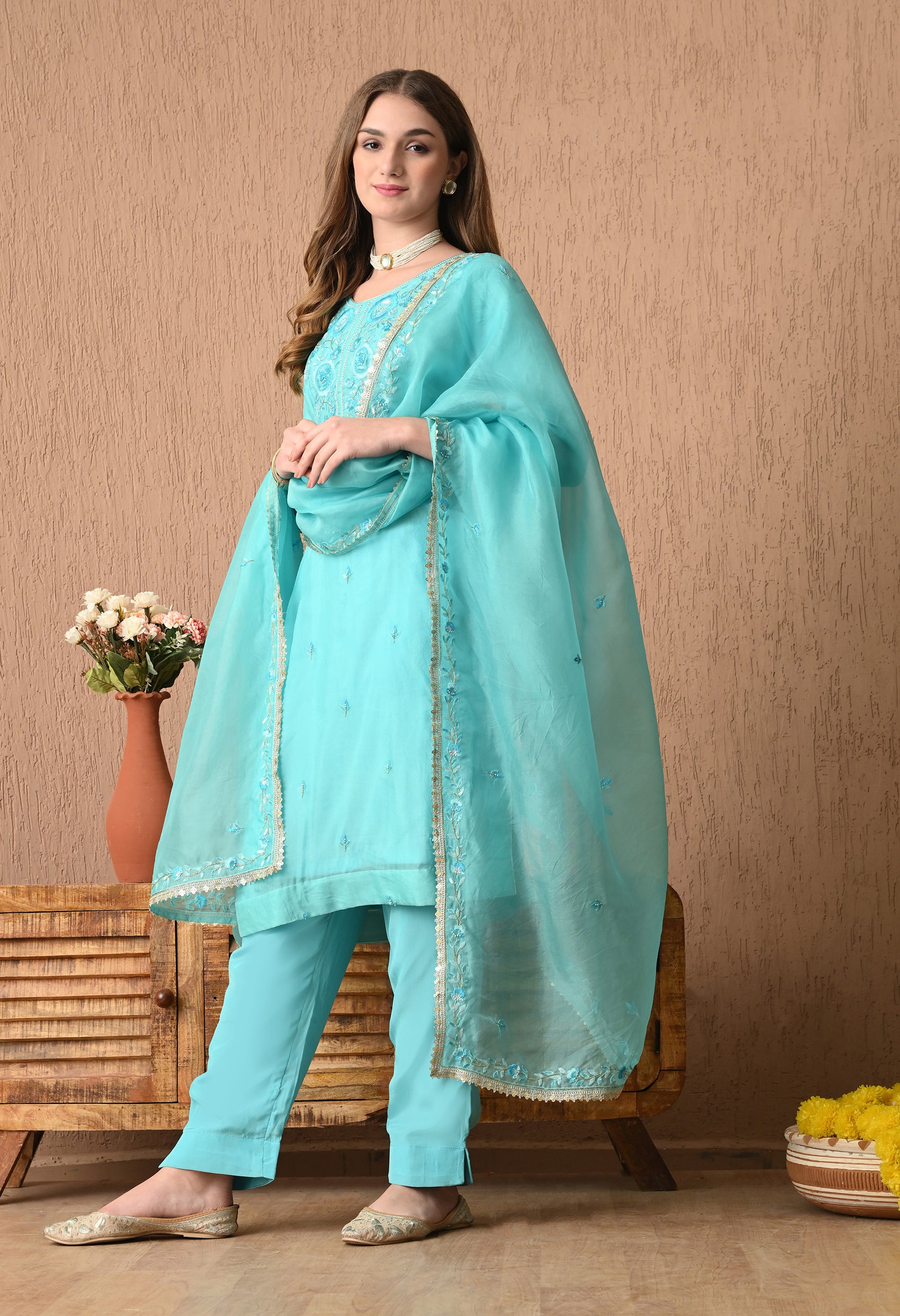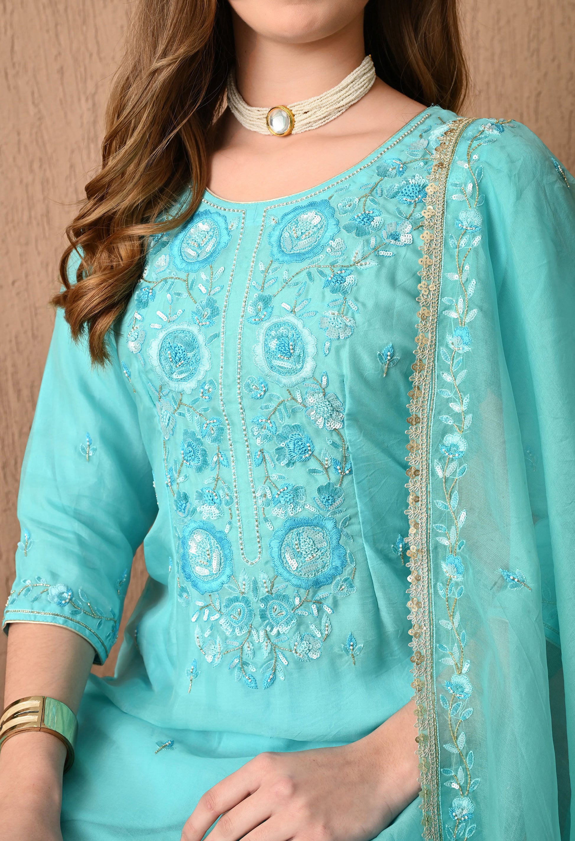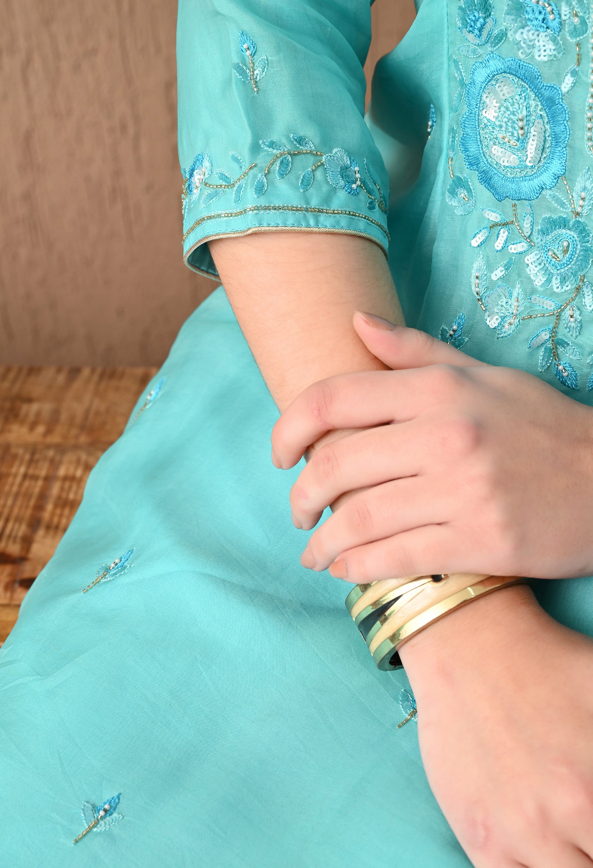 Delicate Baby Blue Organza Kurta Set with Thread, Sequin, and Dabka Embroidery