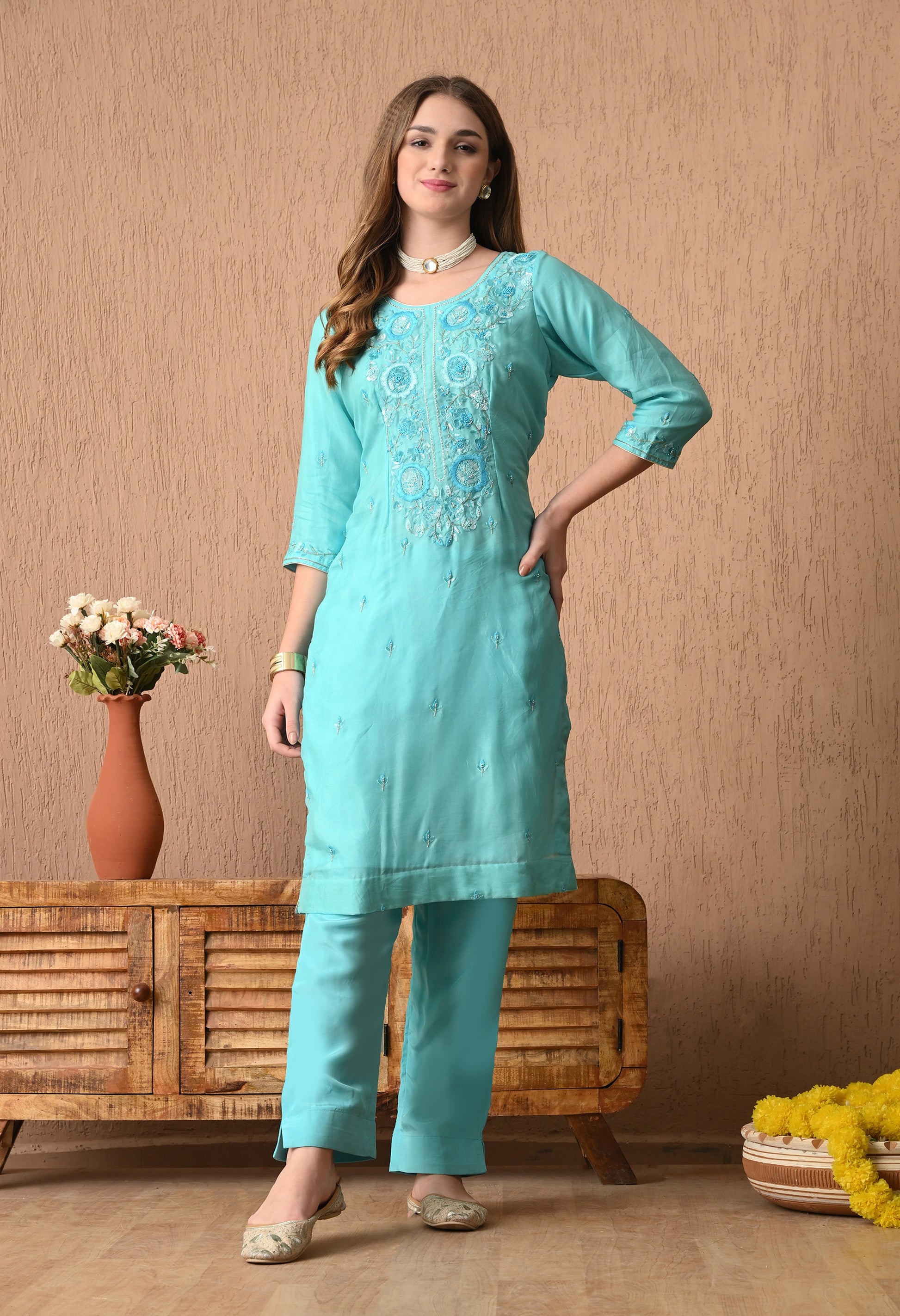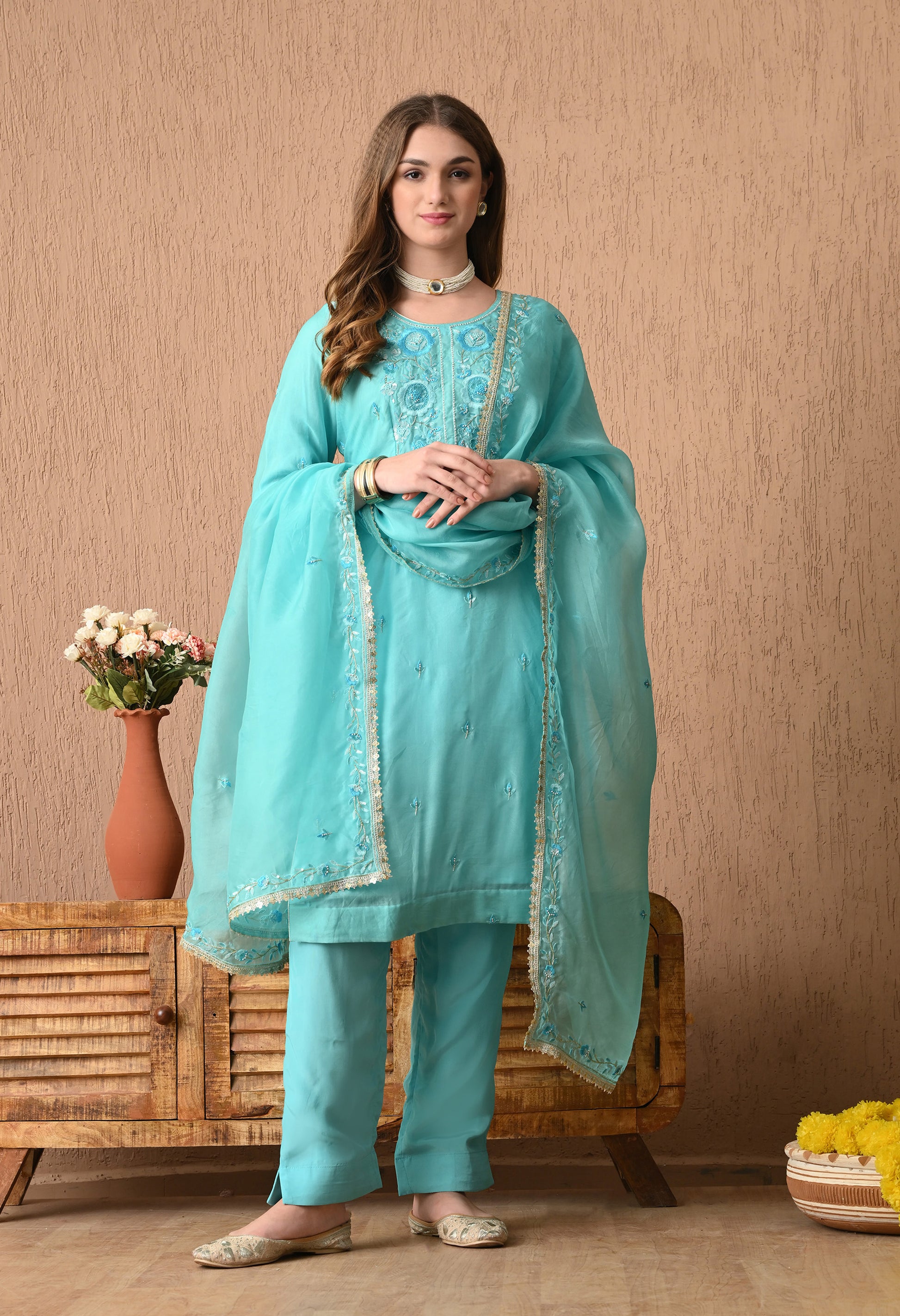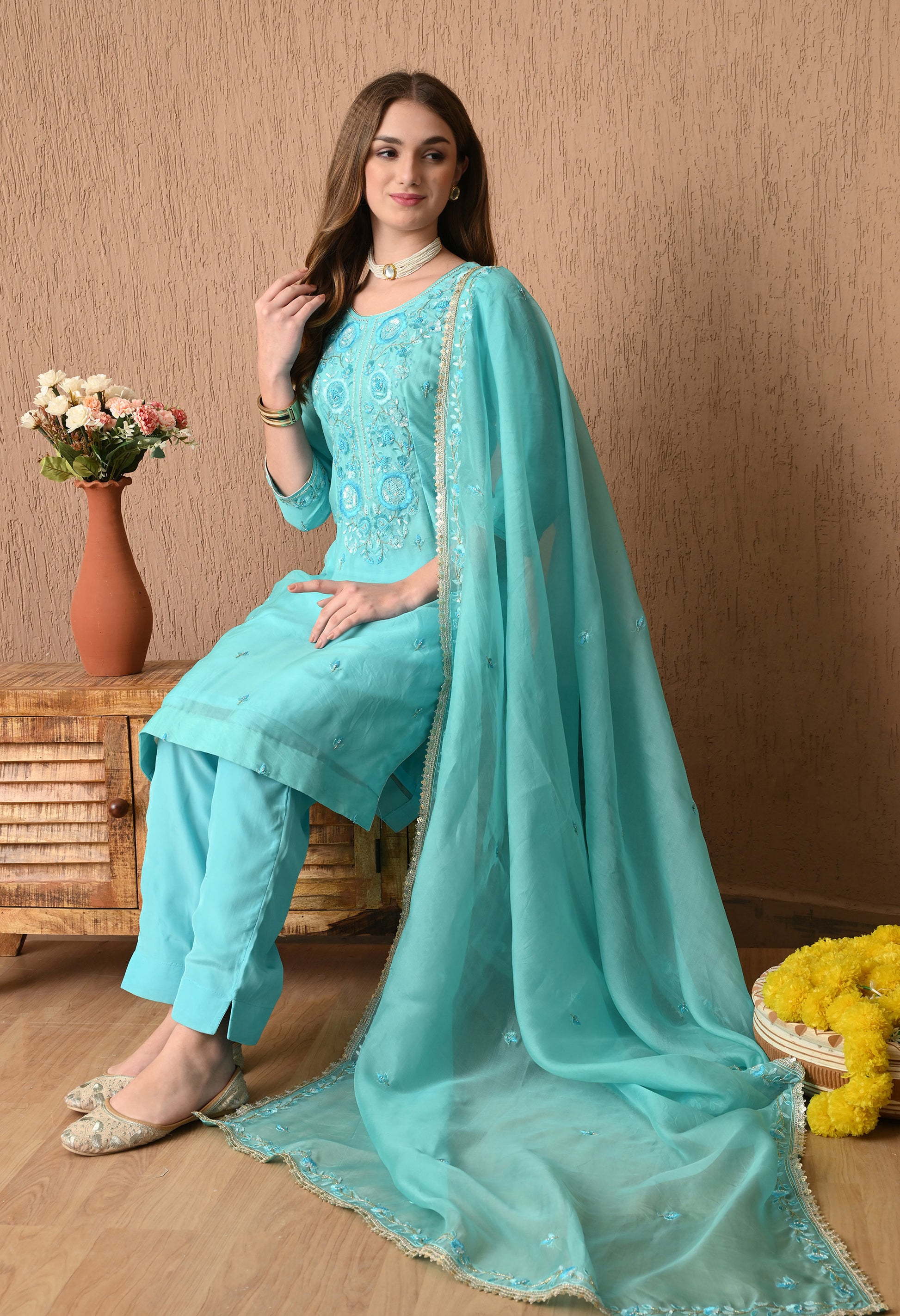 Delicate Baby Blue Organza Kurta Set with Thread, Sequin, and Dabka Embroidery