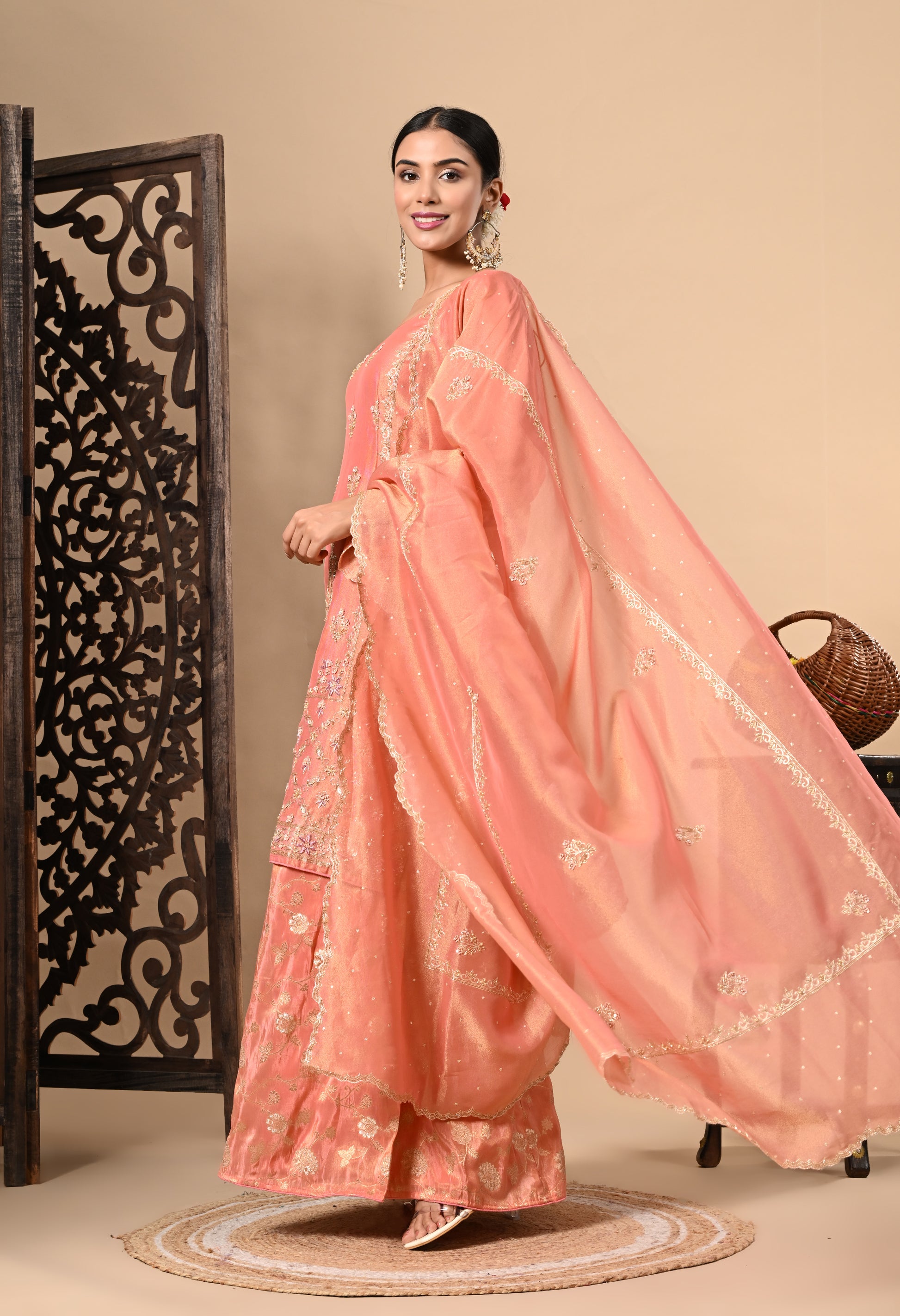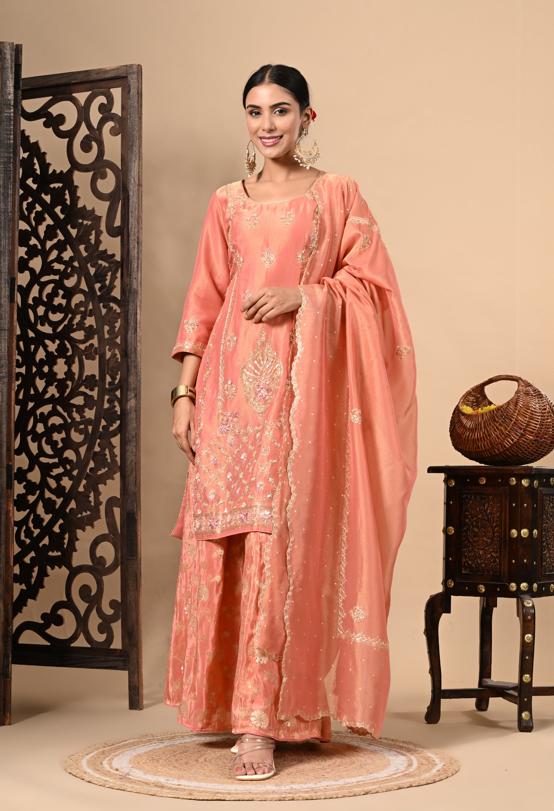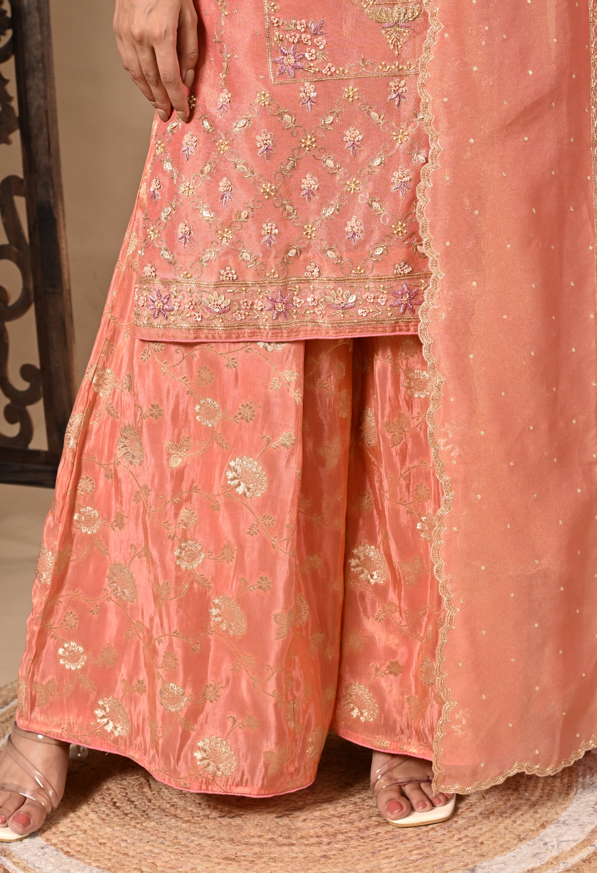 Drak Peach Sharara Set with Zardozi, Dabka, Sequence, and Thread Work