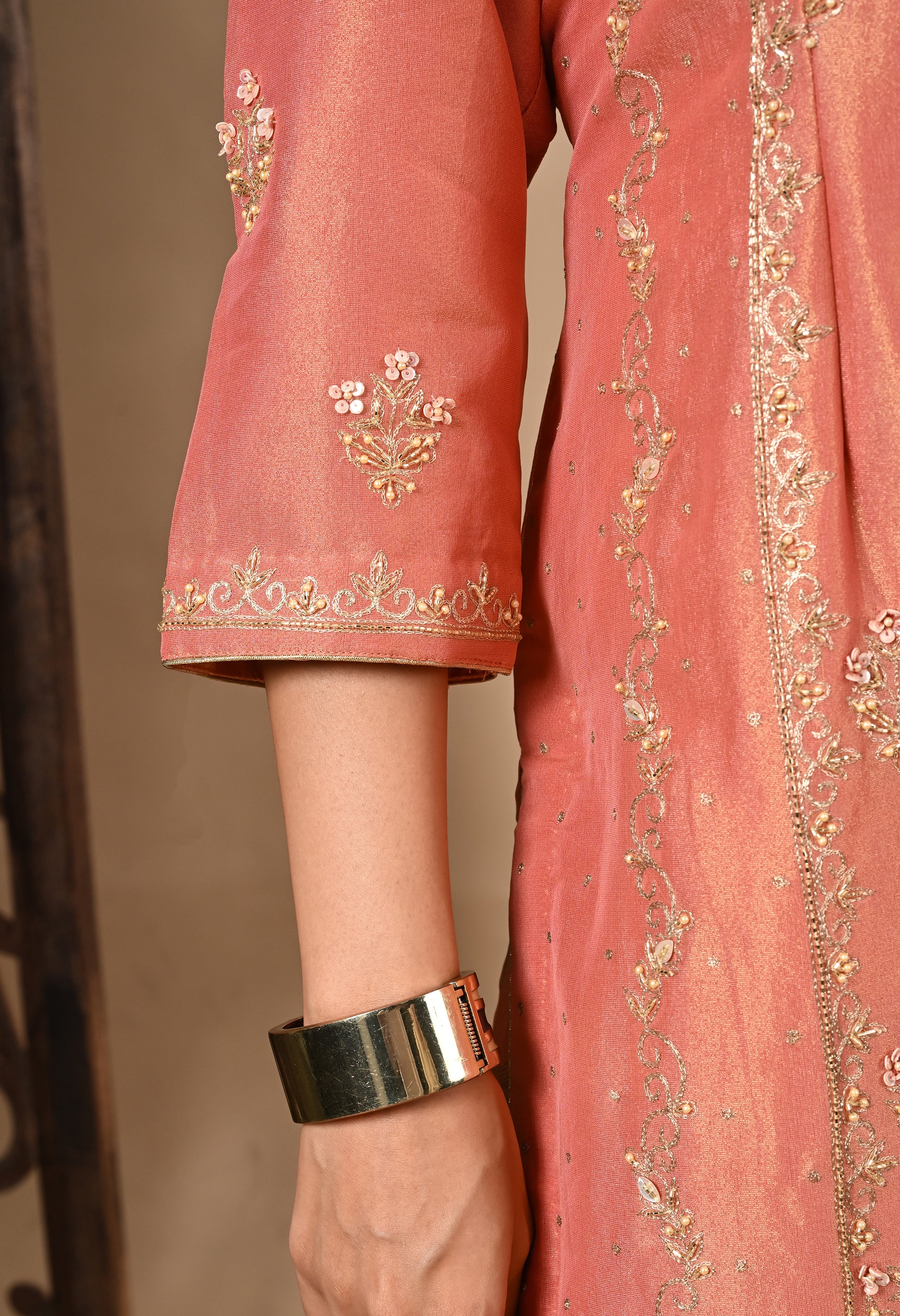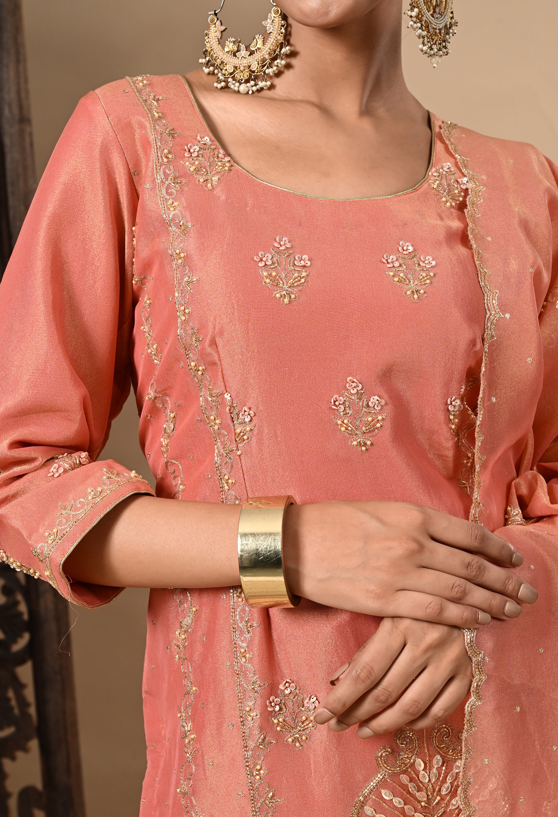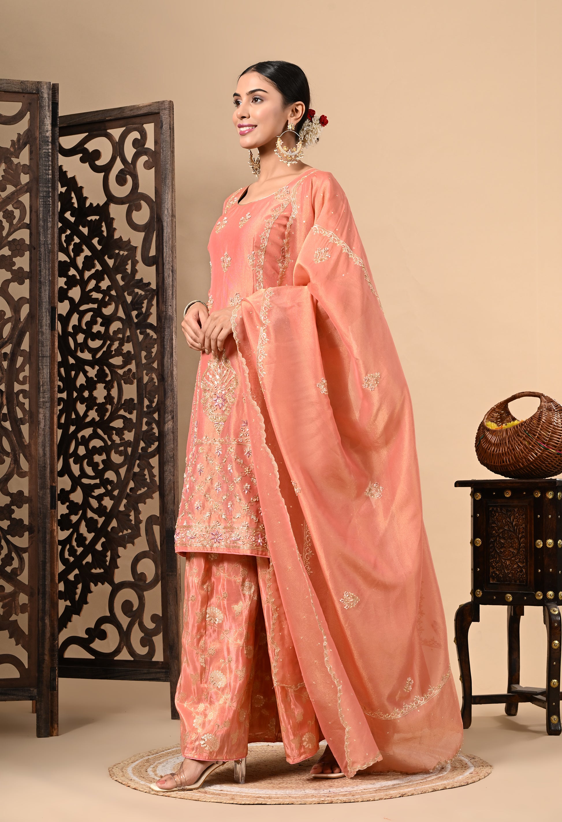 Drak Peach Sharara Set with Zardozi, Dabka, Sequence, and Thread Work