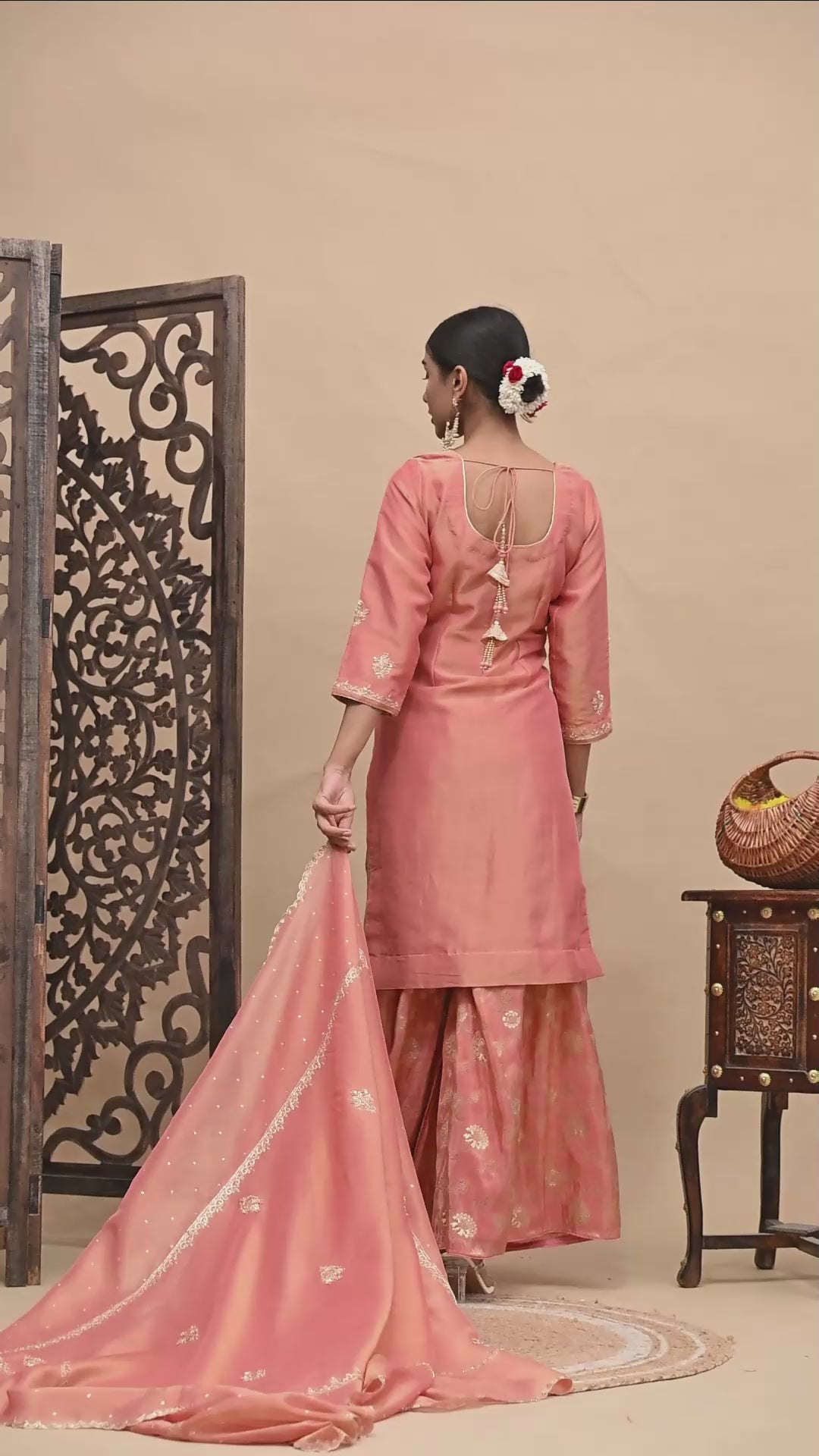 Adorn yourself with grace in our dark peach Sharara Set, styled with a delicate tissue organza dupatta, an embroidered tissue organza kurta, and a complementing banarsi silk sharara. The refined zardozi, dabka, sequin, and thread details add a luxurious touch.