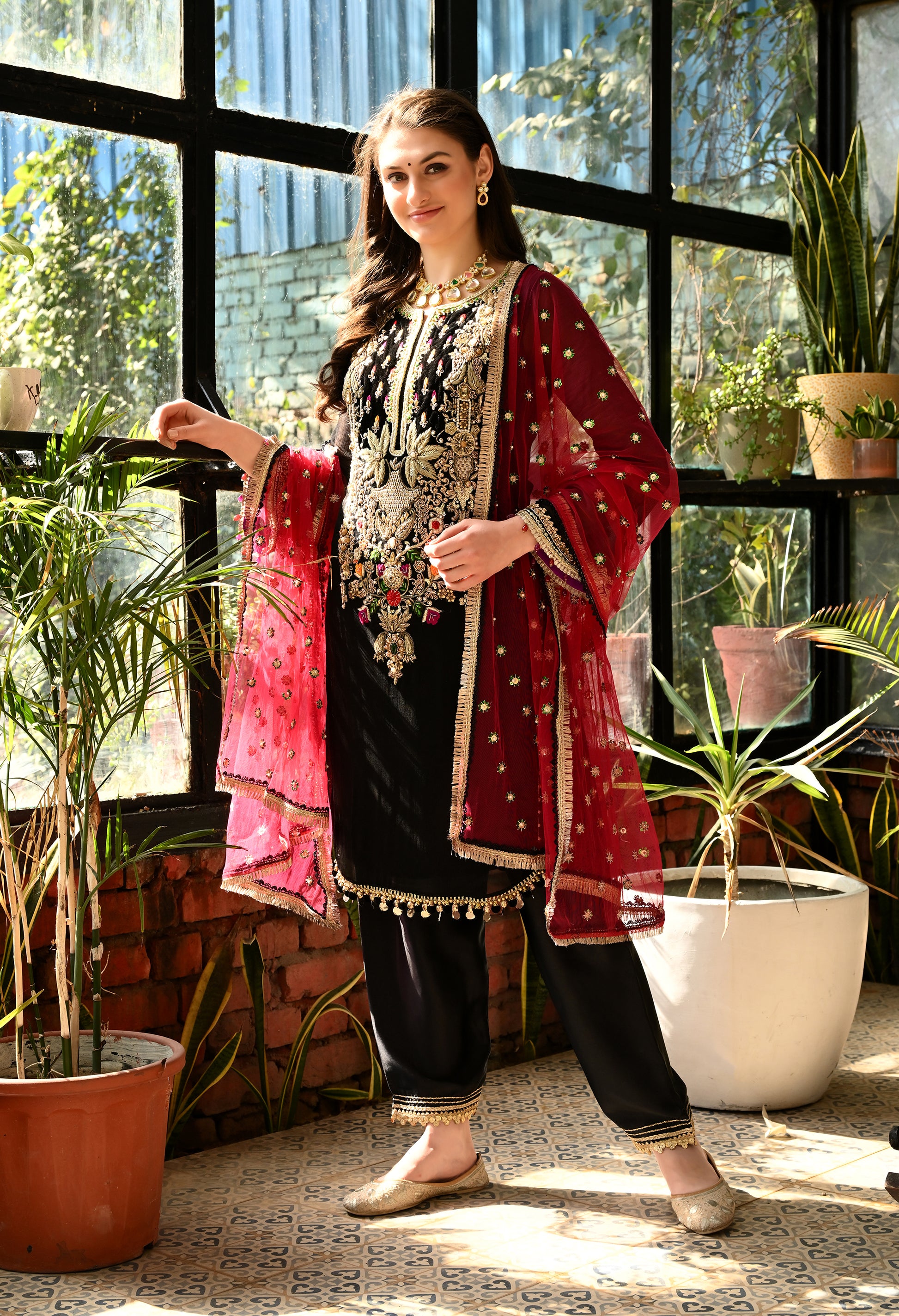 Elevate your wardrobe with our dreamy black Kurta Set, featuring breathtaking hand embroidery and twinkling zardozi, dabka, and resham work. The lightweight chiffon kurta, net duppatta, and silk bottom ensemble flows with unmatched elegance.
