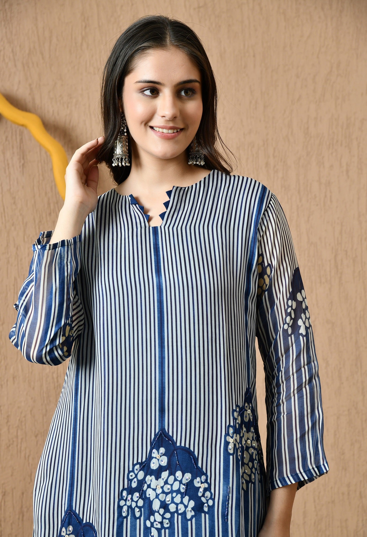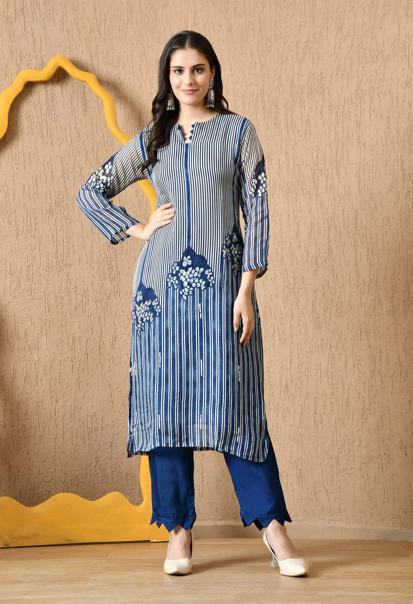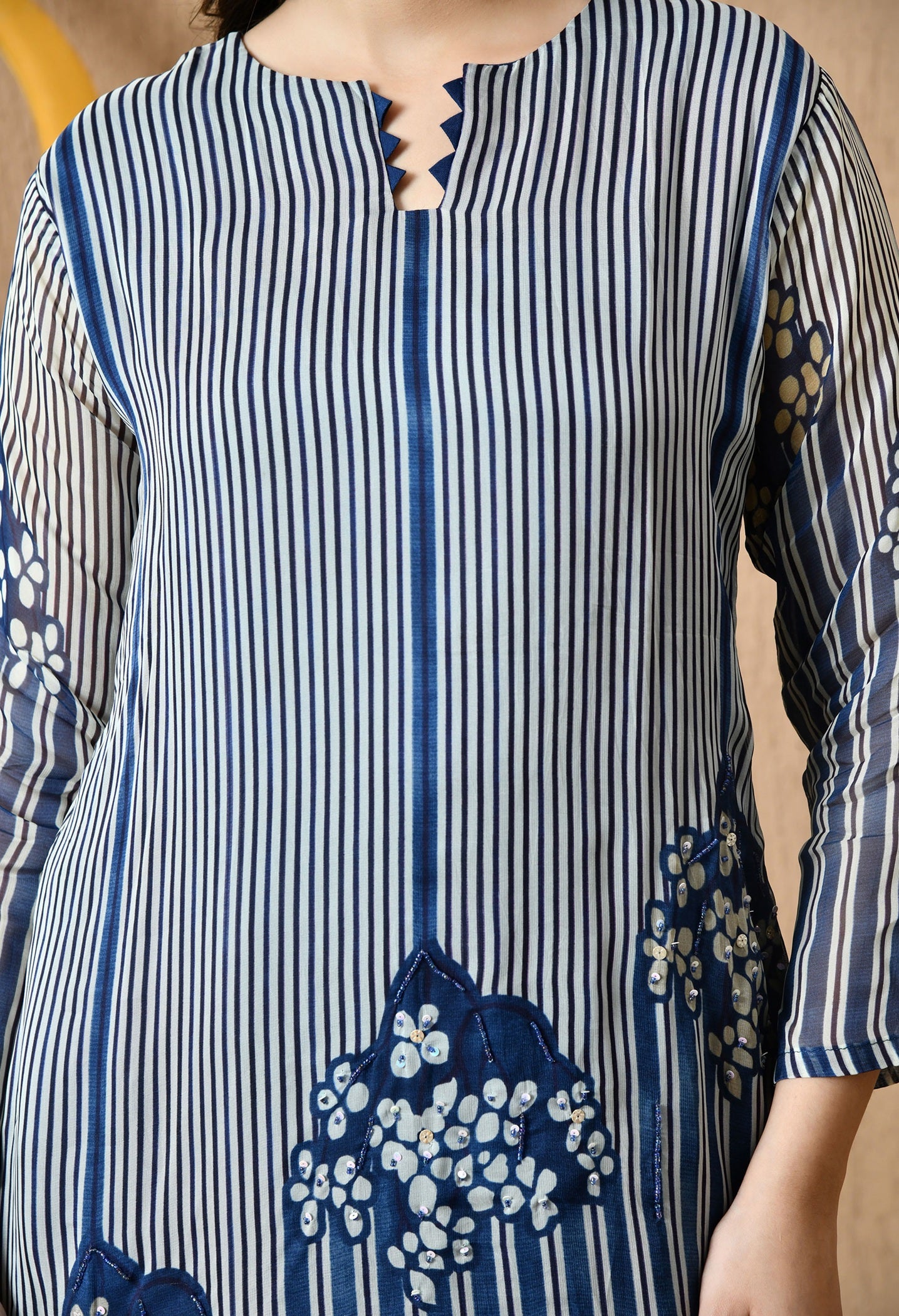 - Elegant and eye-catching, this blue kurta set features delicate sequin and pearl embellishments.