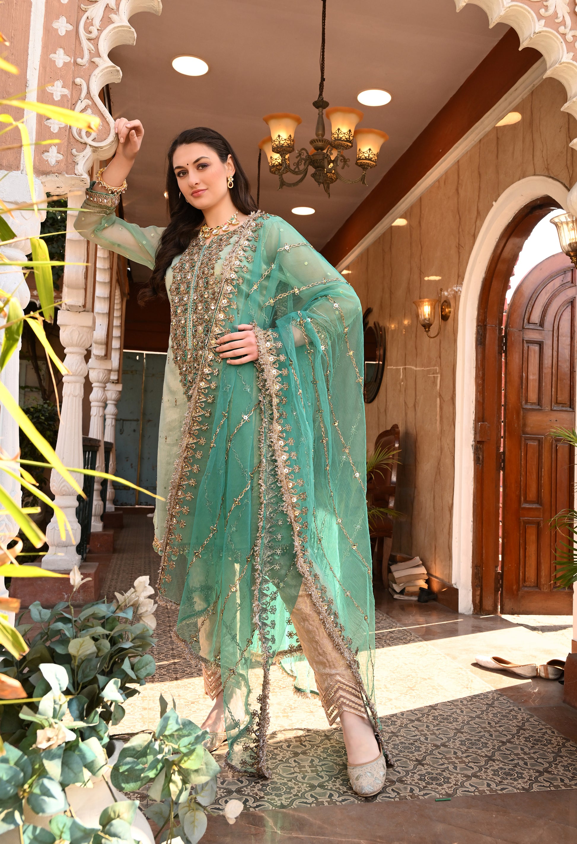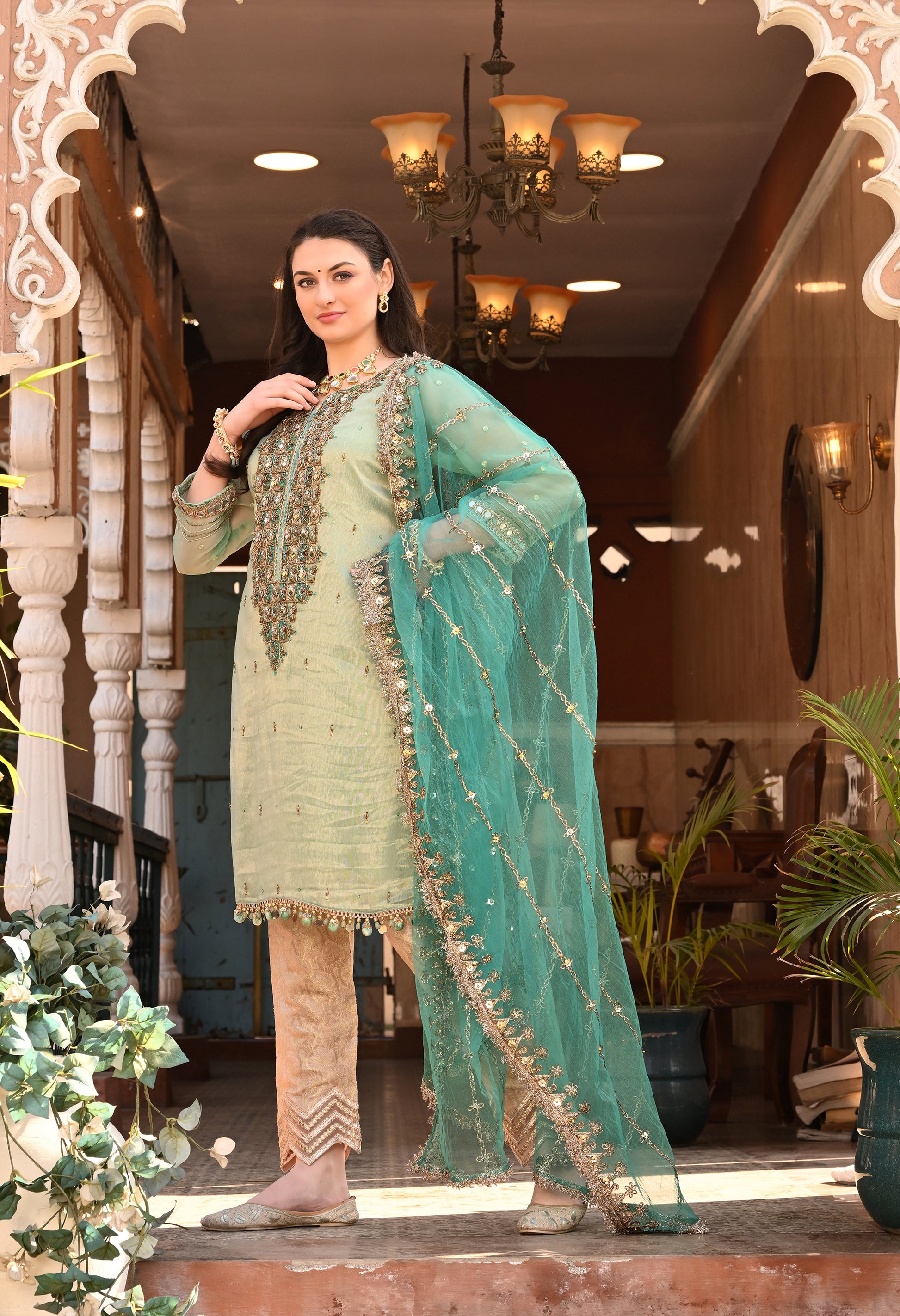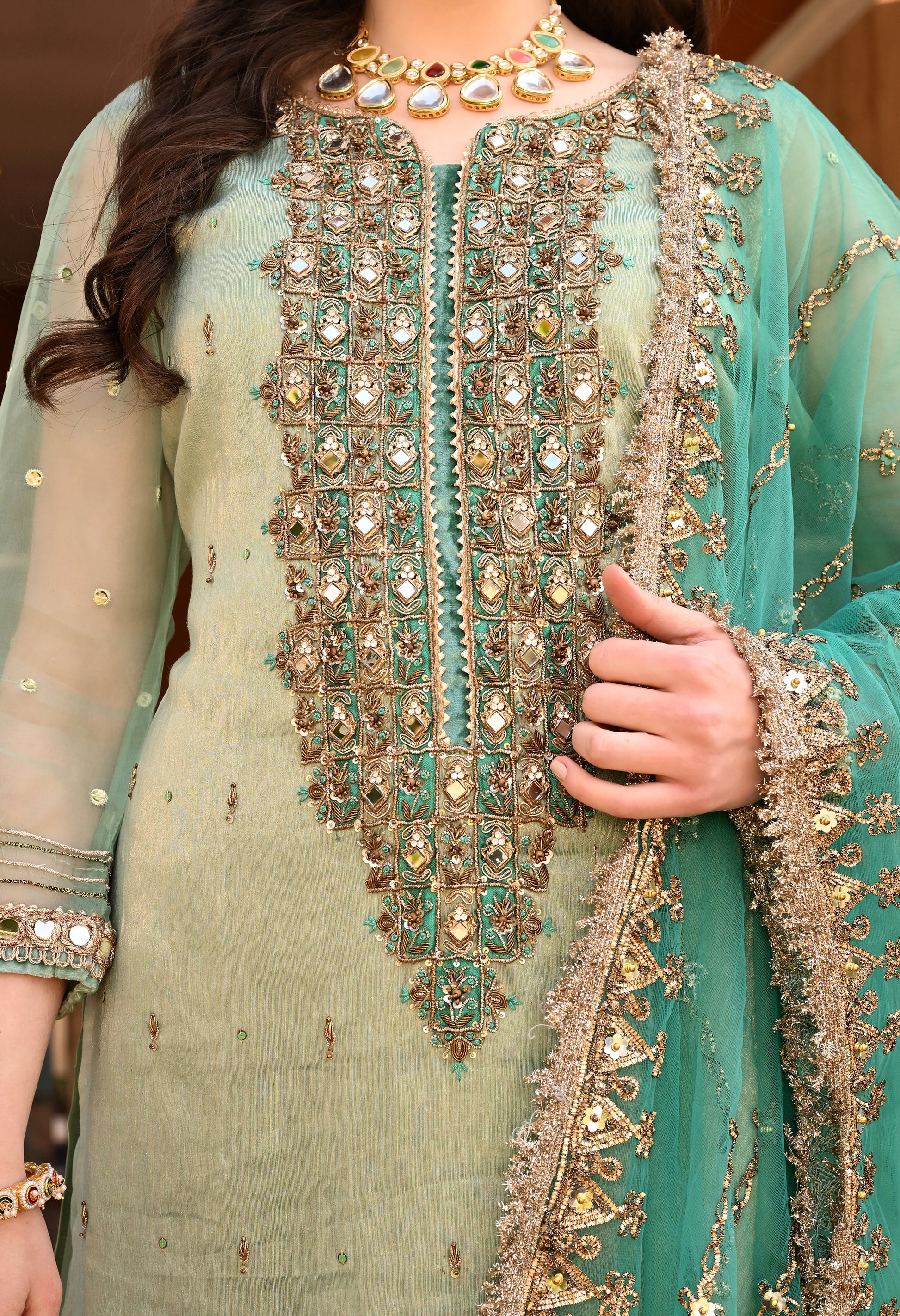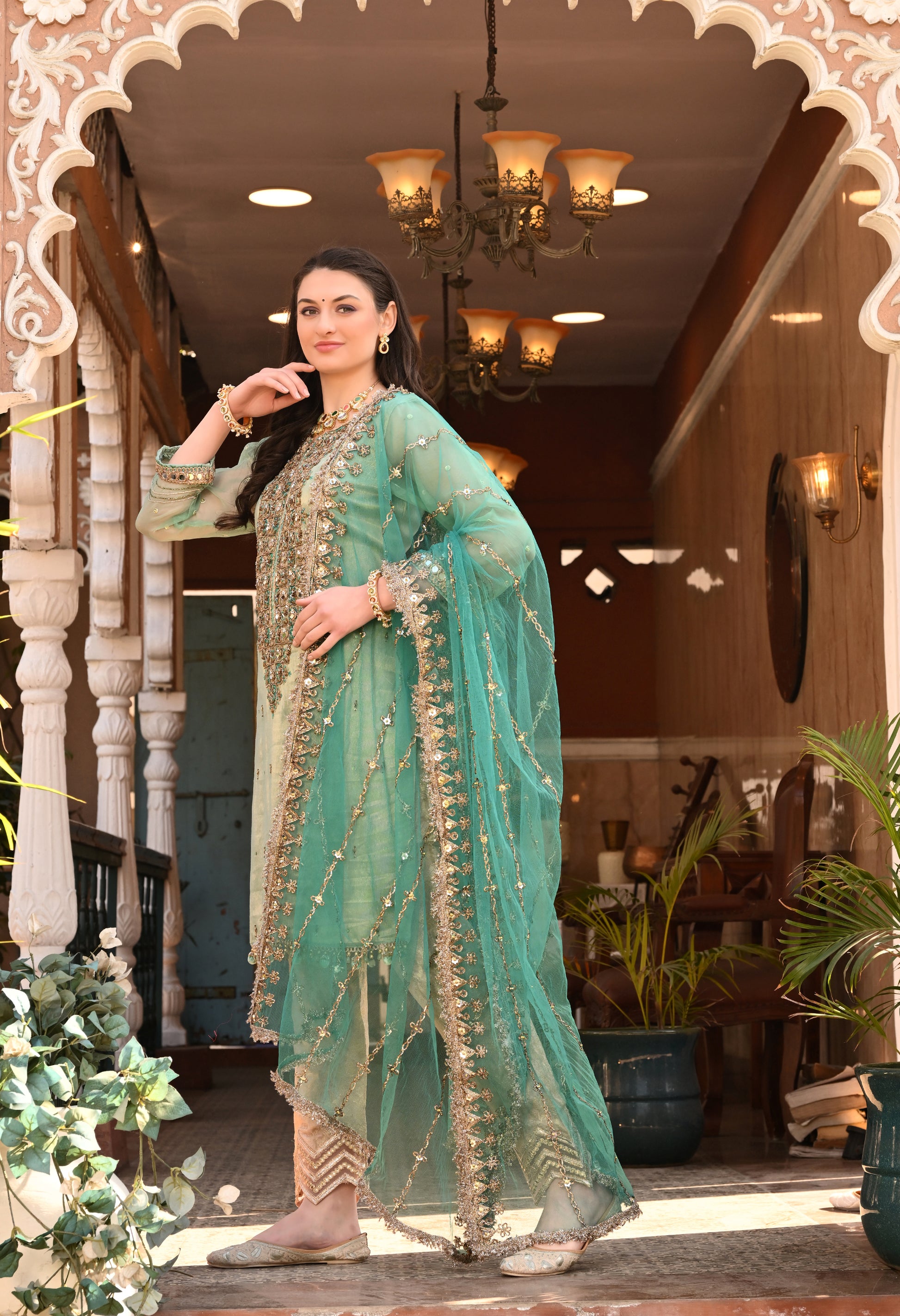 Bask in the splendor of tradition with our exquisite green Kurta Set, designed with intricate hand embroidery and delicate gota patti, dabka, and mirror work. The airy silk resham kurta, net dupatta, and jamawar bottom reflect effortless grace.