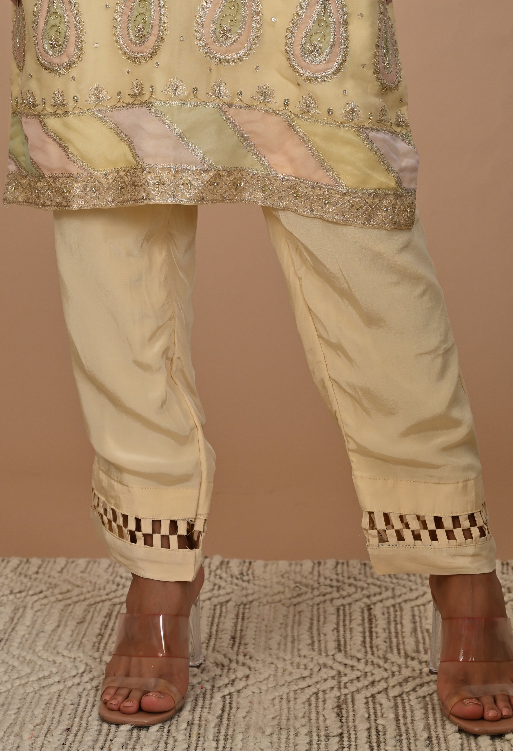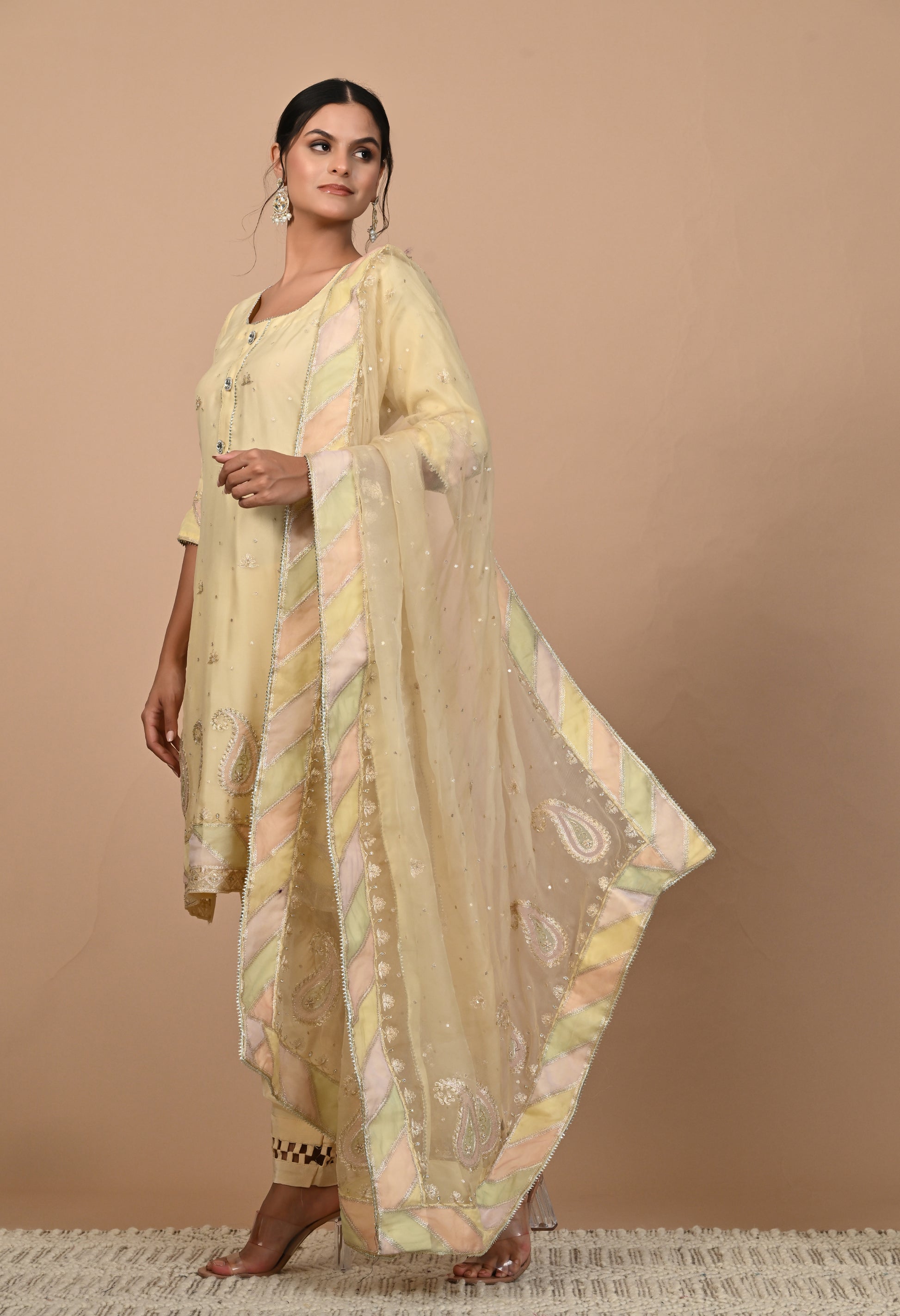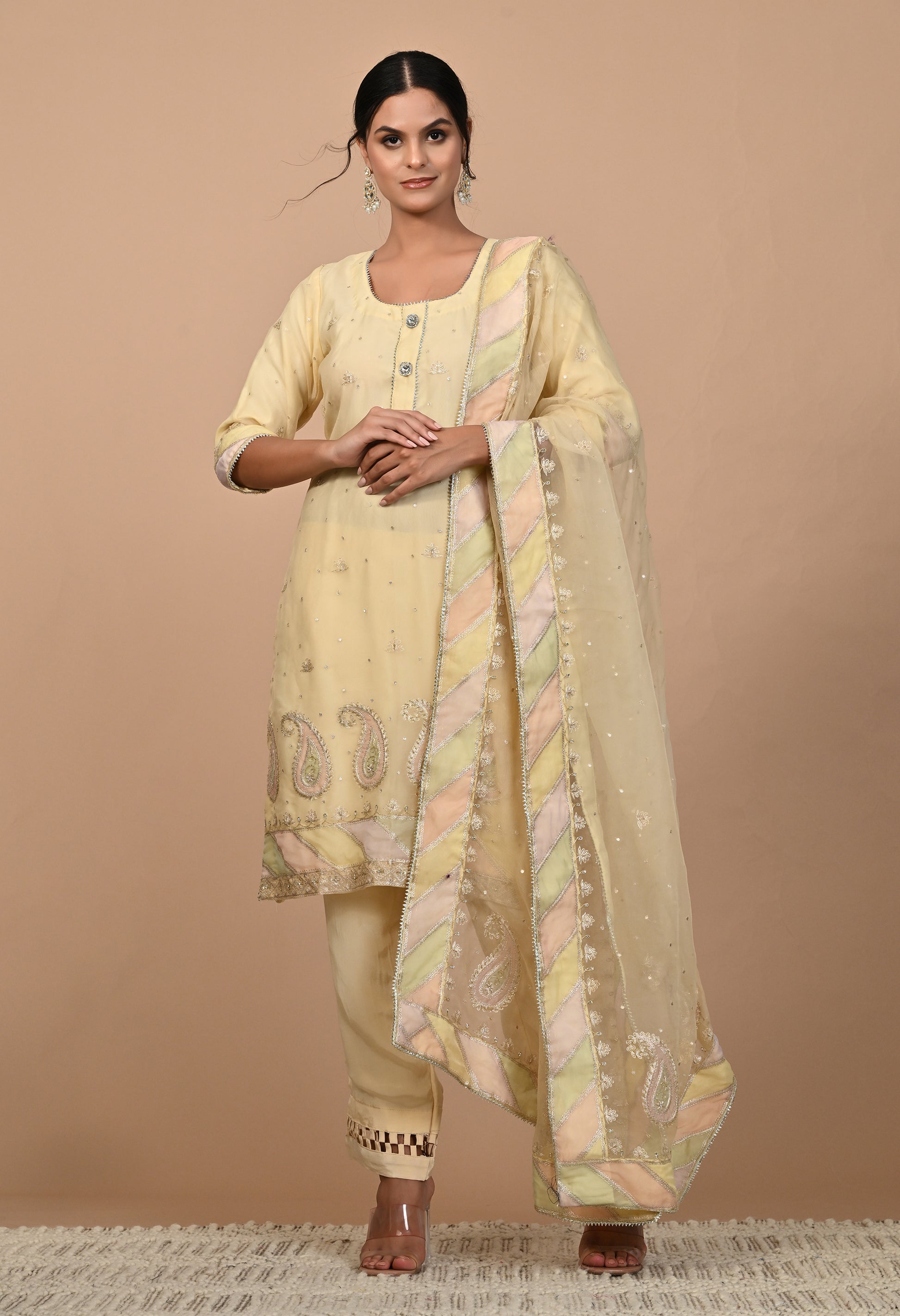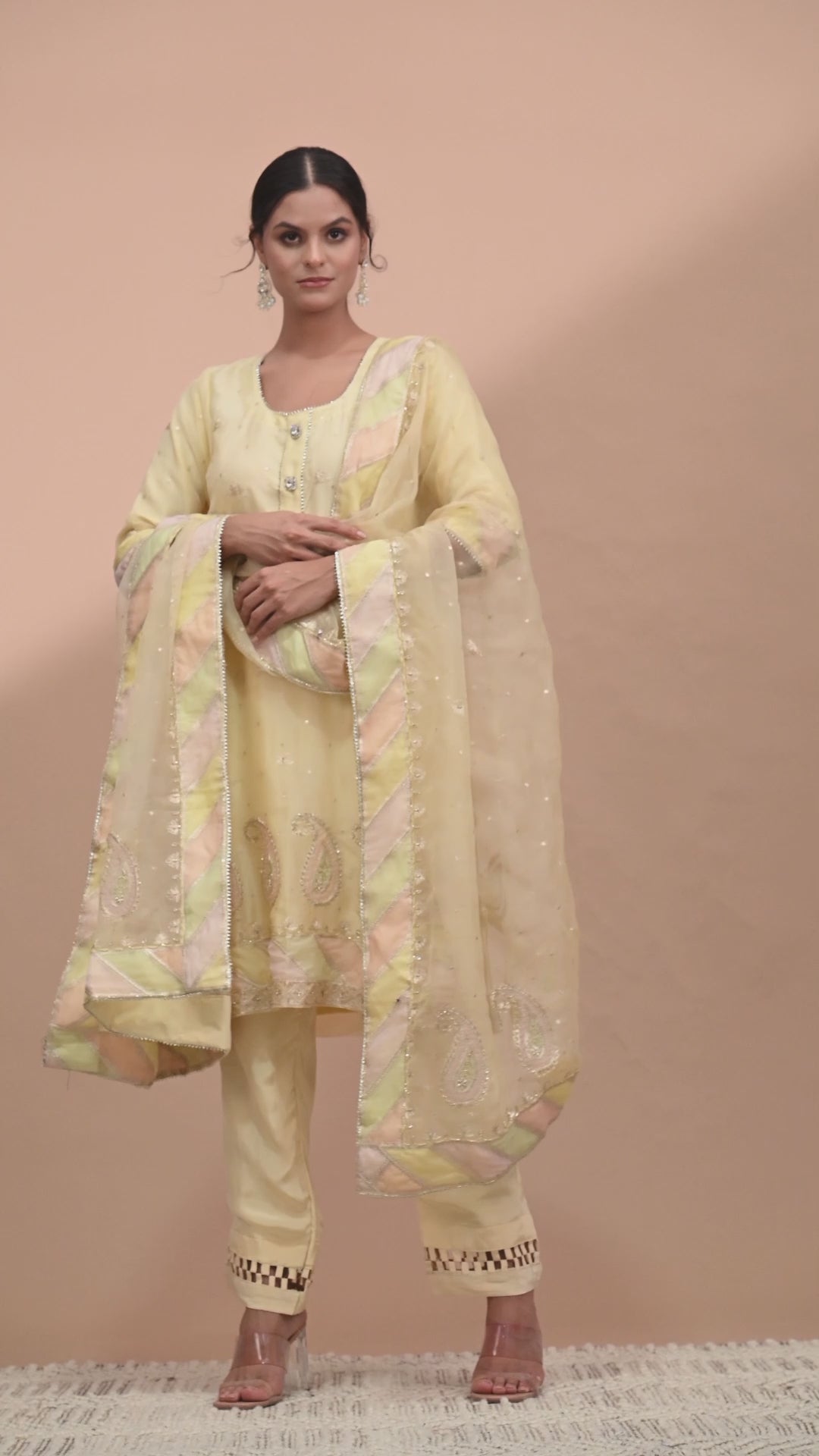 Unveil your royal elegance with our captivating light yellow Kurta Set. This ensemble features a sleek crepe kurta, matching crepe straight pants, and an organza dupatta, all meticulously detailed with zardozi and applique work. The elaborate embroidery enhances your graceful presence.