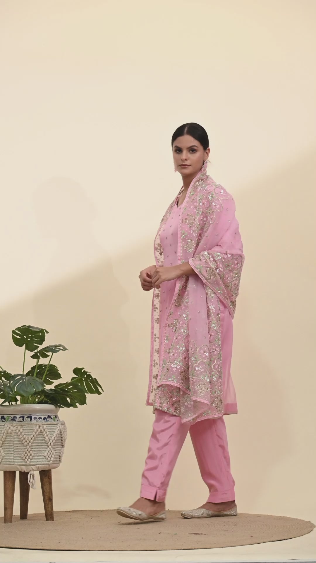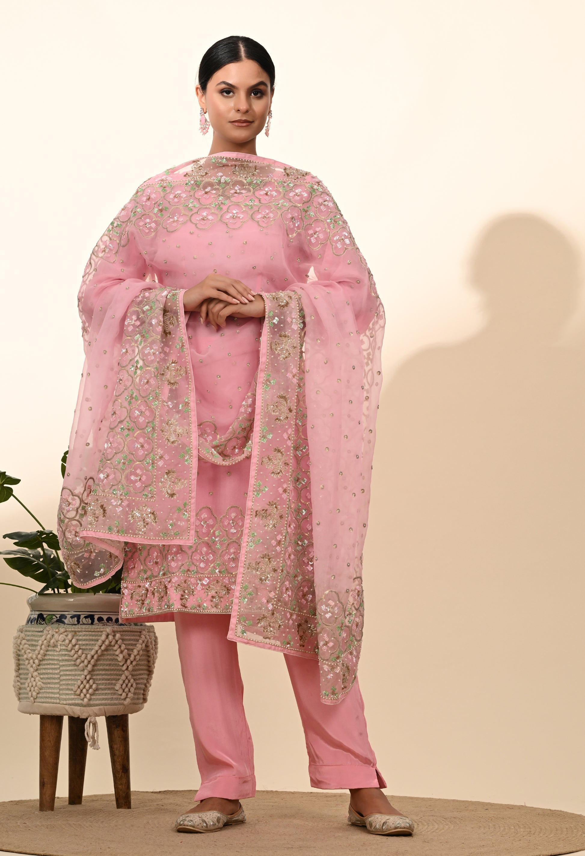 Level up your everyday style with our exquisite Kurta Set, featuring refined embroidery on lush organza fabric. The kurta in a delicate onion pink shade pairs beautifully with a matching organza dupatta and a crepe bottom, all embellished with subtle detailing. Crafted for effortless sophistication, this set is a perfect addition to your collection