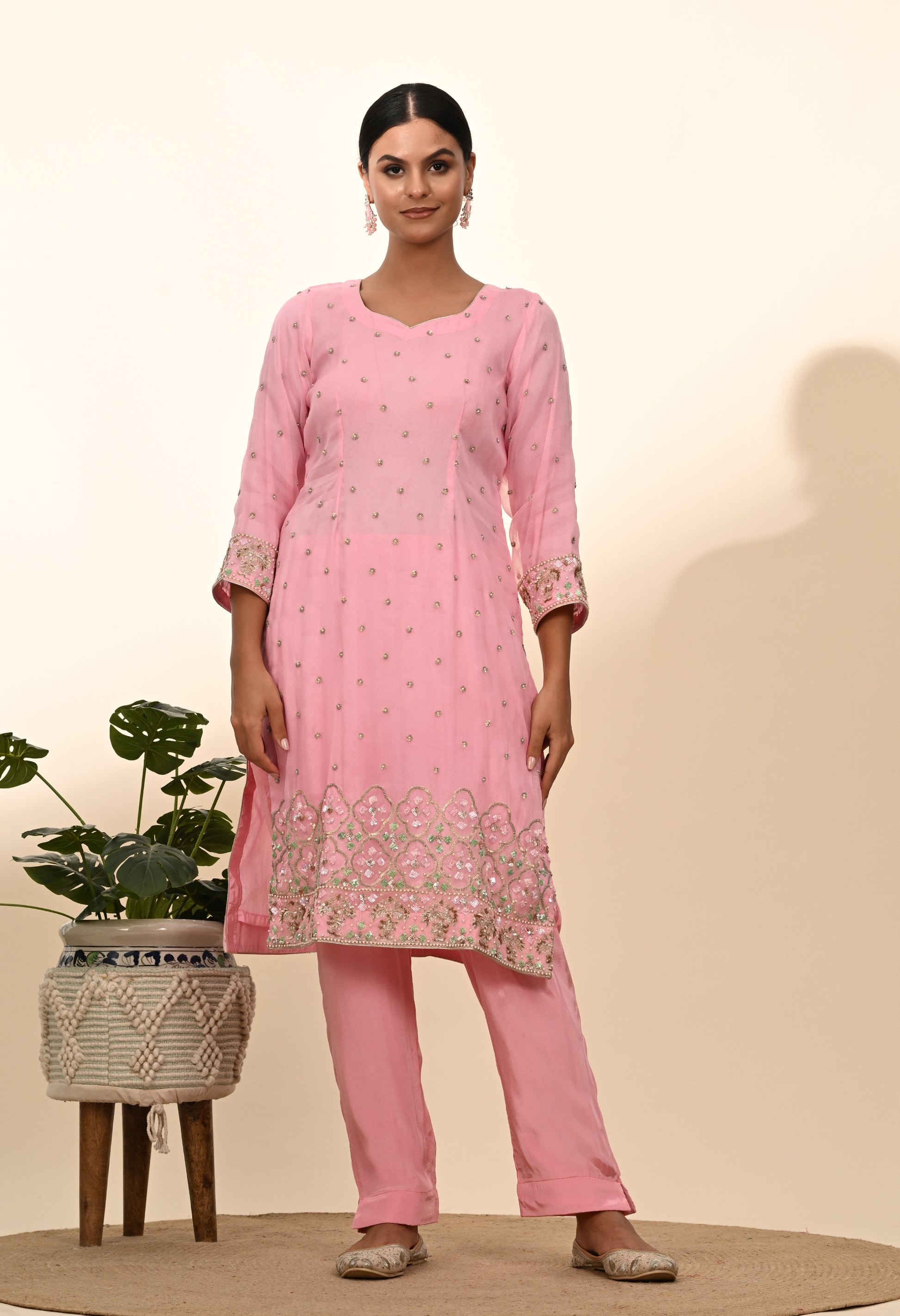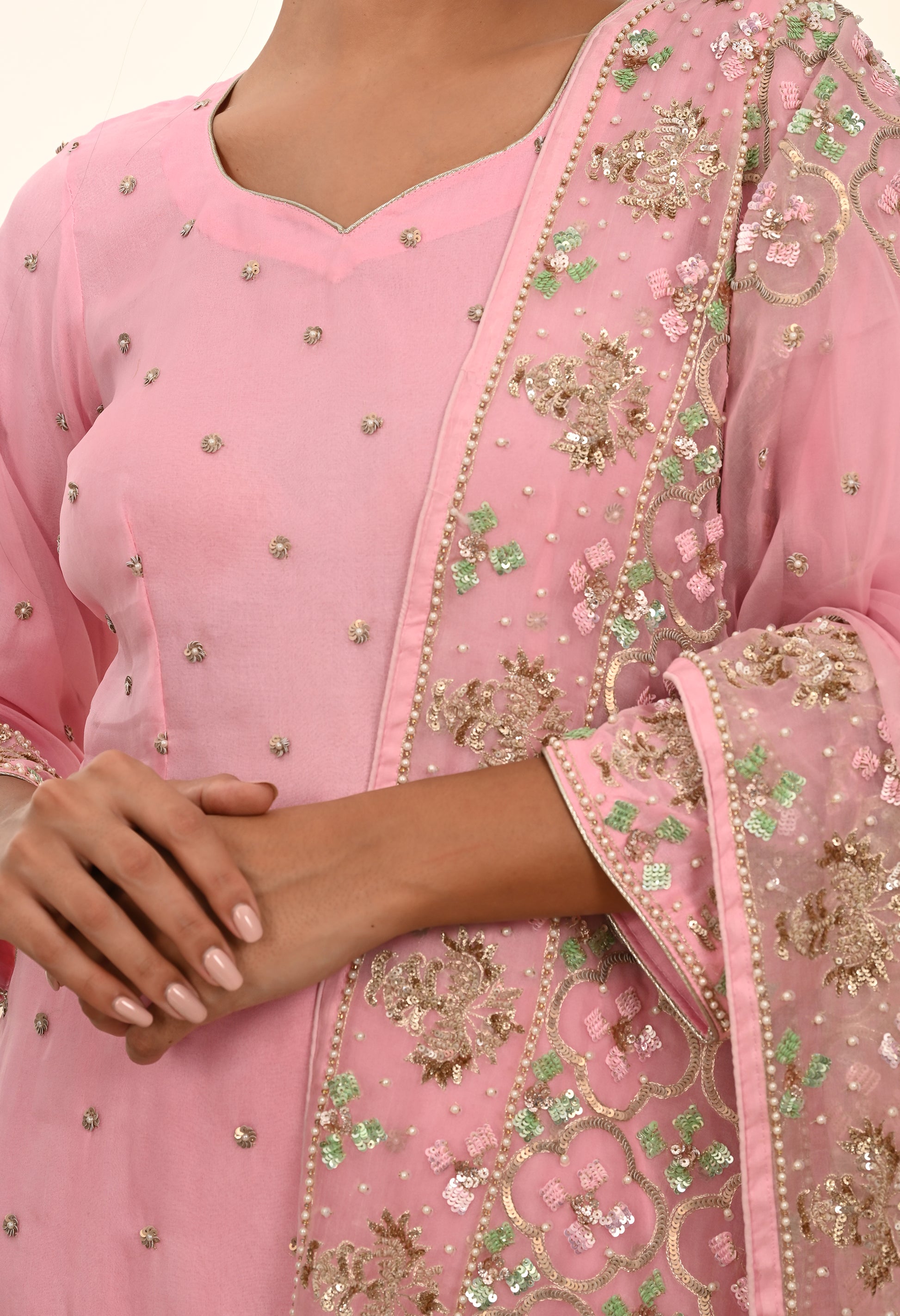 Elegant Onion Pink Organza Kurta Set with Sequin and Thread Embroidery