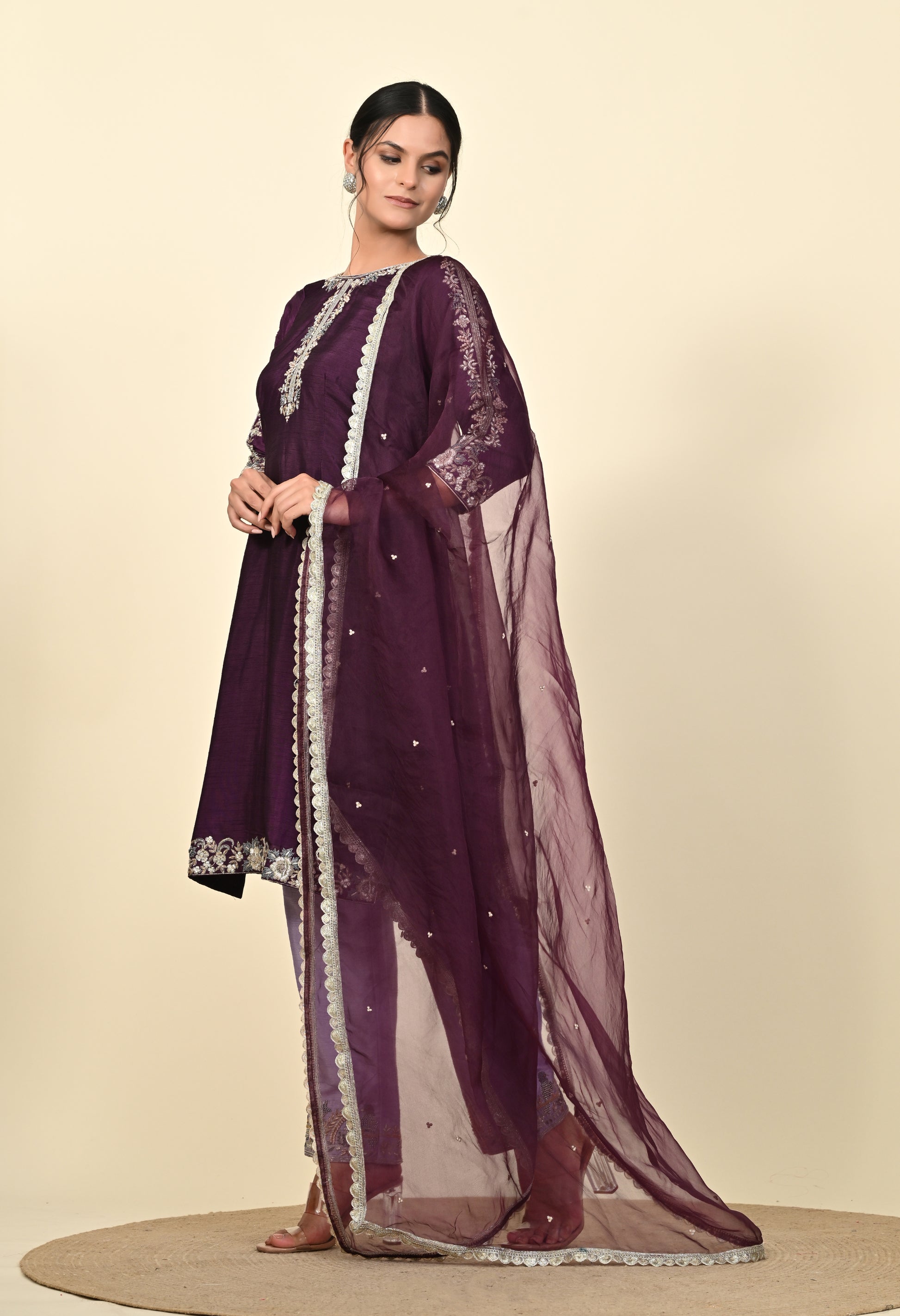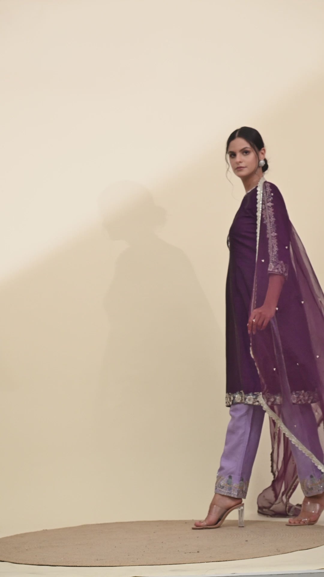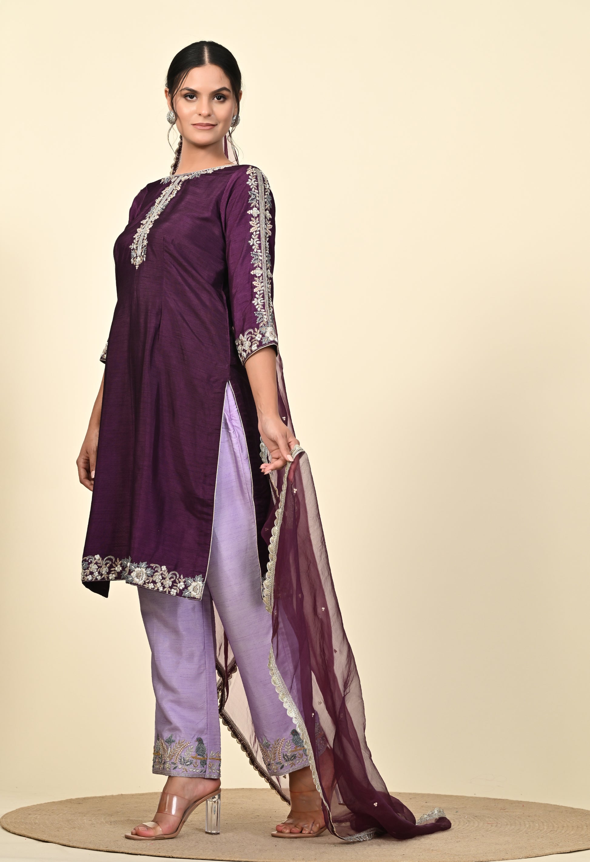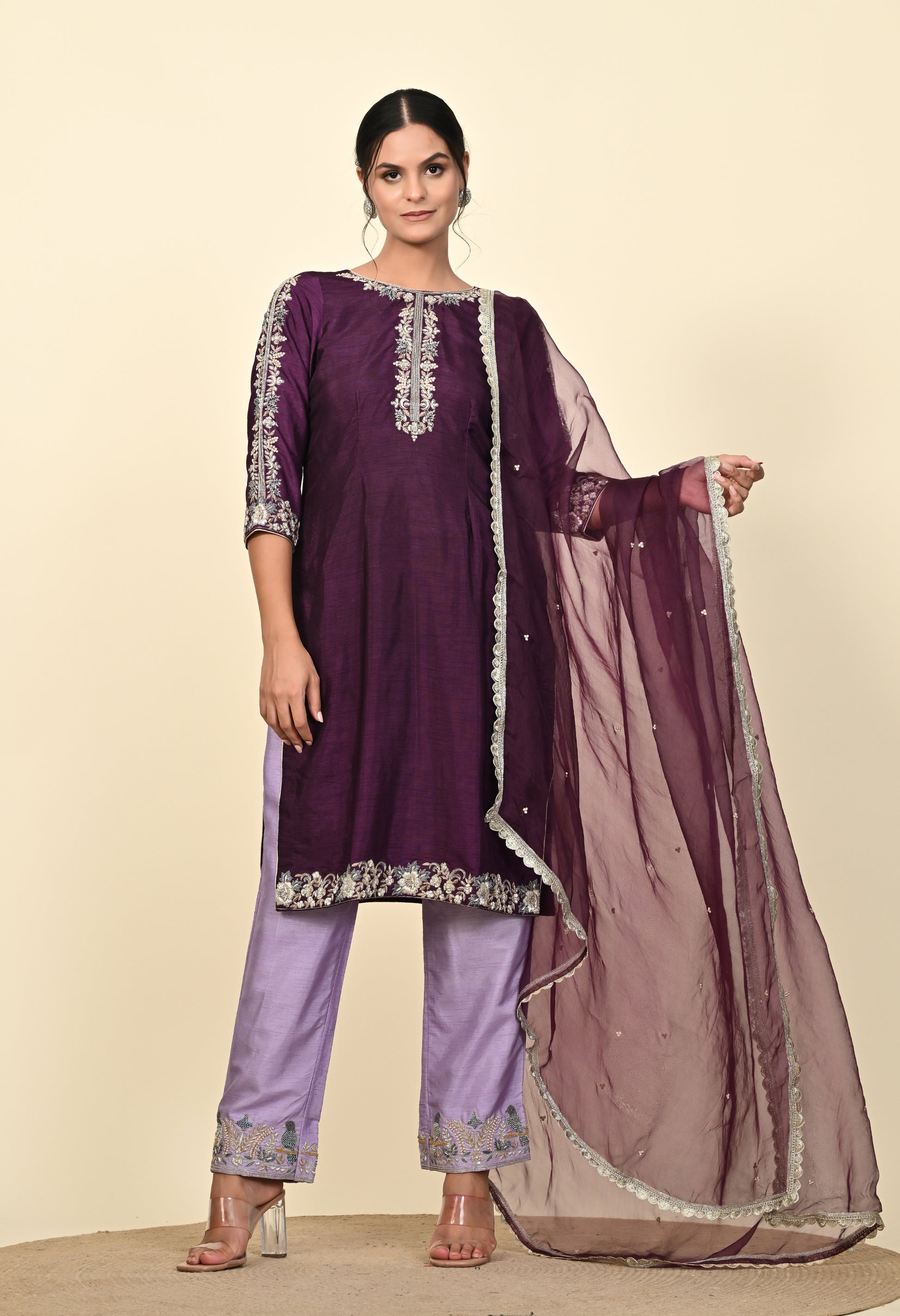 Experience a regal charm with our exquisite purple Kurta ensemble. Featuring a silk kurta, straight-cut pants, and organza dupatta, this set is adorned with detailed zardozi, thread, and crystal work. The intricate embroidery beautifully highlights your sophisticated appeal.
