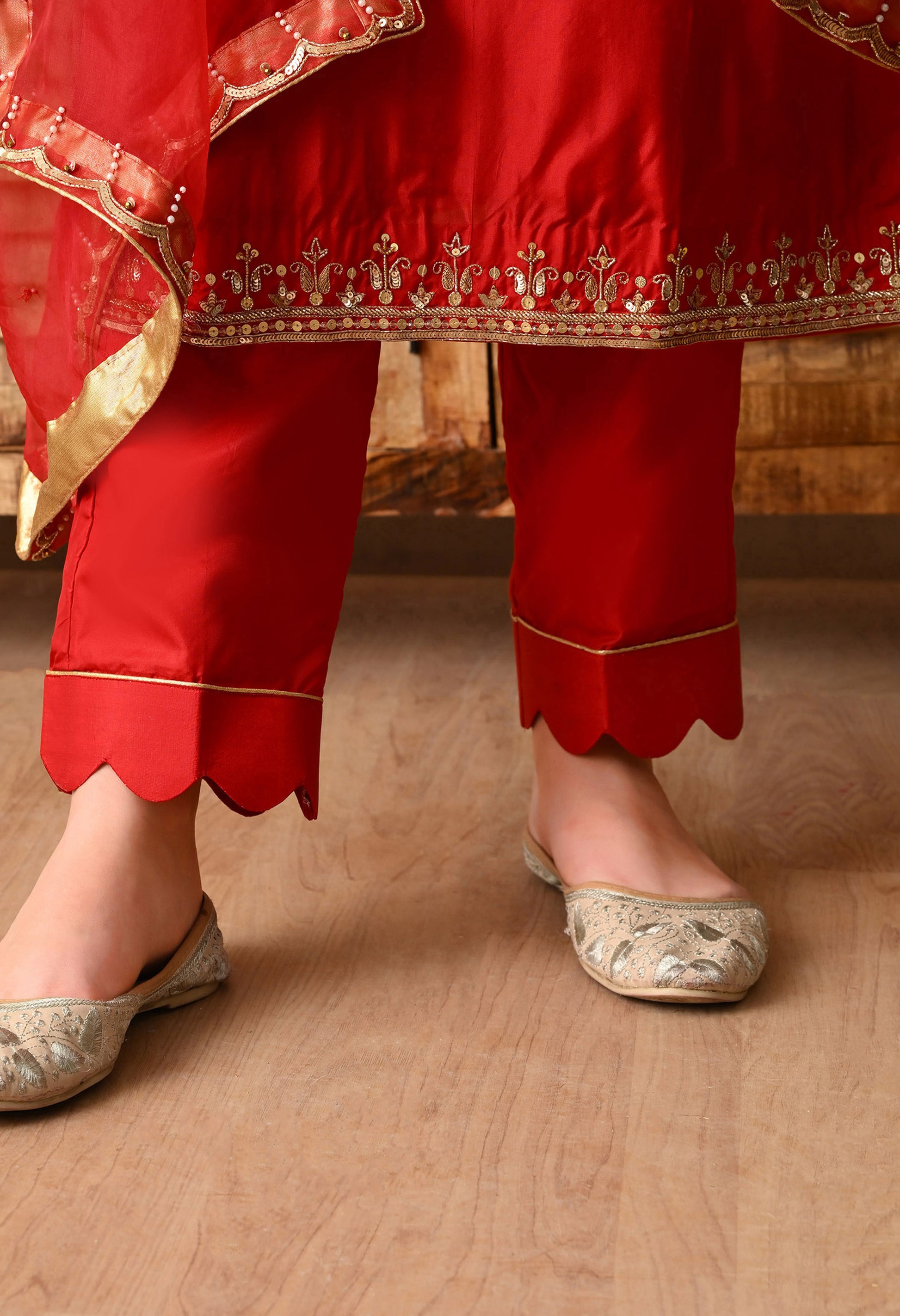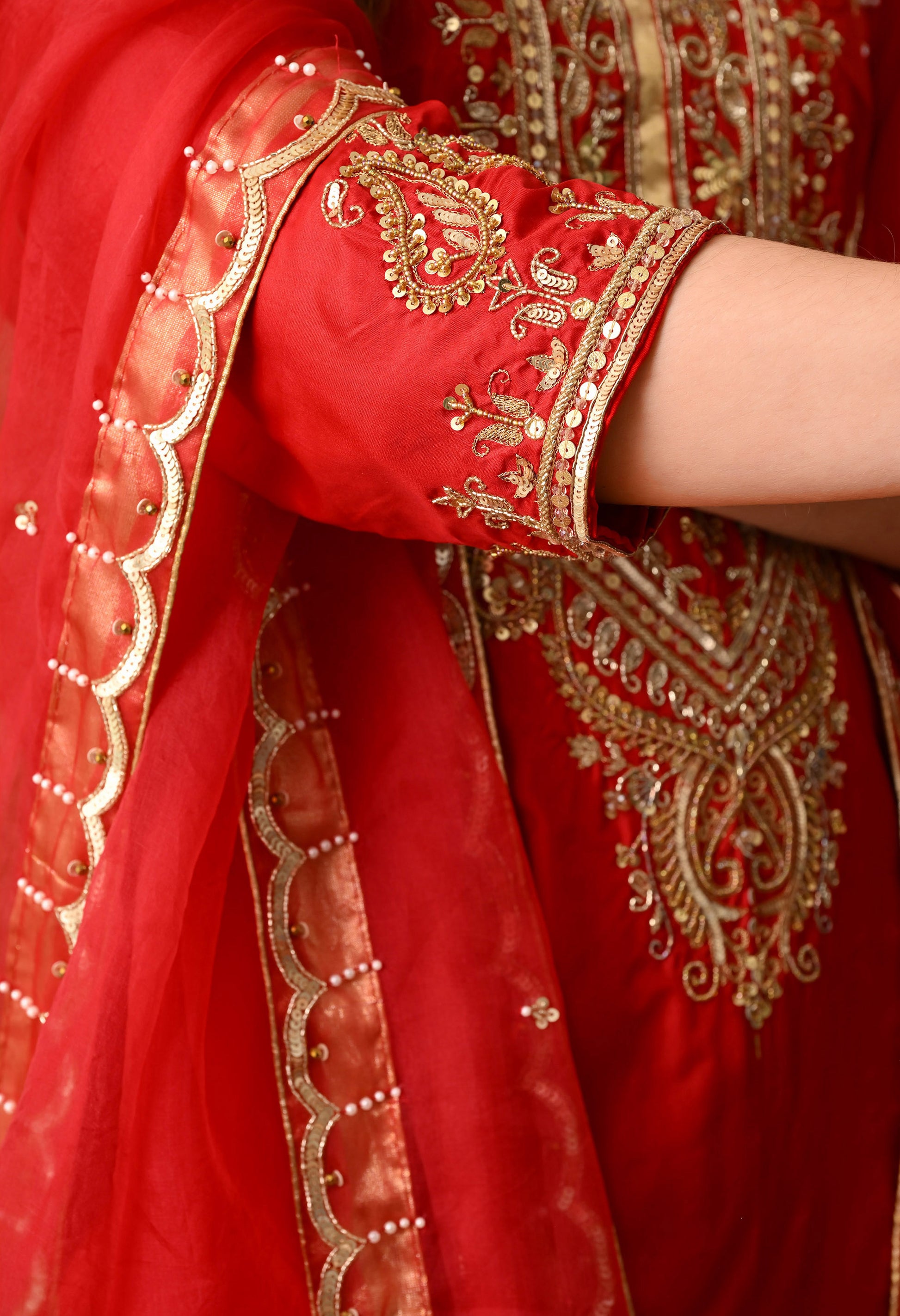 Step into an ethereal dream with our resplendent red Kurta Set, intricately adorned with dabka, zardozi and gleaming sequins. The breezy silk kurta, sheer organza dupatta, and finely crafted silk bottom drape you in sophistication and charm.