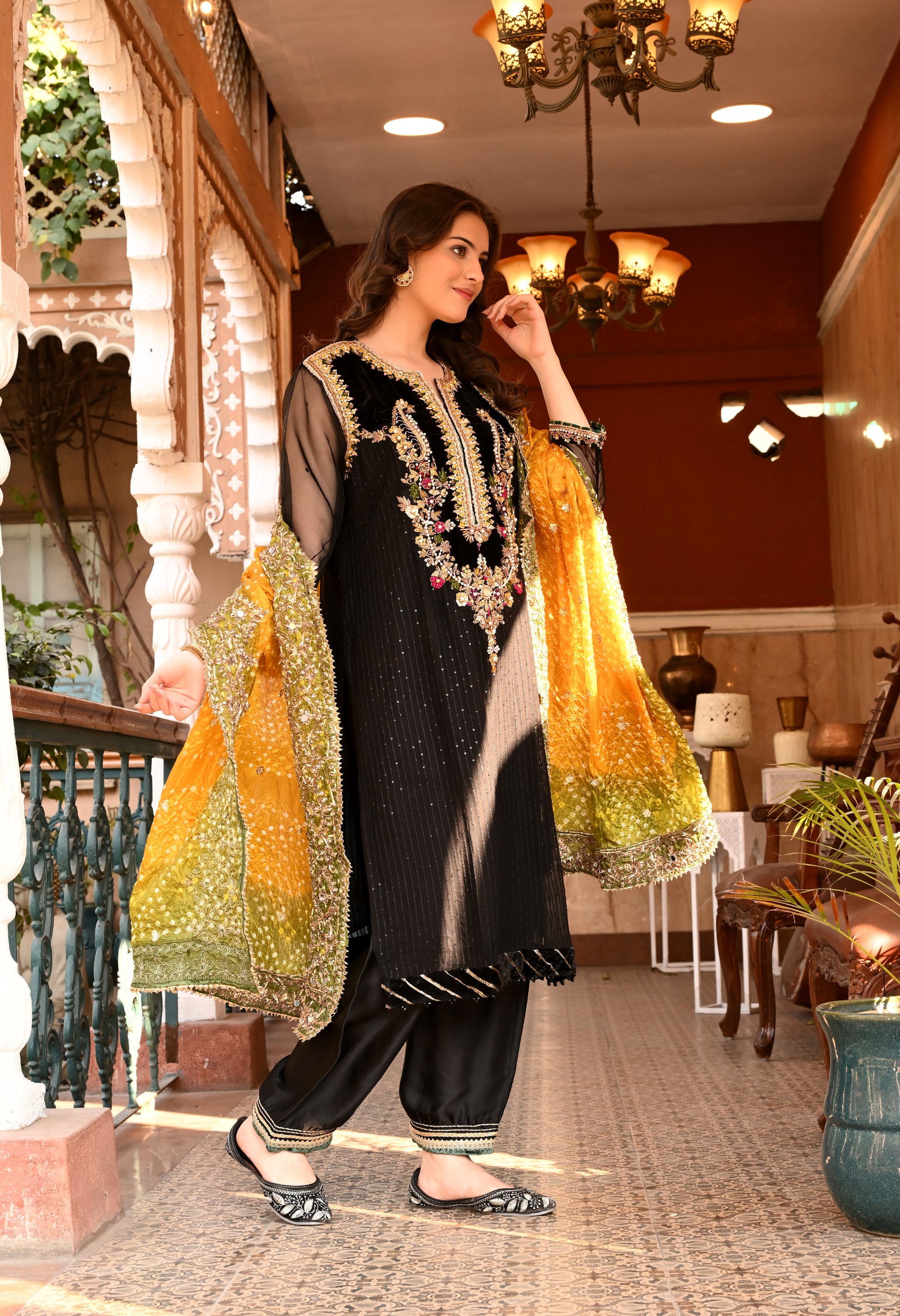Let the magic of craftsmanship unfold with our charming black Kurta Set, intricately adorned with hand embroidery and lustrous gota patti, dabka, and mirror work. The feather-light chiffon kurta, silk dupatta and bottom ensemble drapes you in effortless elegance.