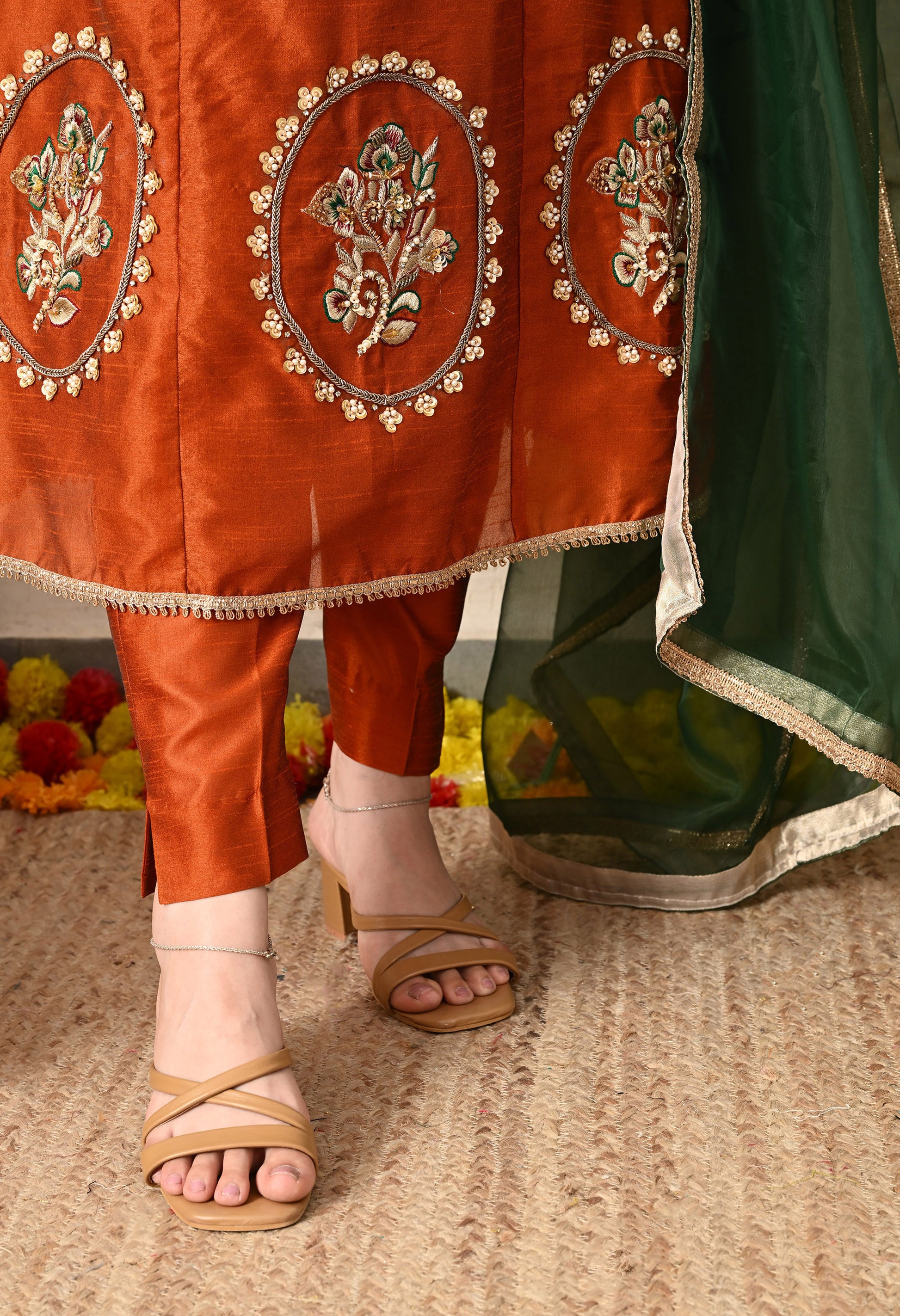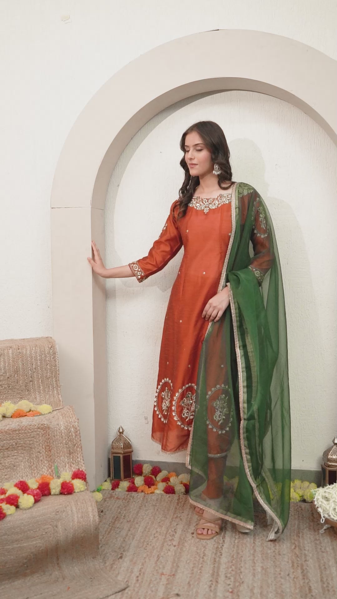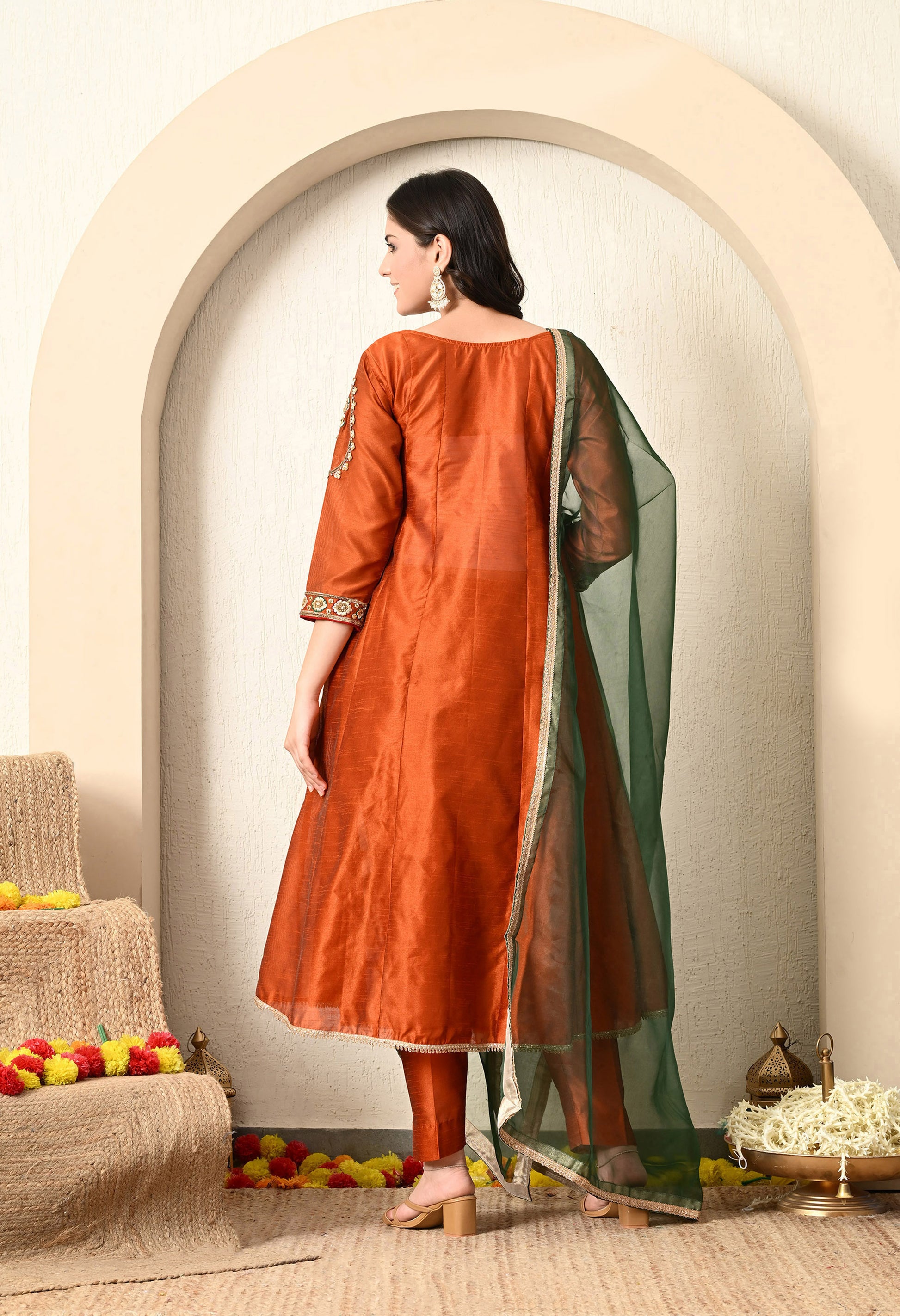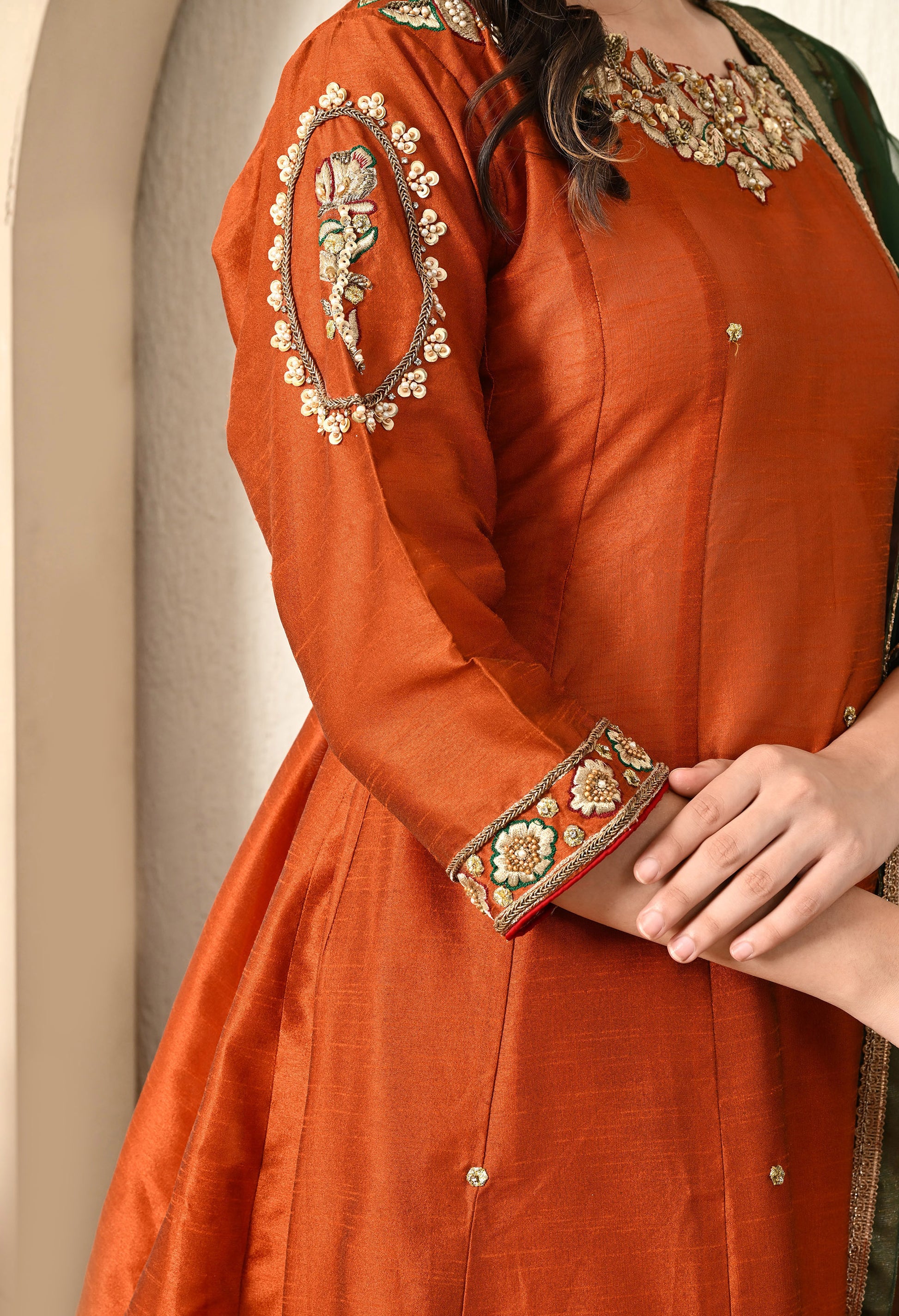Experience as the royal princess that you are with our exquisite golden brown hue anarkali set . A silk kurta, straight pant, and green contrast sheer net dupatta comes together with intricate Zardozi, Dabka, Sequin, and Thread work, highlighted by embroidery details to enhance your grace.