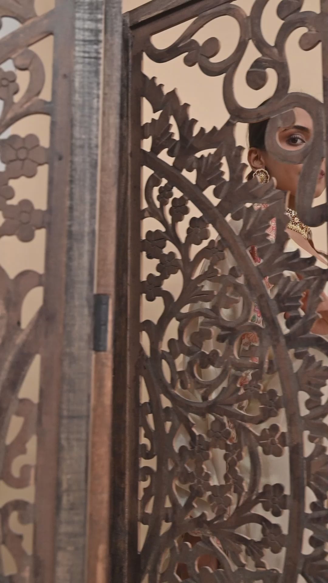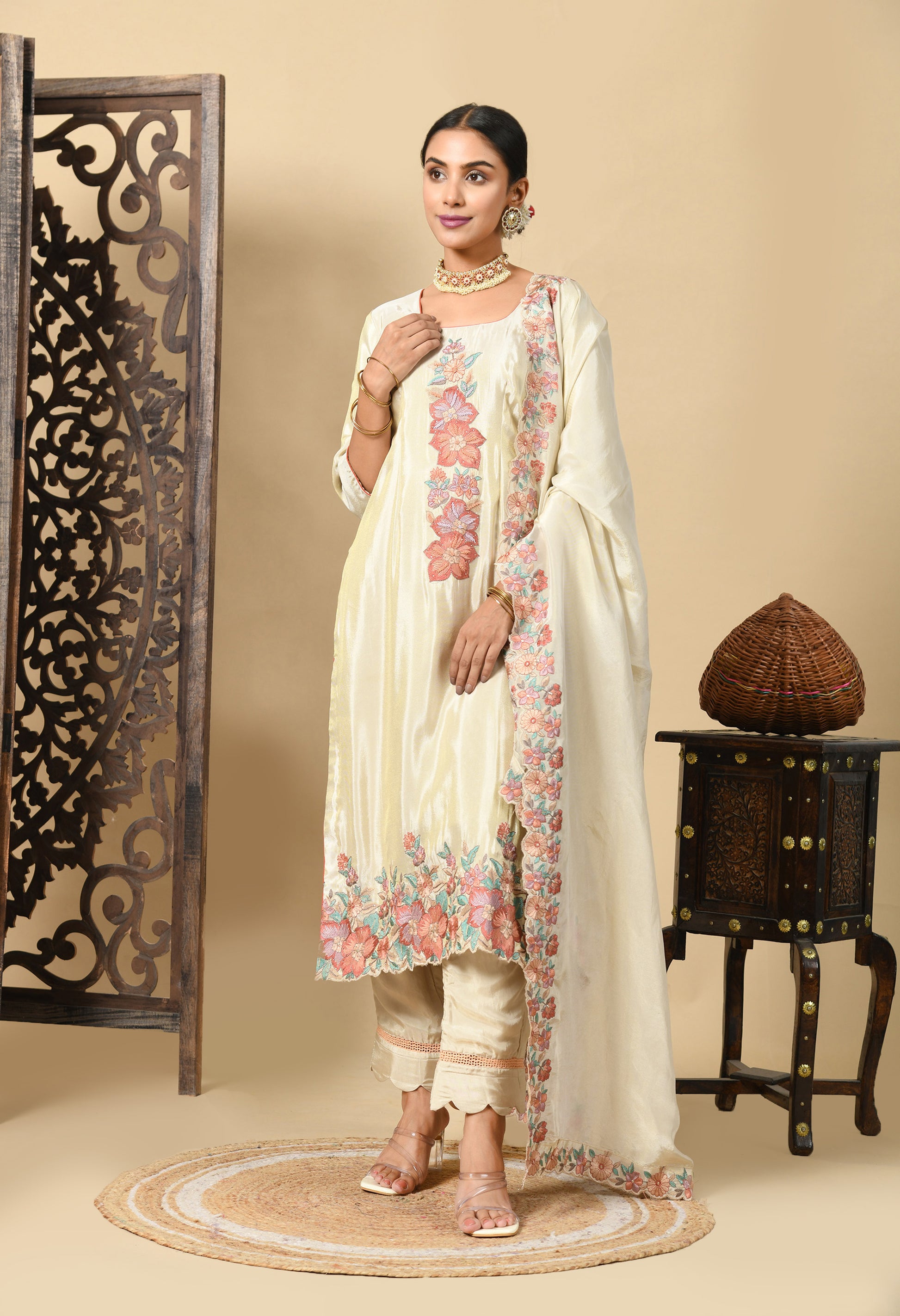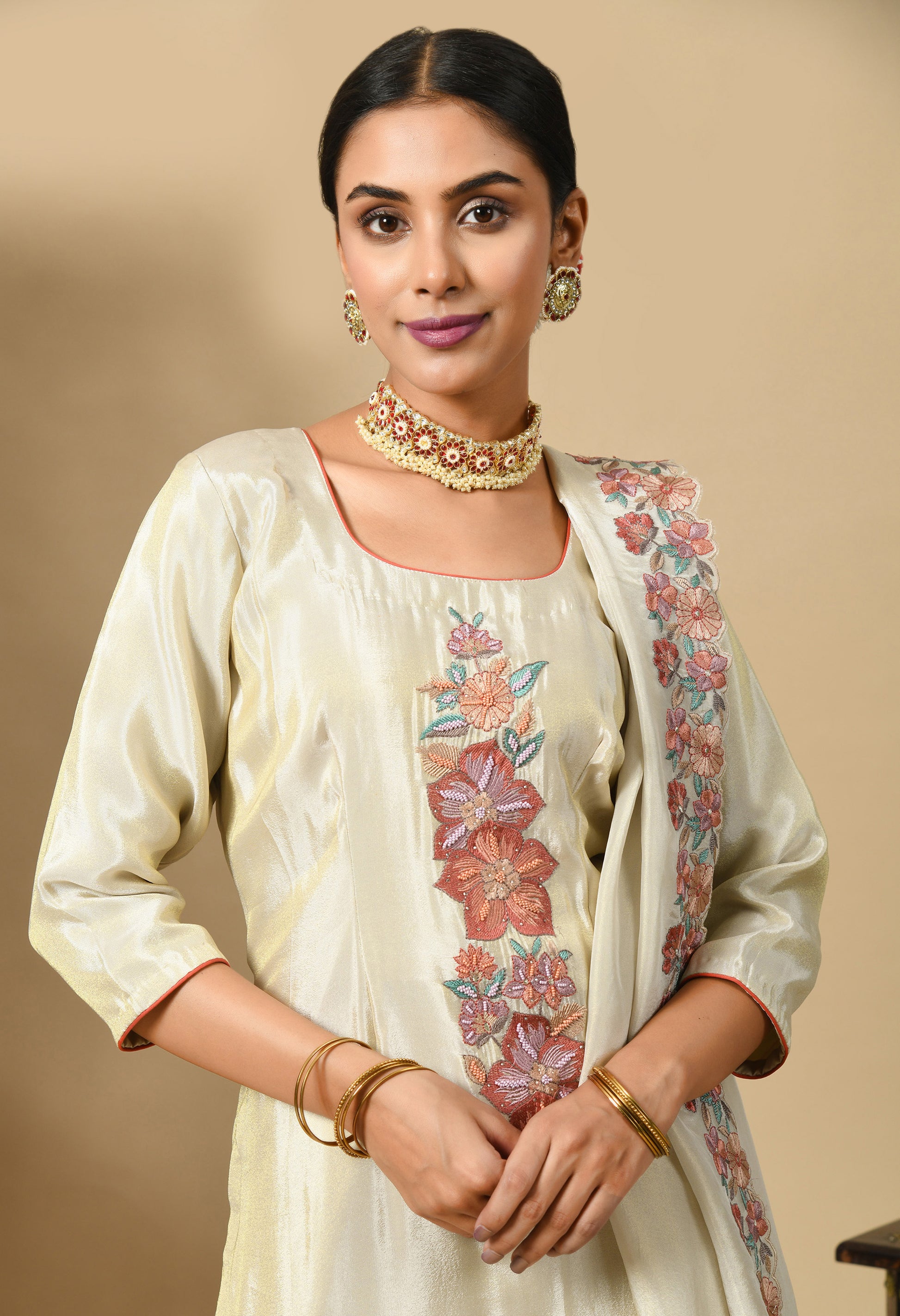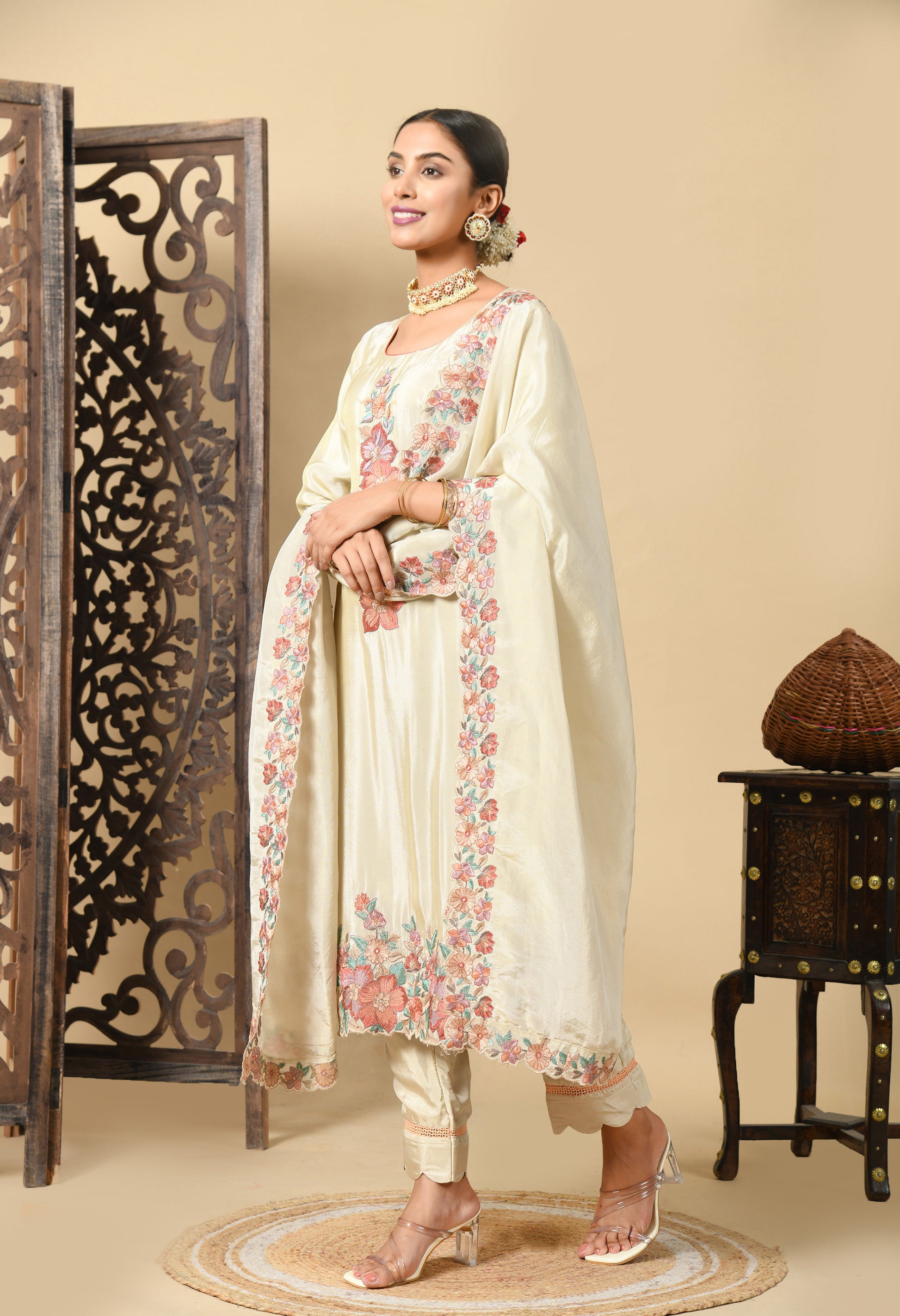 Radiate elegance in our golden cream Kurta Set, adorned with a delicate tissue organza dupatta, a stunning embroidered tissue crepe kurta, and a matching tissue crepe bottom. The detailed parsi thread embellishments add a classic, sophisticated finish.