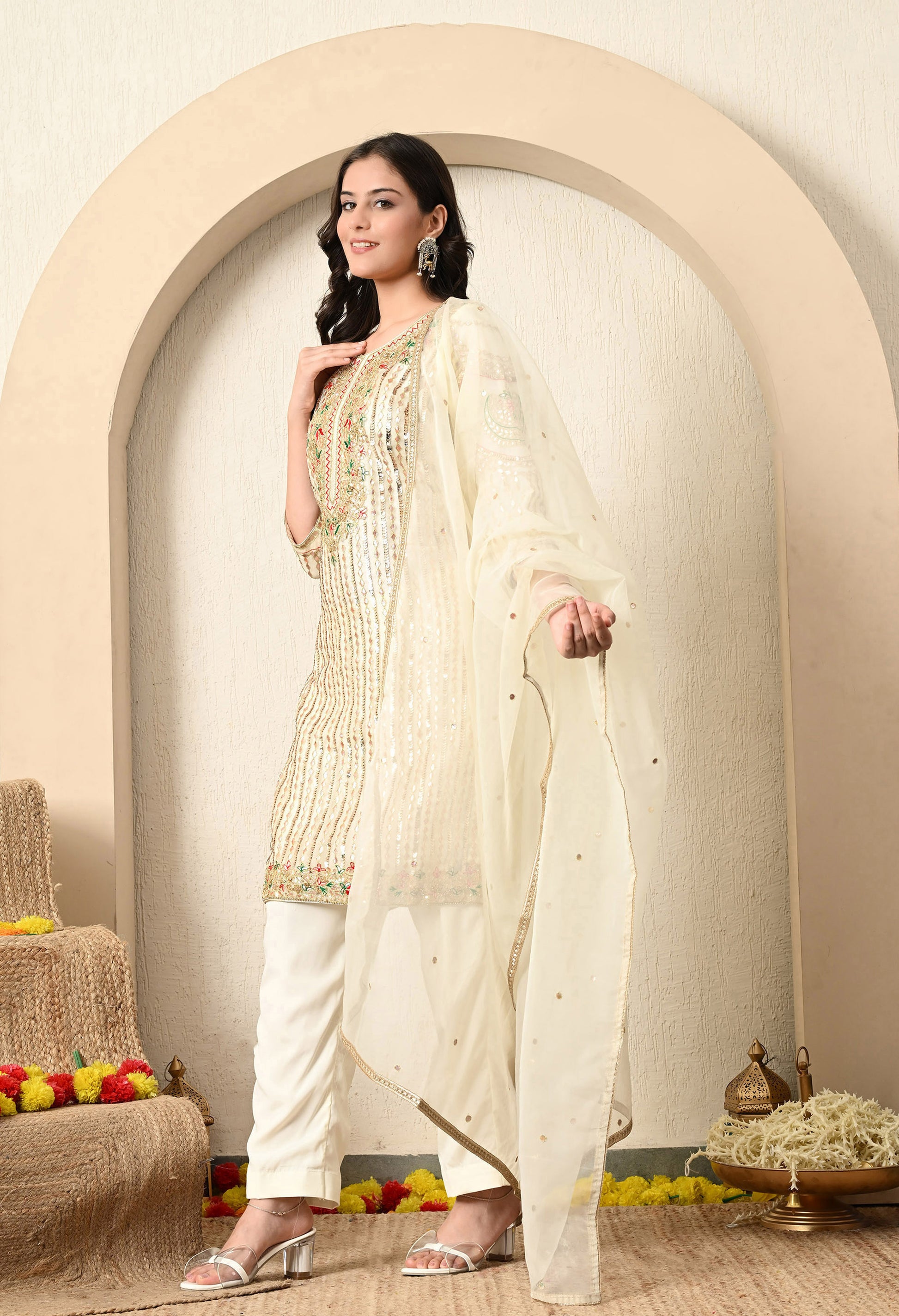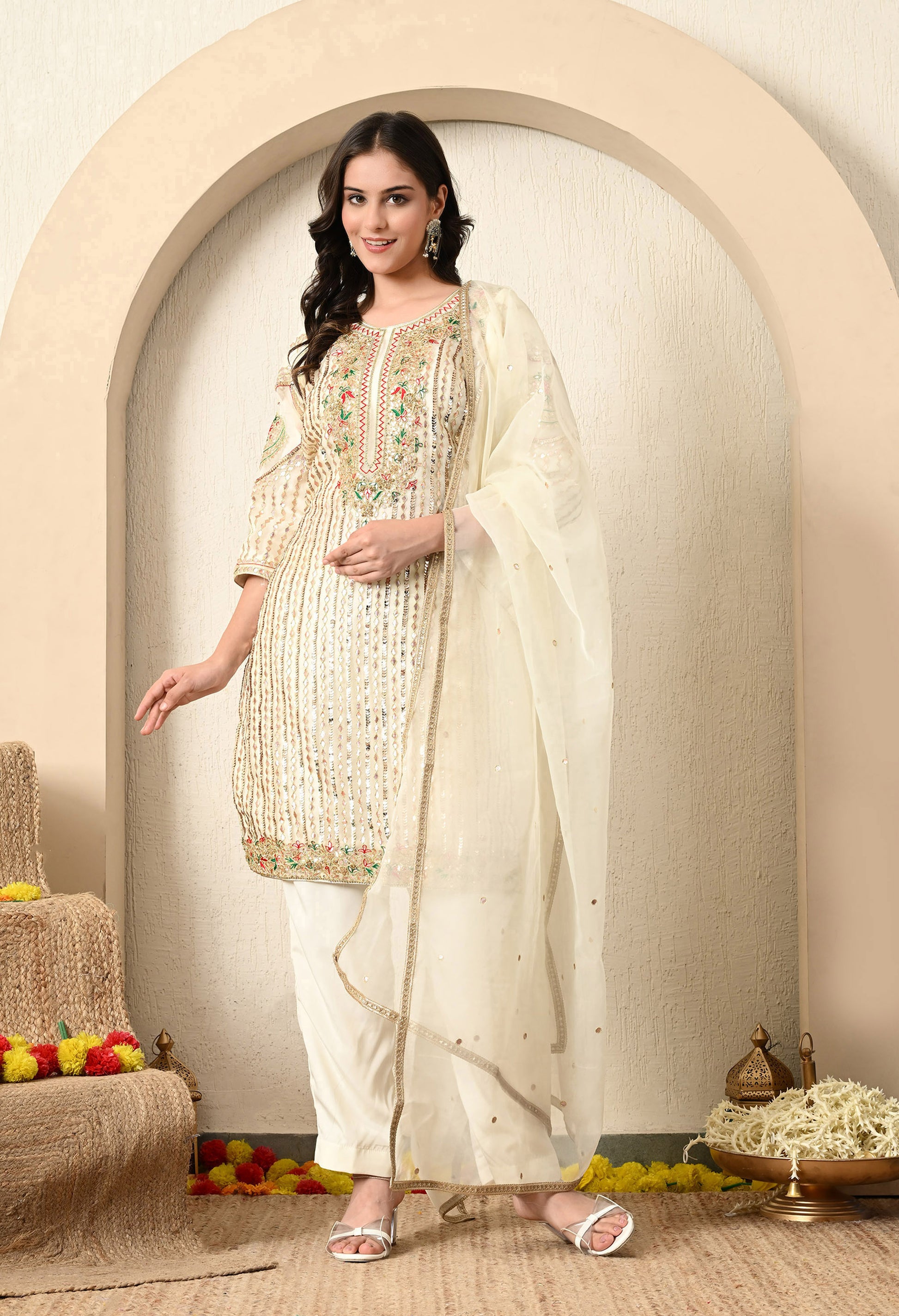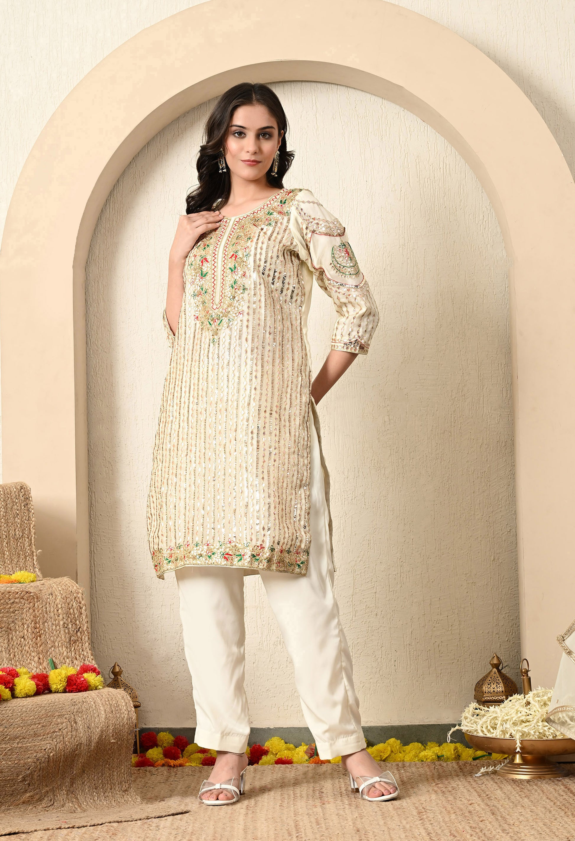 Make an elegant statement with this beautiful golden cream kurta set, which includes an organza kurta, a straight crepe pant, and a coordinating organza dupatta. The ensemble is adorned with intricate Gotta, Thread, Zardozi, and Sequence detailing, perfect for adding a touch of timeless elegance.