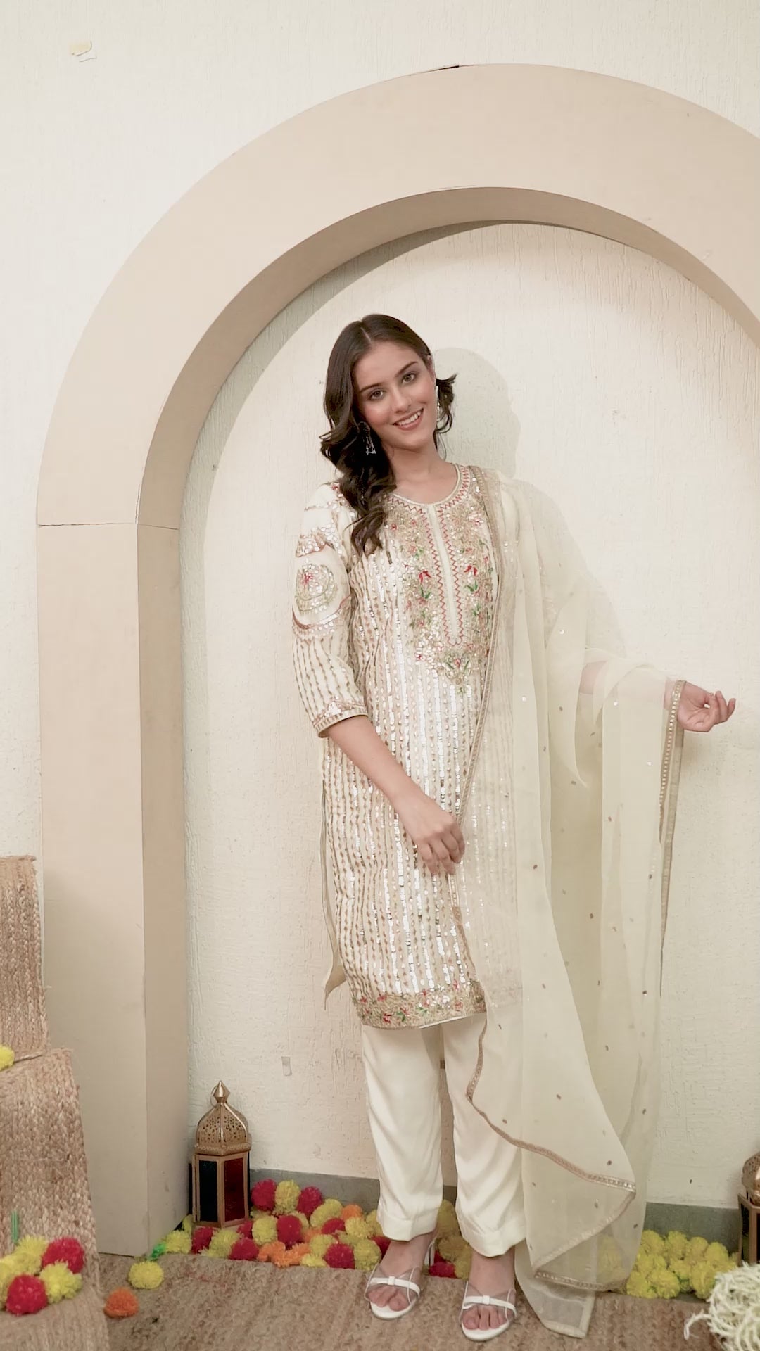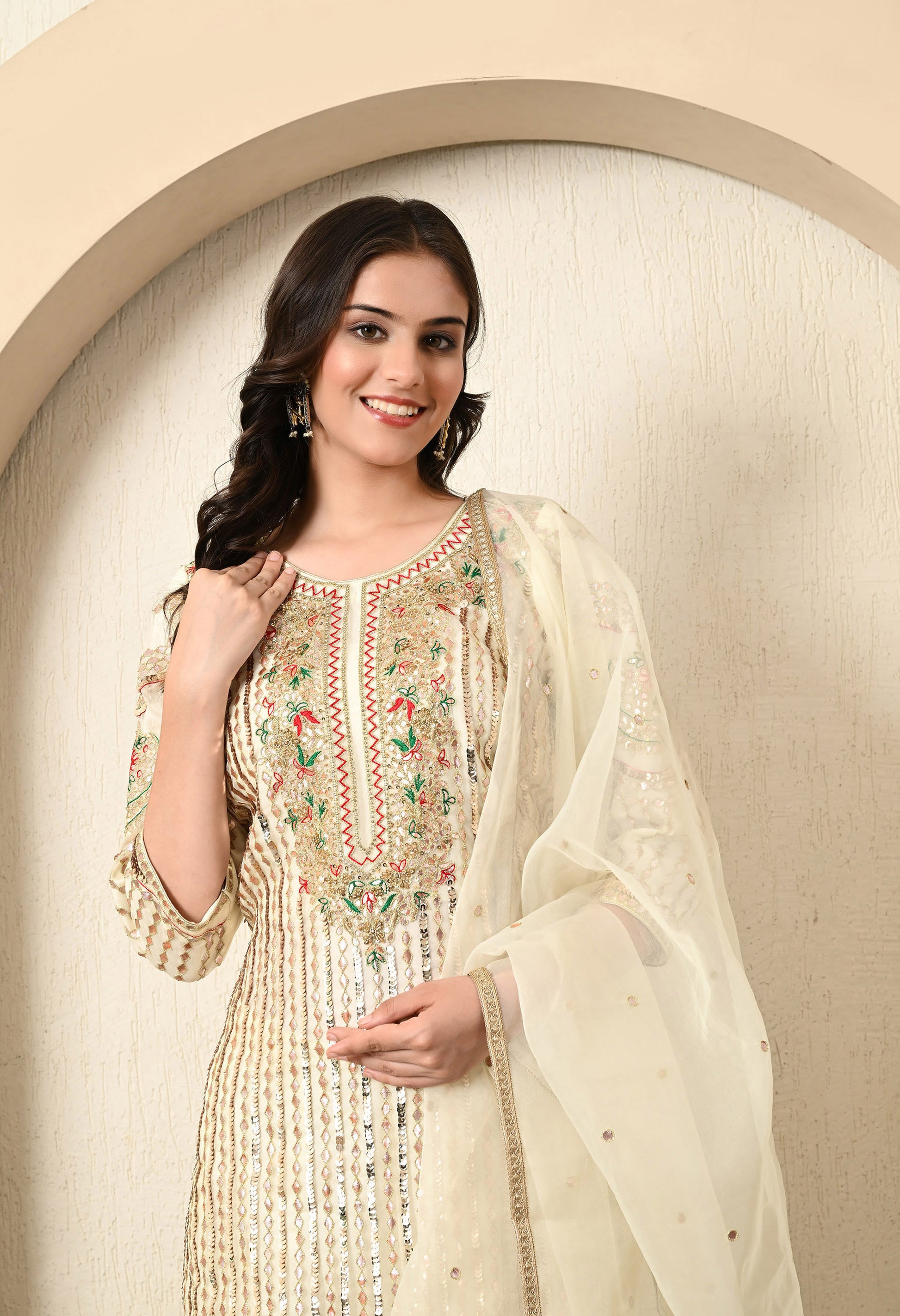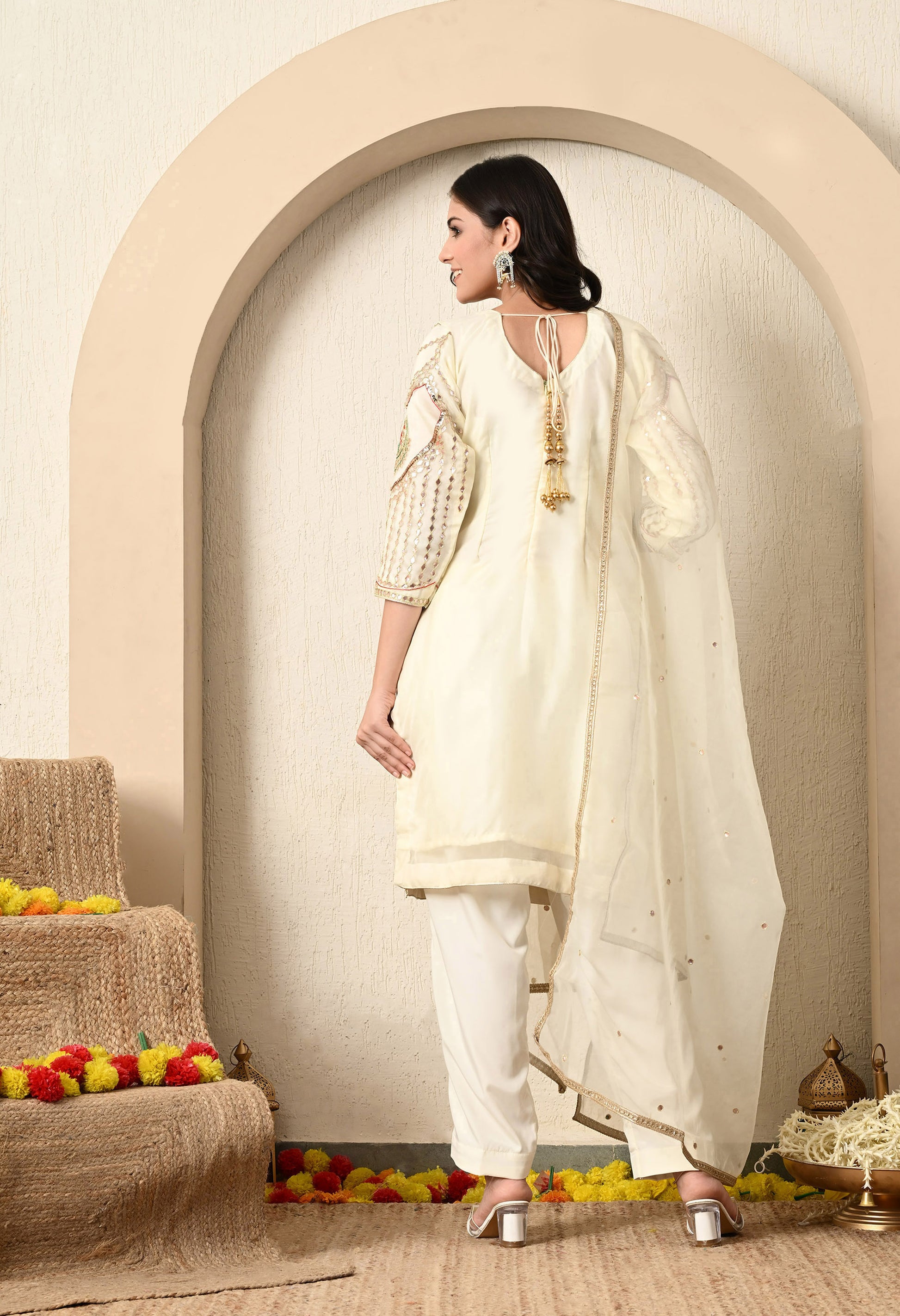 Make an elegant statement with this beautiful golden cream kurta set, which includes an organza kurta, a straight crepe pant, and a coordinating organza dupatta. The ensemble is adorned with intricate Gotta, Thread, Zardozi, and Sequence detailing, perfect for adding a touch of timeless elegance.