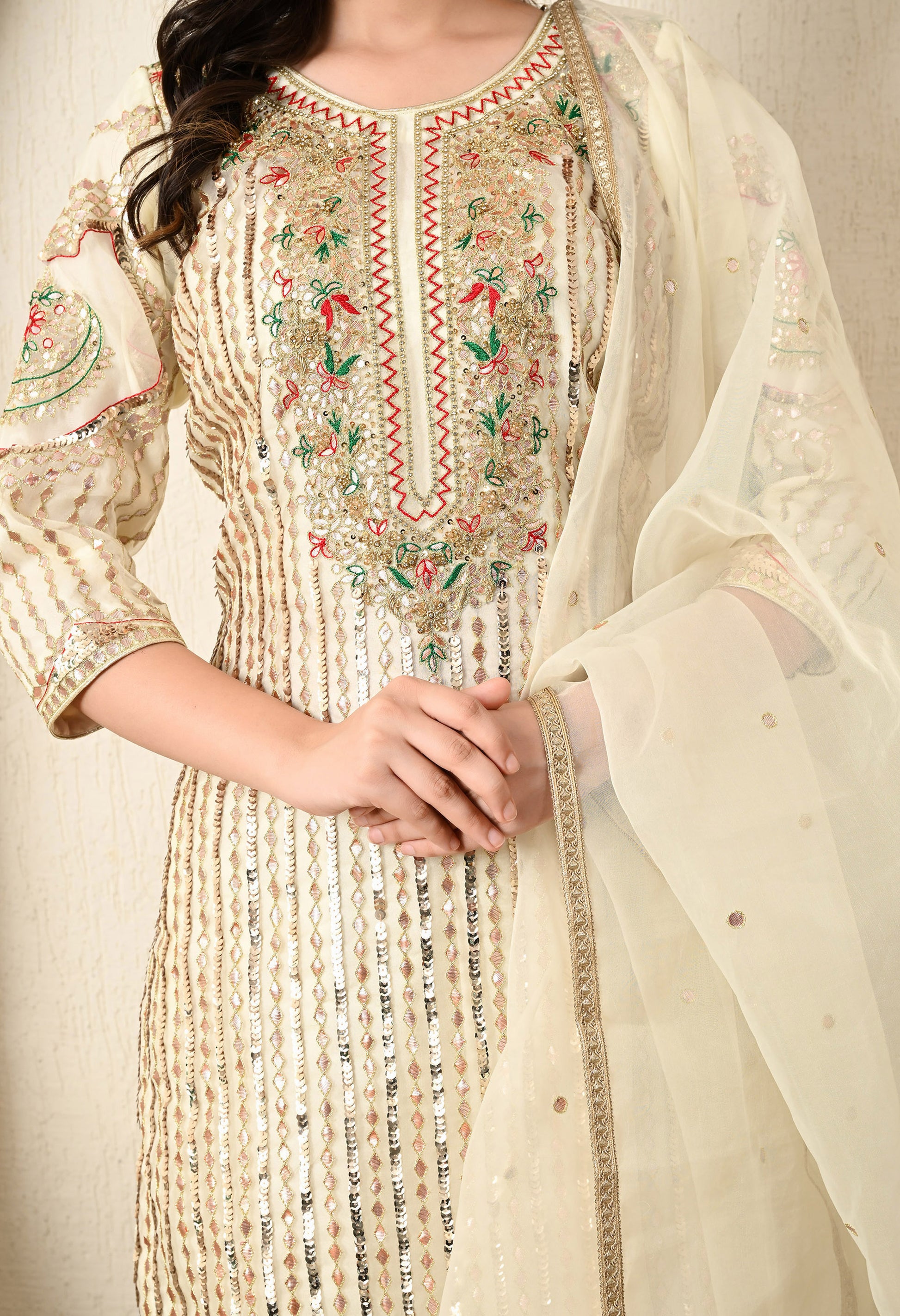 - Beautiful Gota Patti & Sequin work with multi coloured embroidery on the Neck, On the front part of Kurta, and Ghera.