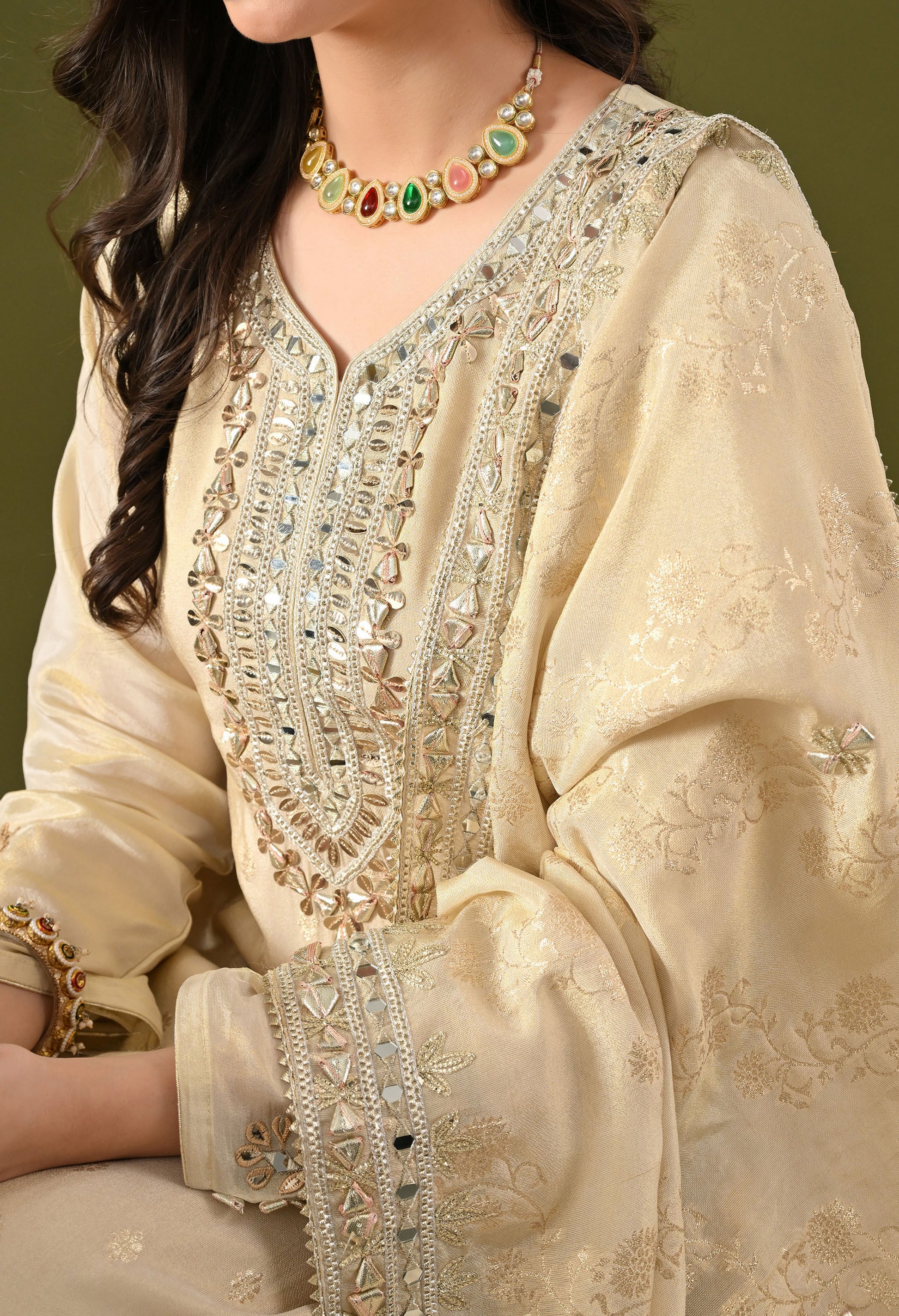 Golden Cream Tissue Silk Gotta–Mirror–Zardozi Sharara Set