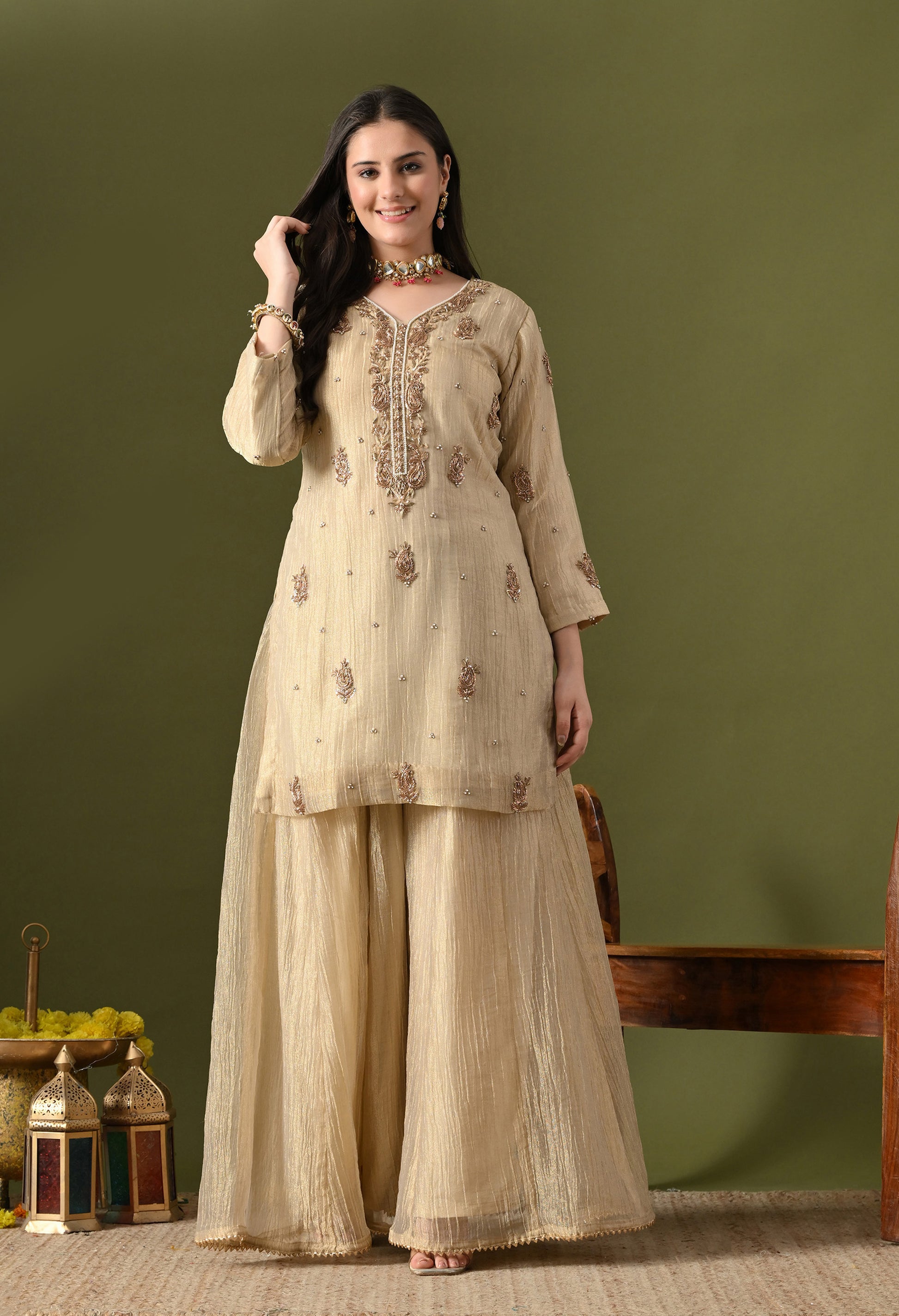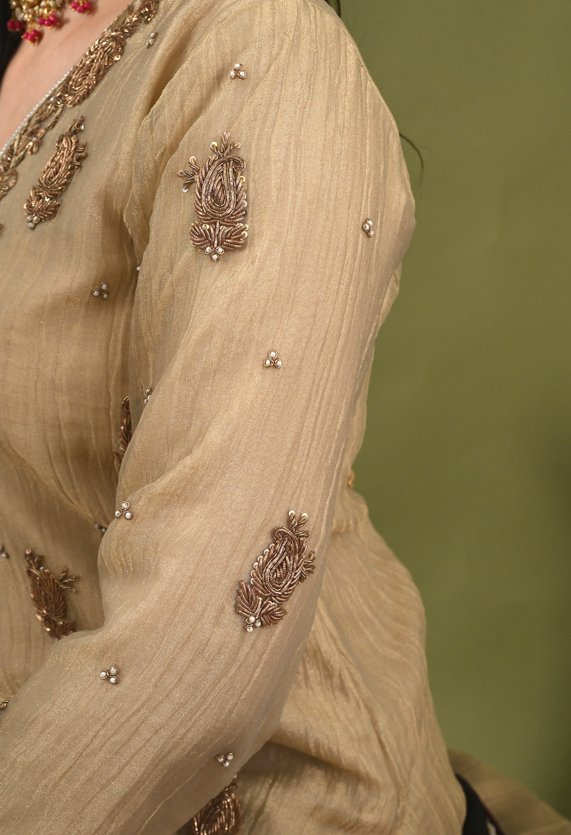 Golden Crushed Tissue & Glass Silk Zardozi–Sequin–Pearl Sharara Set