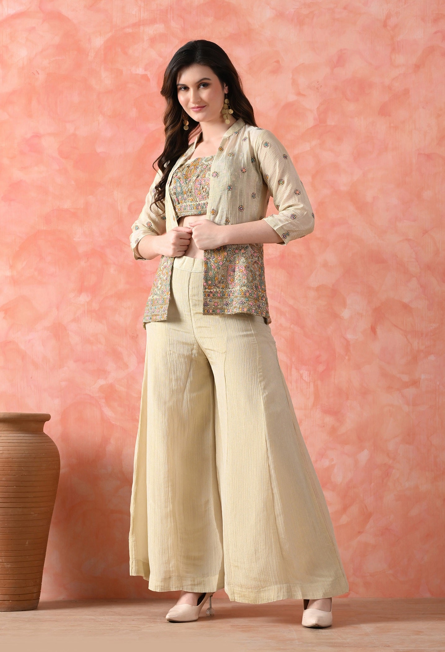 This golden Indo-Western sharara set is designed to make a statement at festive occasions. Made entirely in luxurious crushed tissue fabric, the jacket, blouse, and sharara come together with soft shine and rich texture. Thread and sequin embroidery add that perfect festive sparkle. Lightweight, elegant, and perfect for weddings or evening functions. -
