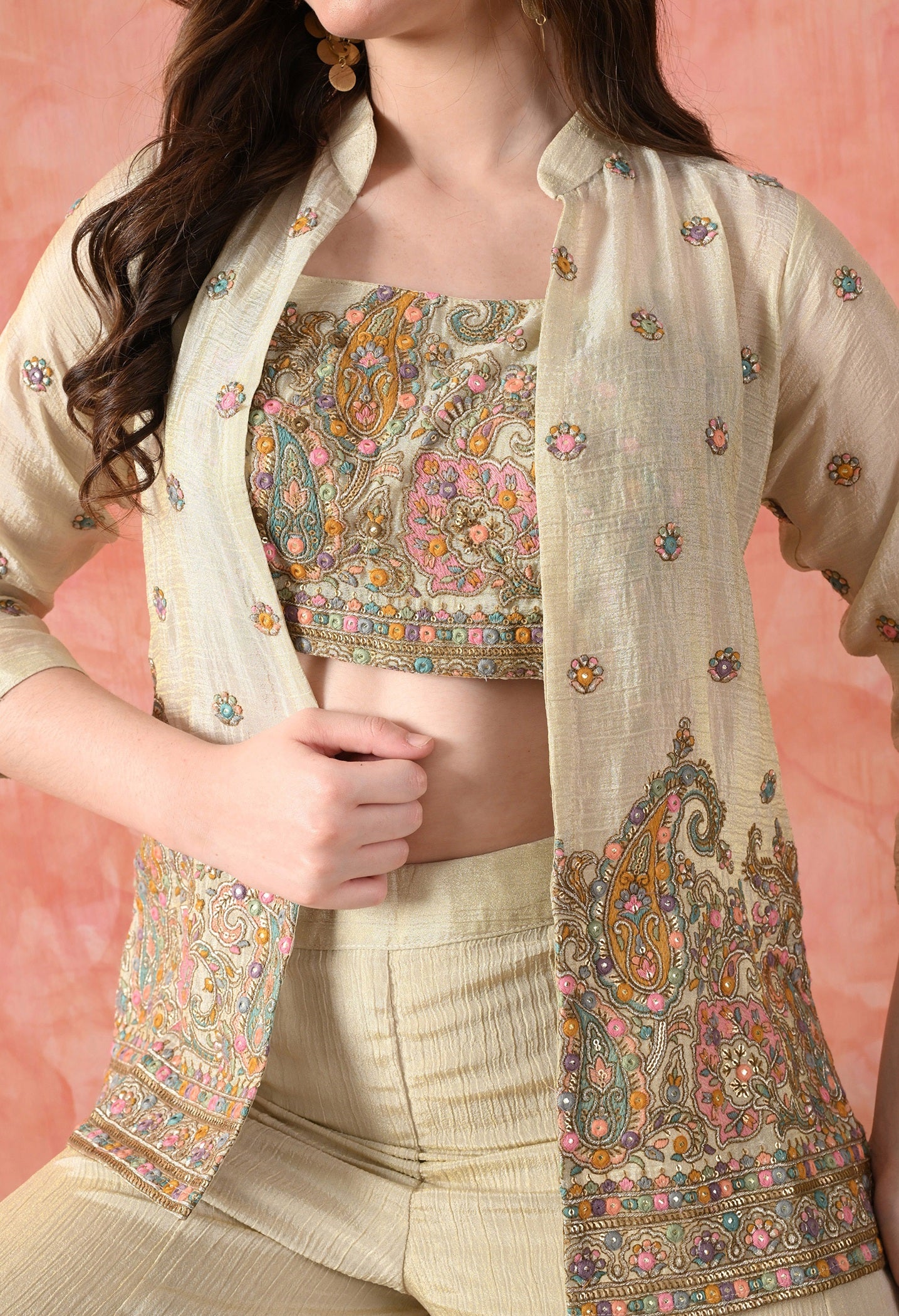 A golden Indo-Western set crafted in crushed tissue. Includes a jacket, blouse, and sharara with thread and sequin hand embroidery.