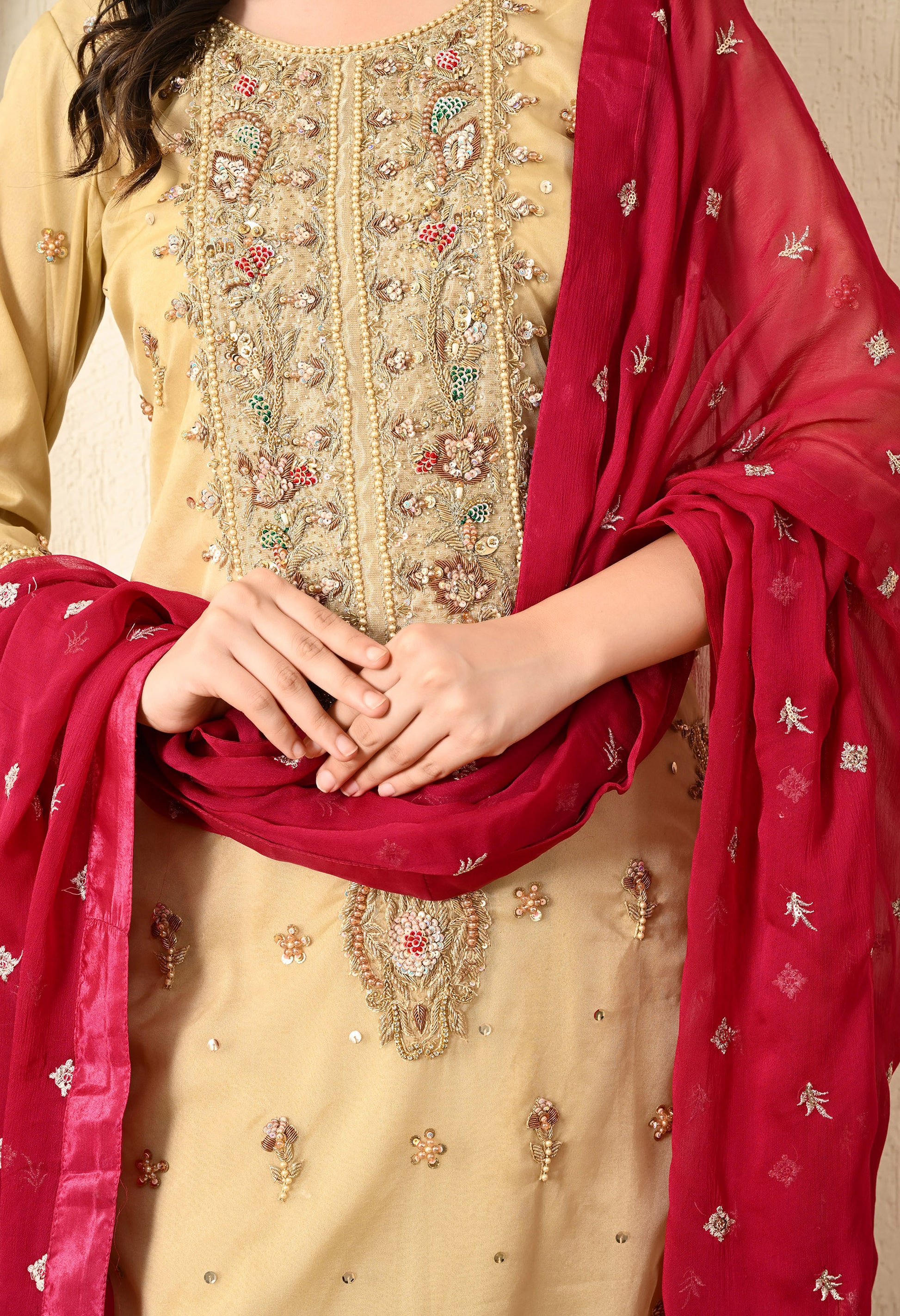 The golden kurta set combines traditional artistry with modern flair, featuring an organza kurta, a crepe straight pant, and a contrast chiffon dupatta. Adorned with intricate Zardozi, Dabka, Sequin, and Pearl work, the ensemble is elevated by pearl detailing on the neckline, creating a graceful and sophisticated look.