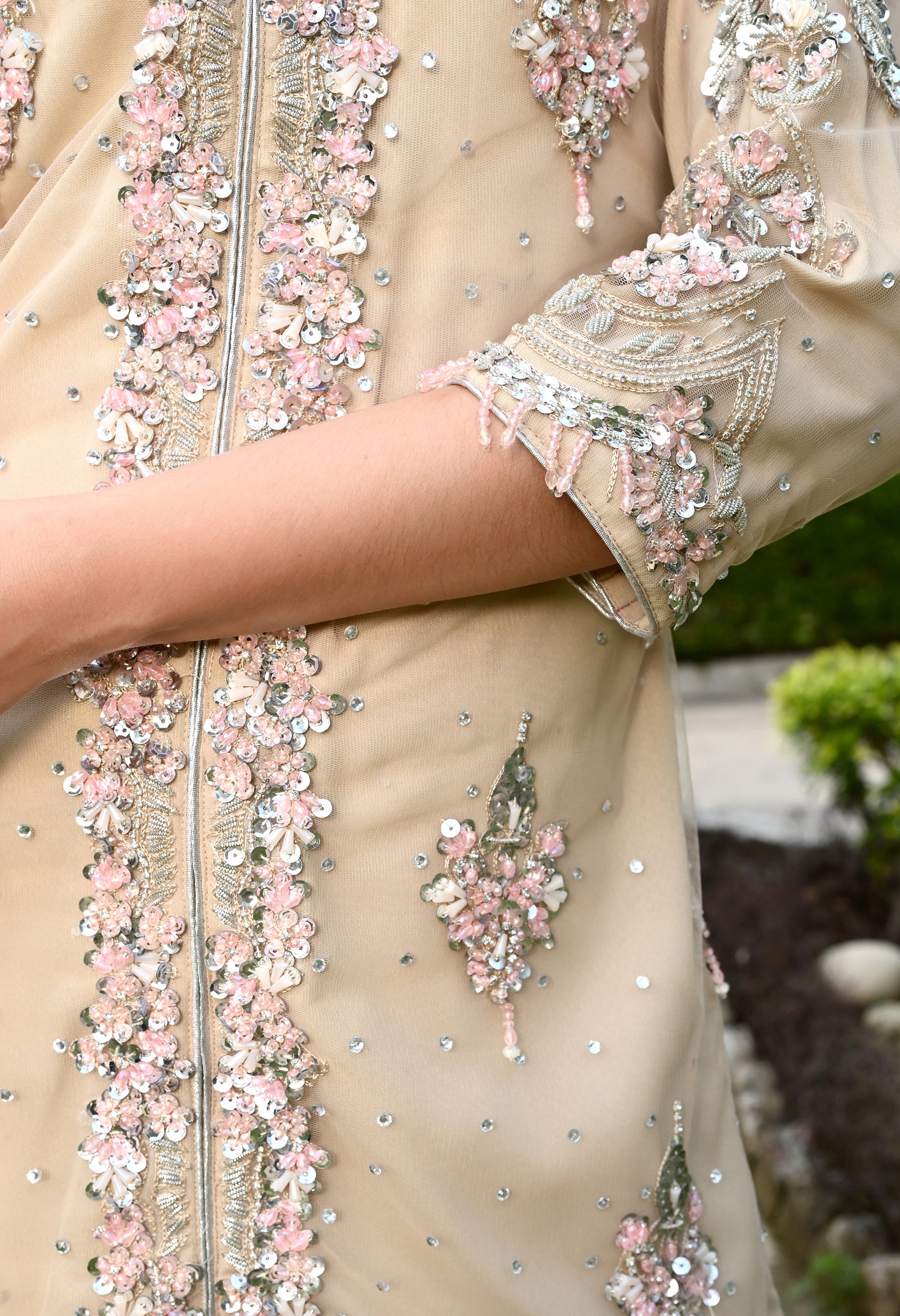 - Hand embroidery with light-catching sequins and delicate pearls.