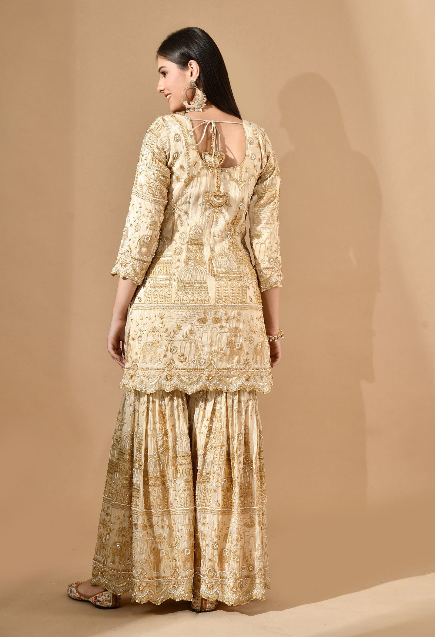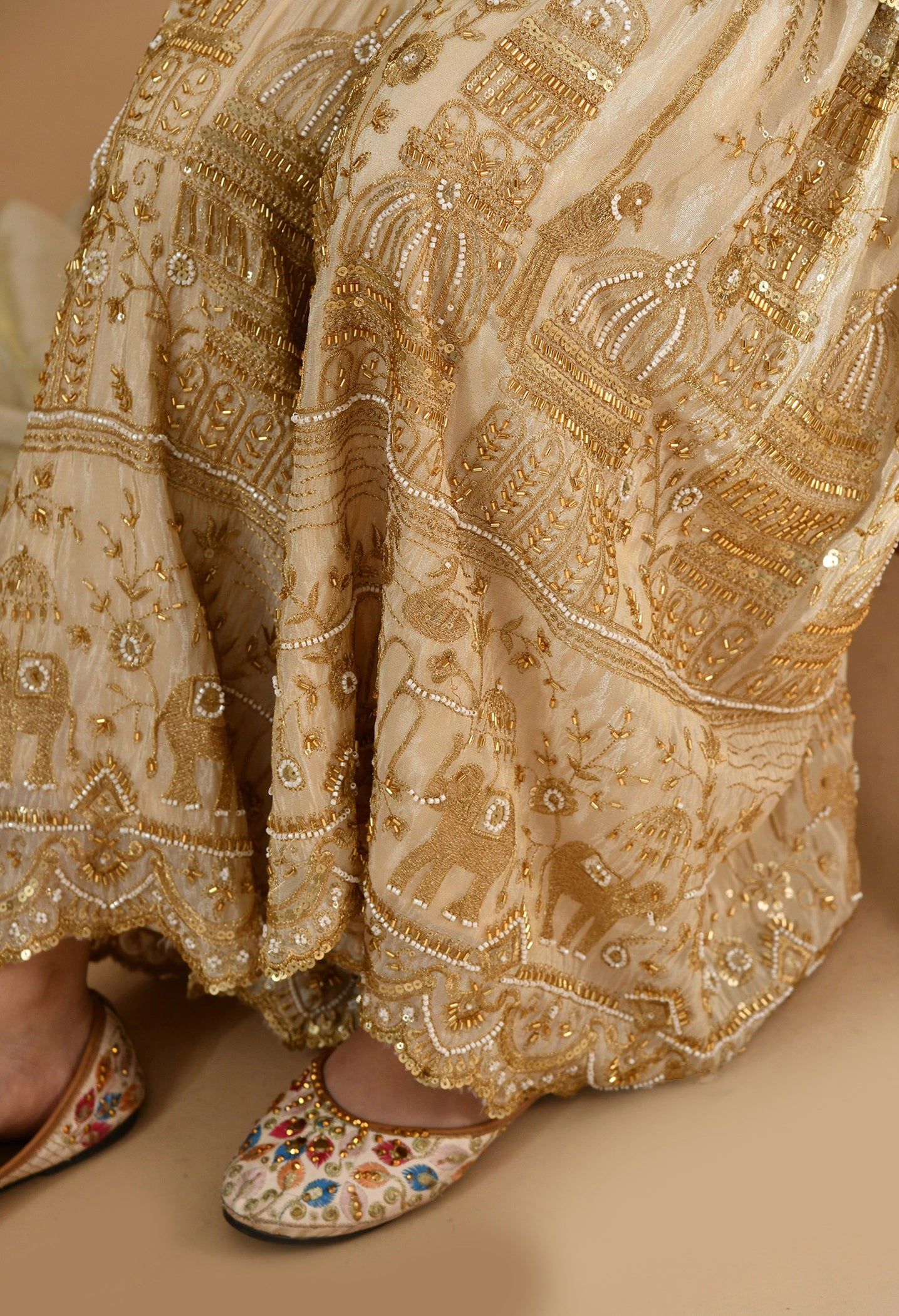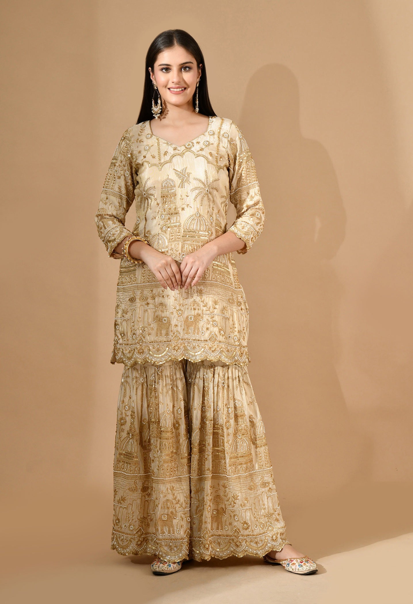 - Designed for radiant celebrations, this golden sharara set features luxurious zardozi, pearl, sequin, and cutdana handwork.