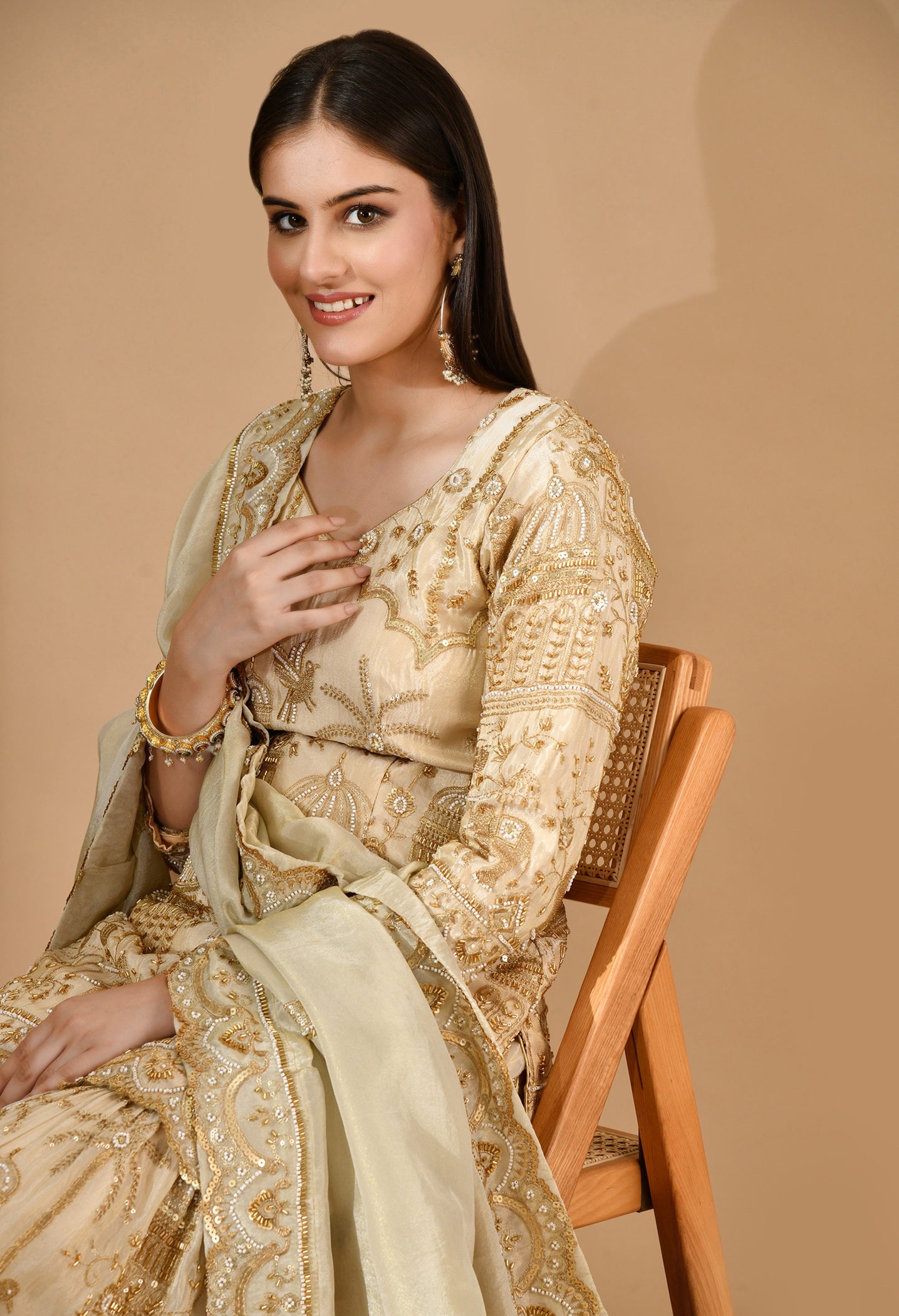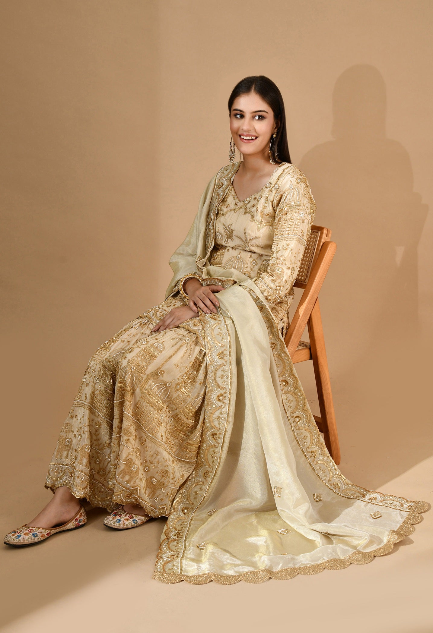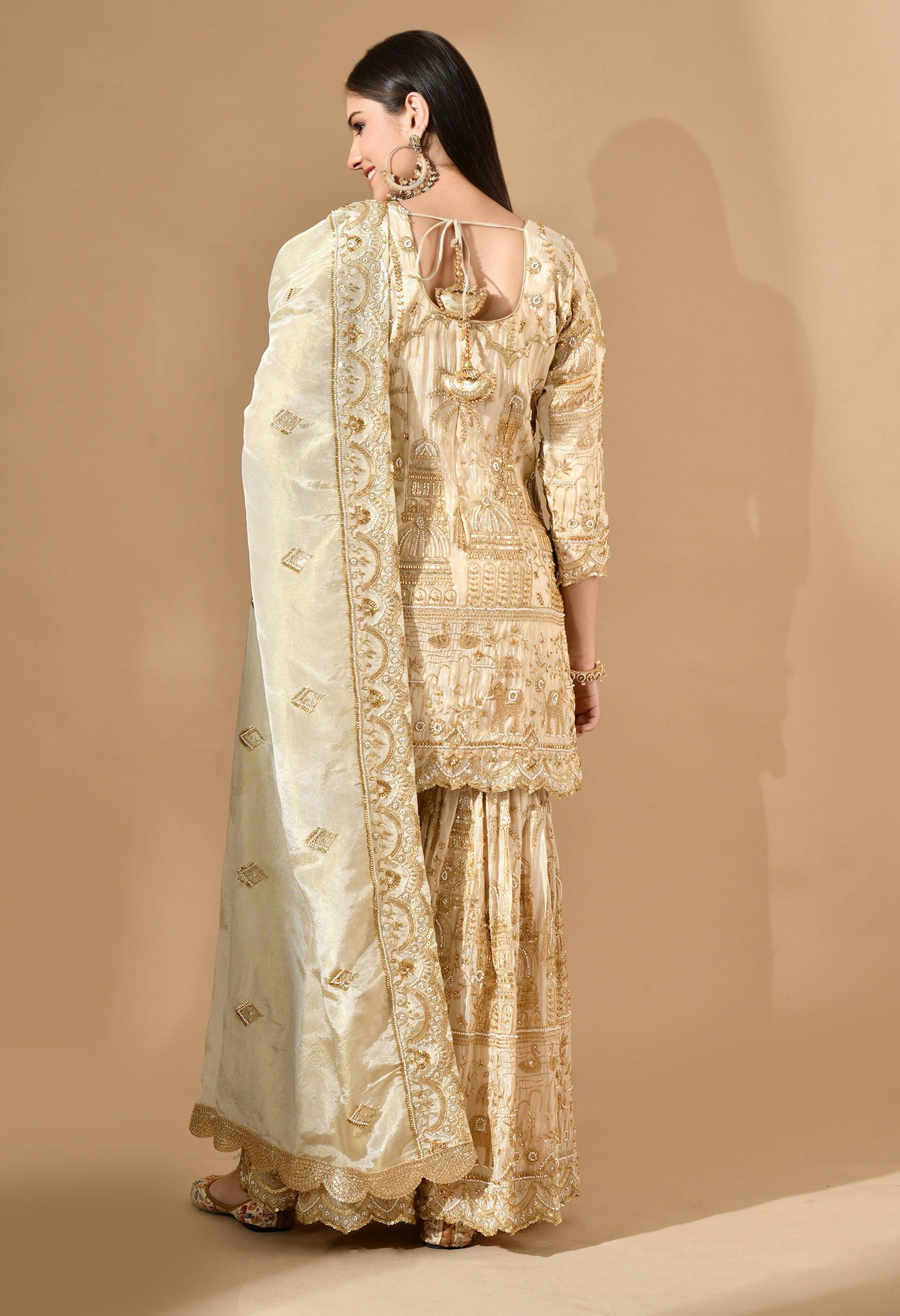 - Designed for radiant celebrations, this golden sharara set features luxurious zardozi, pearl, sequin, and cutdana handwork.