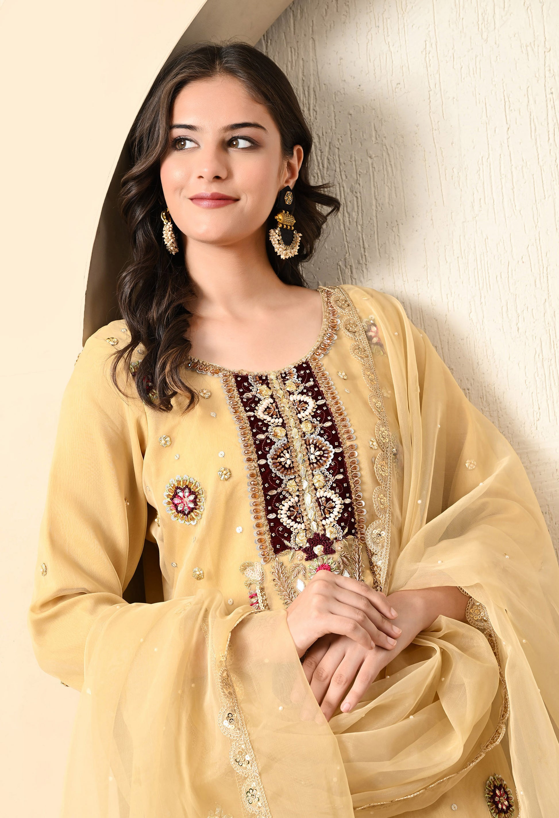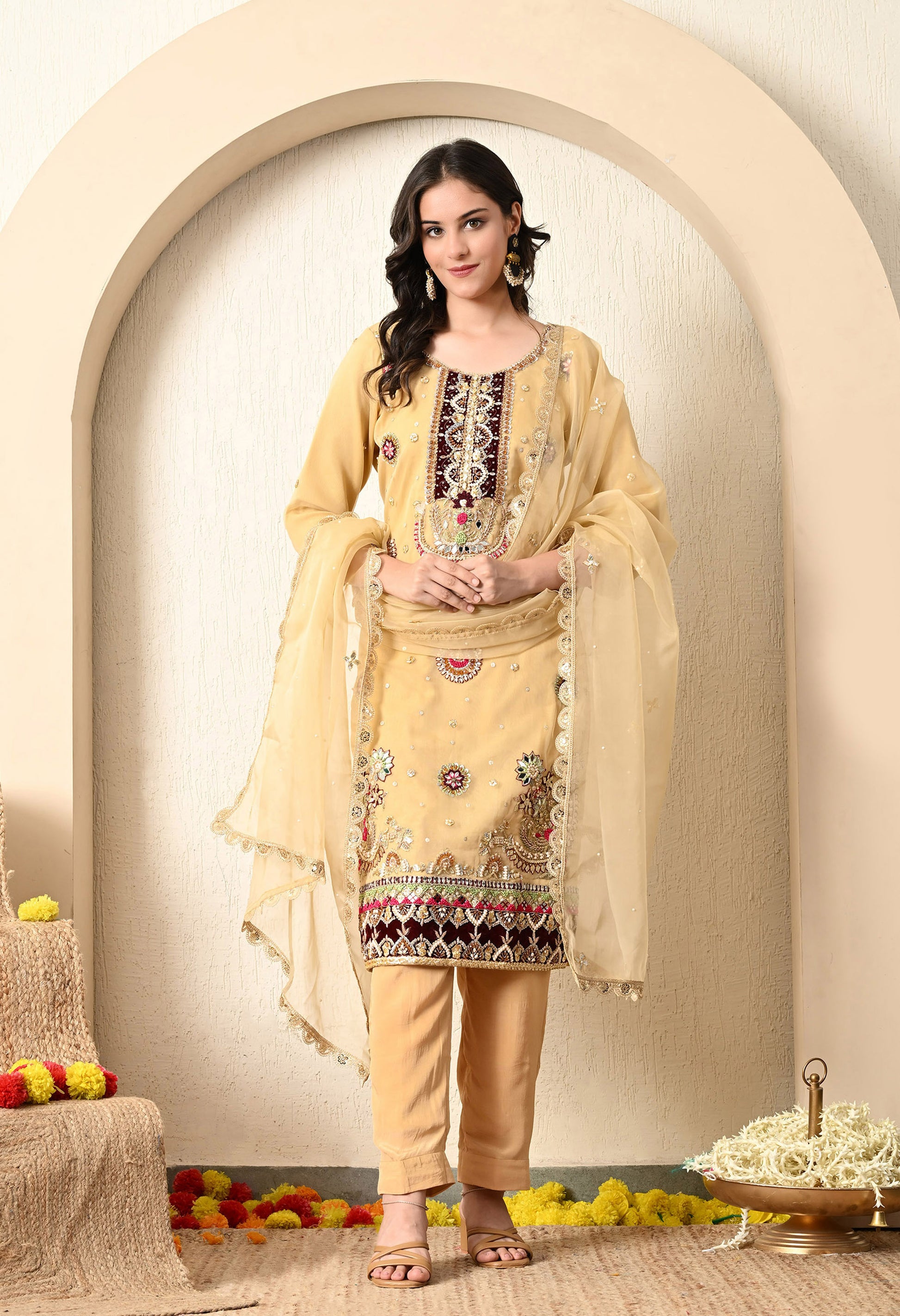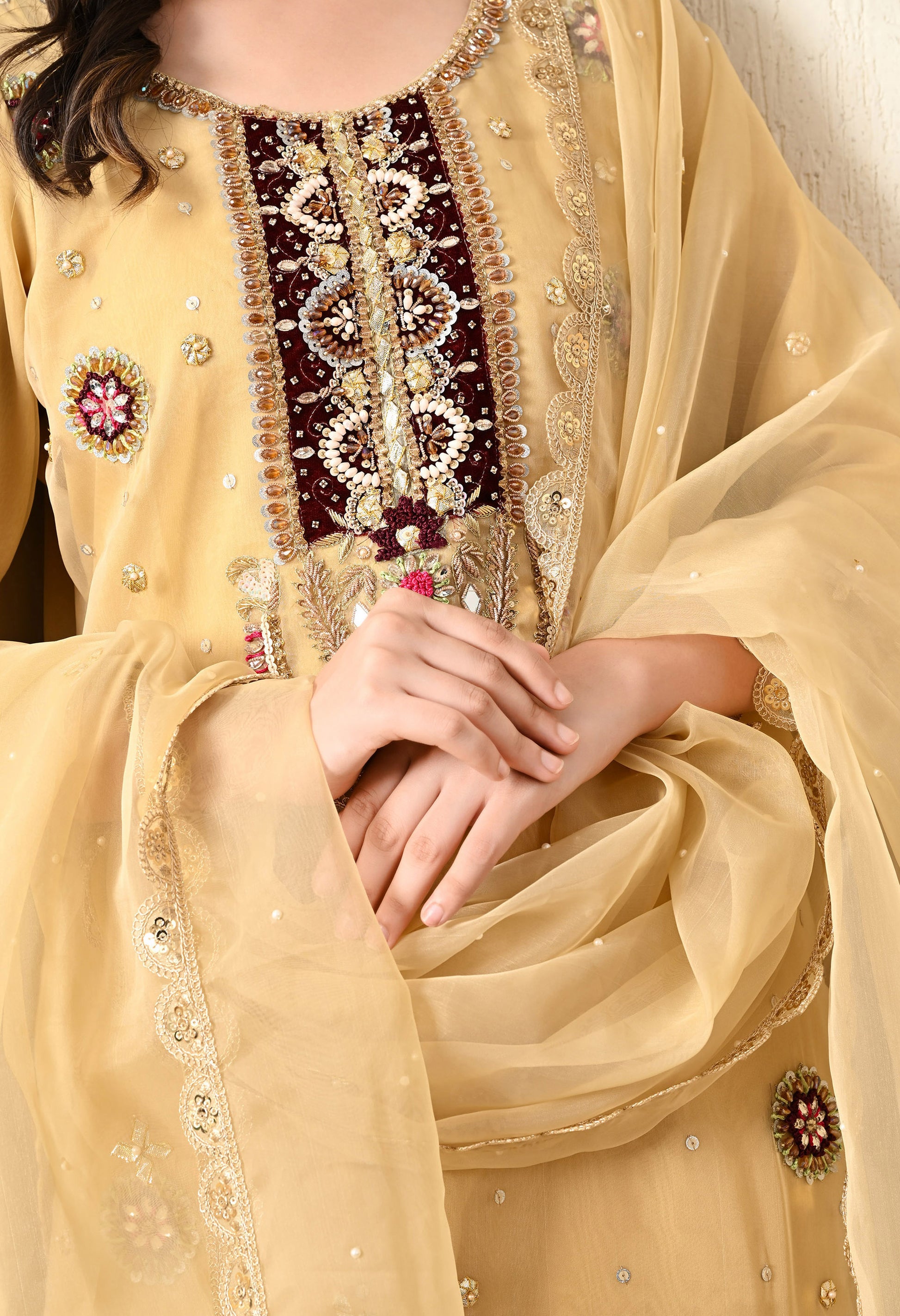 This kurta set is a testament to the rich heritage of Indian craftsmanship, offering a harmonious blend of tradition and contemporary design. Crafted from the finest organza fabric, this kurta set exudes timeless sophistication. The kurta features intricate hand and machine embroidery in a captivating golden yellow hue, while the organza dupatta boasts delicate embellishments that complement the ensemble flawlessly.