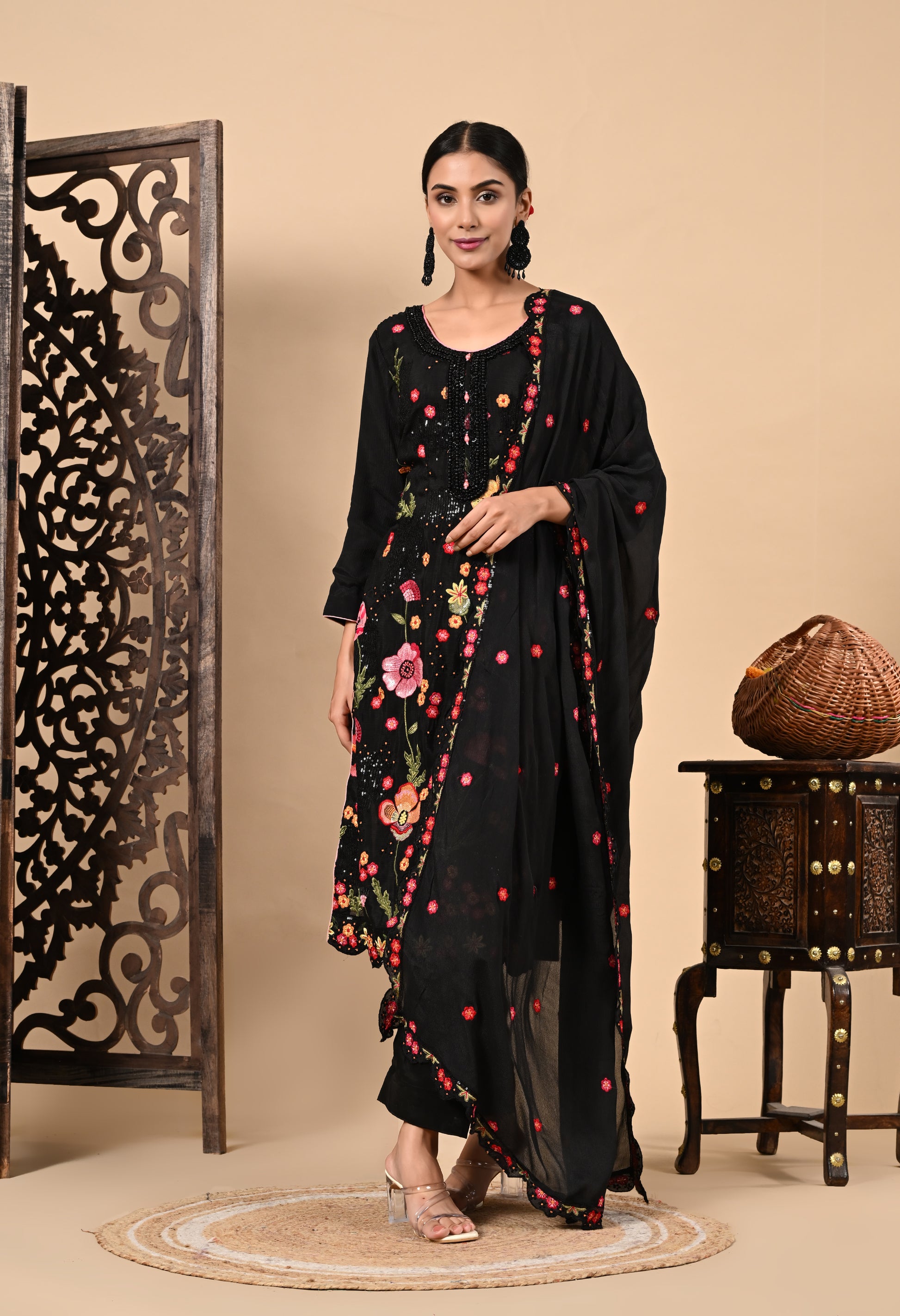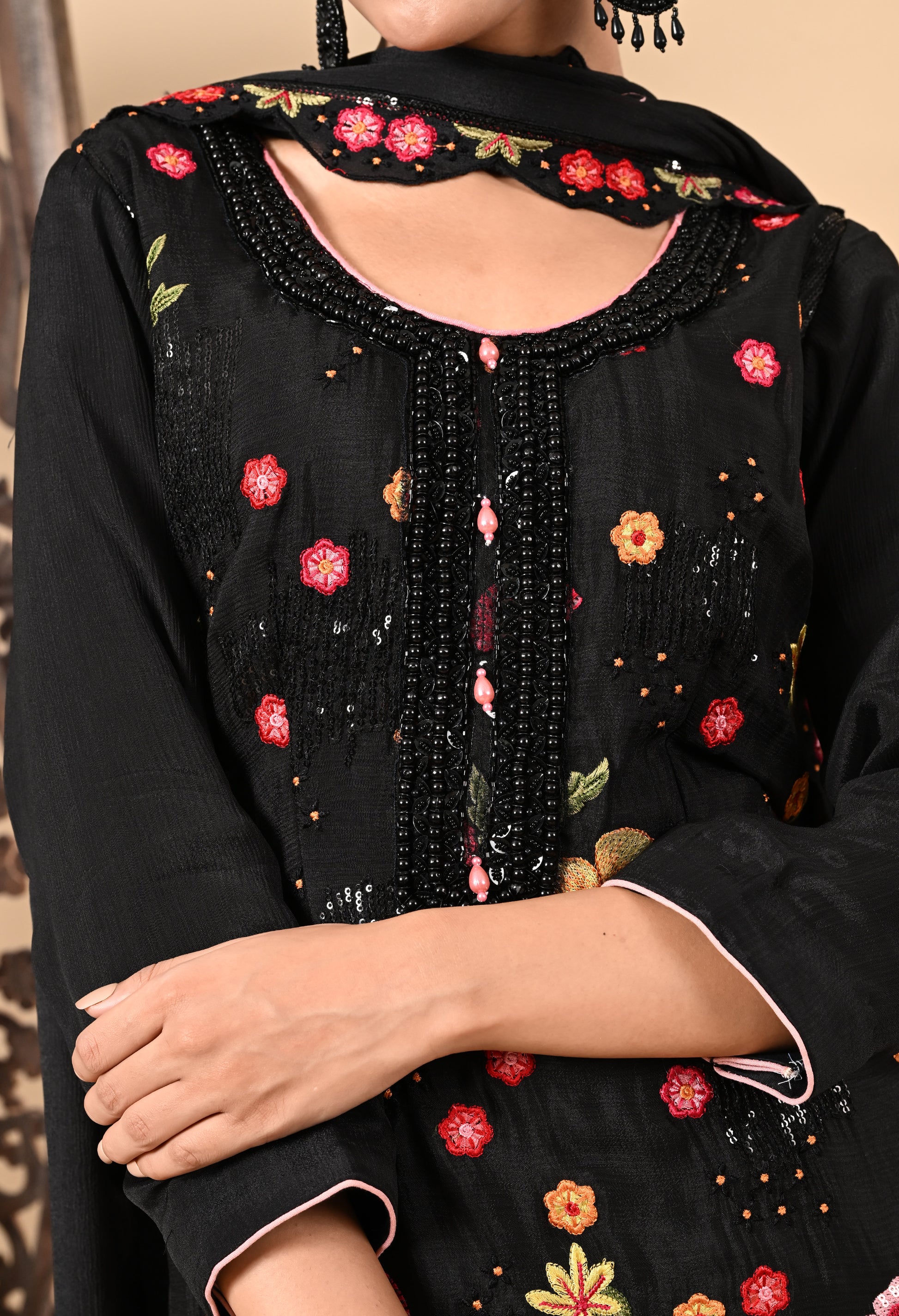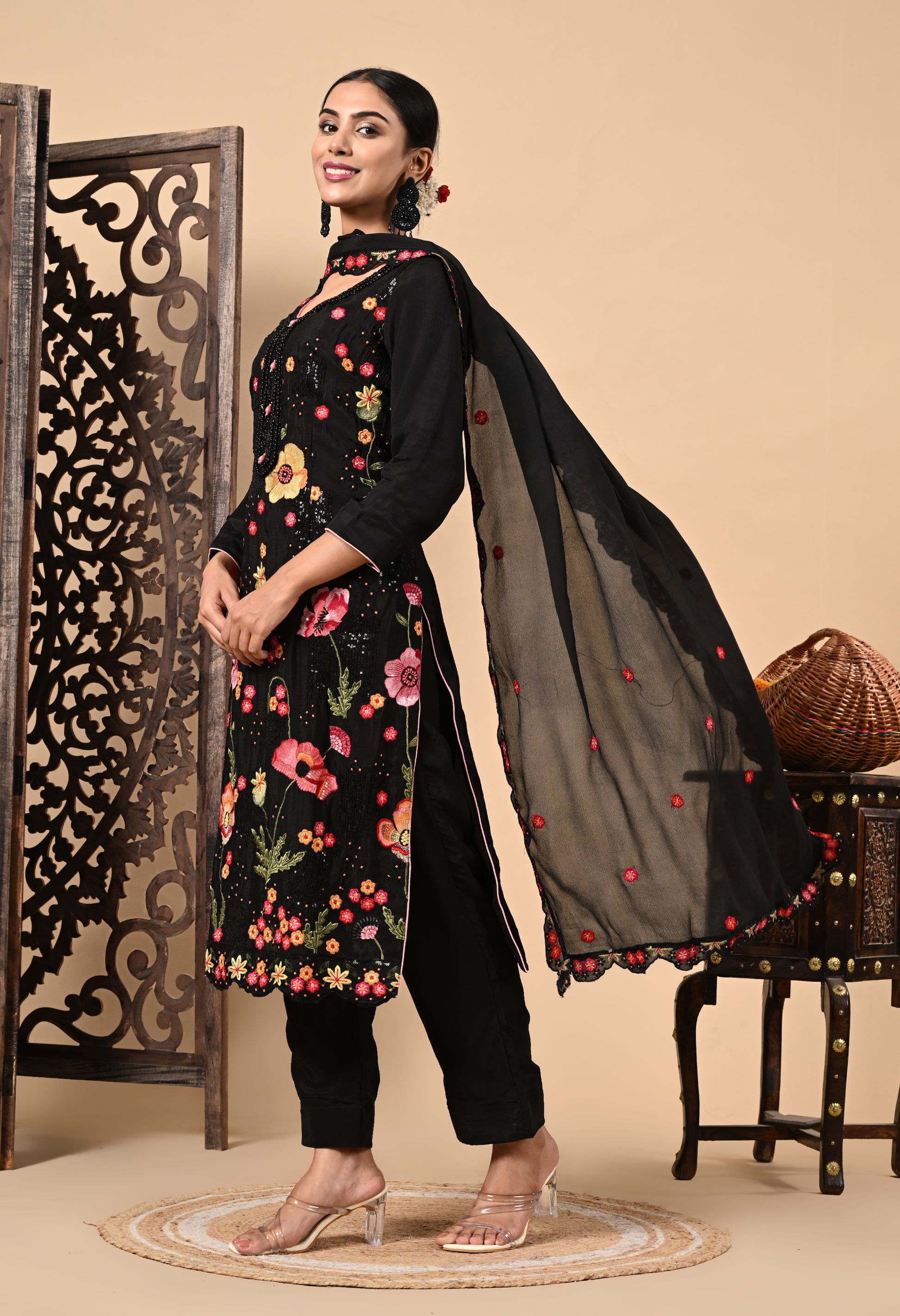 Revel in grace with our black Kurta Set, adorned with a soft georgette dupatta, an intricately detailed crepe kurta, and a matching crepe bottom. The detailed thread and sequin work highlight its ageless appeal. Perfect to add glam to your speacil occasions.