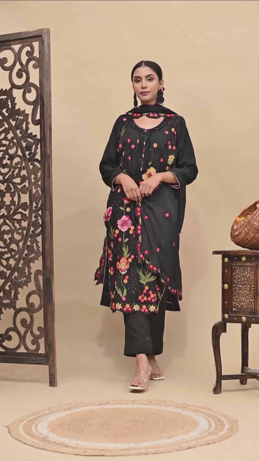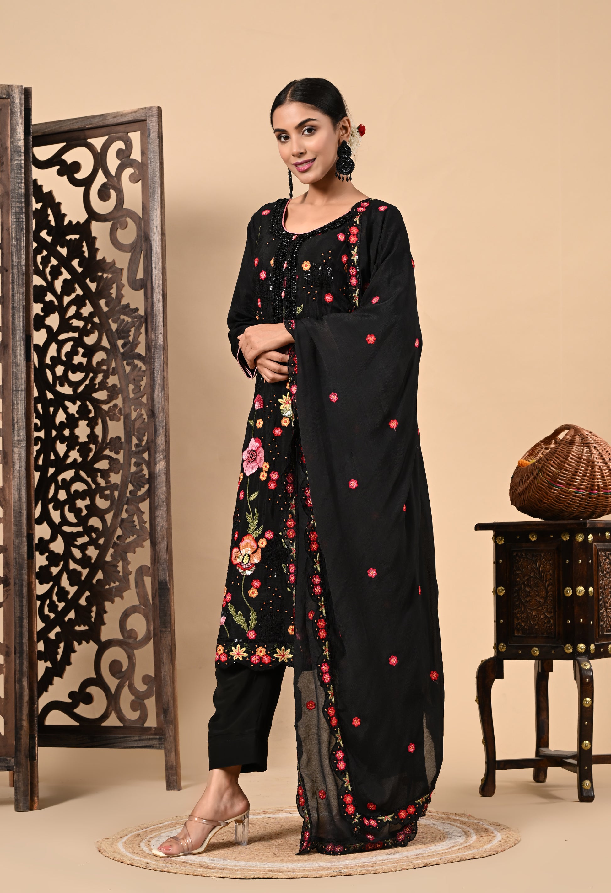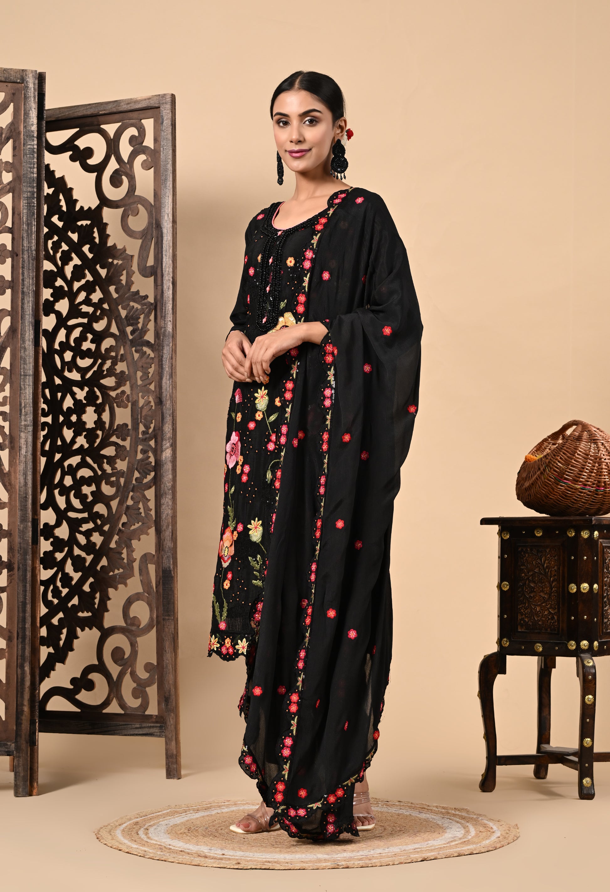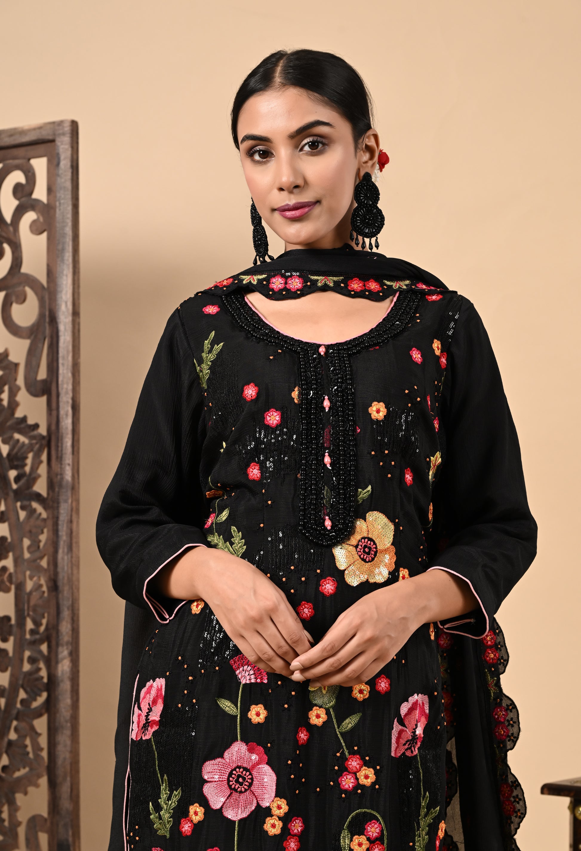 Revel in grace with our black Kurta Set, adorned with a soft georgette dupatta, an intricately detailed crepe kurta, and a matching crepe bottom. The detailed thread and sequin work highlight its ageless appeal. Perfect to add glam to your speacil occasions.
